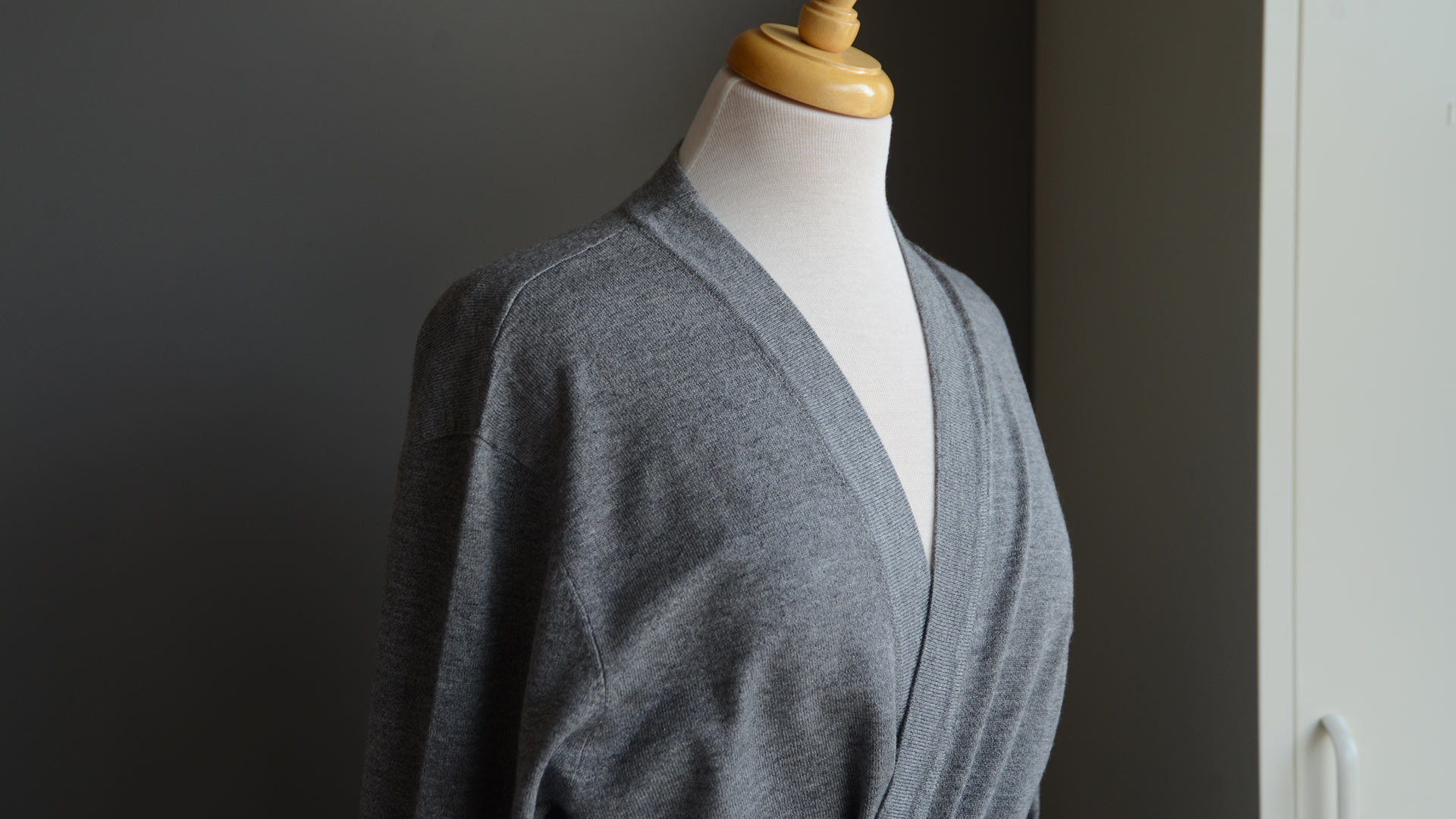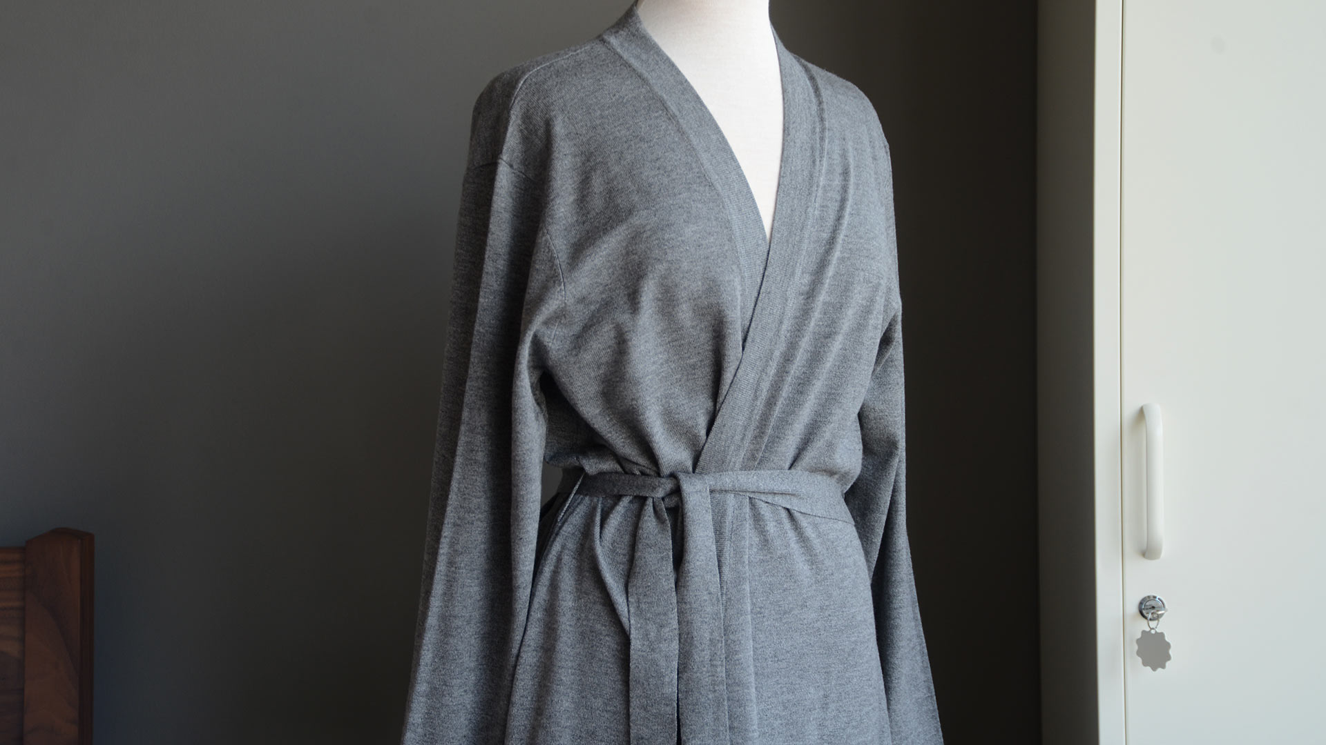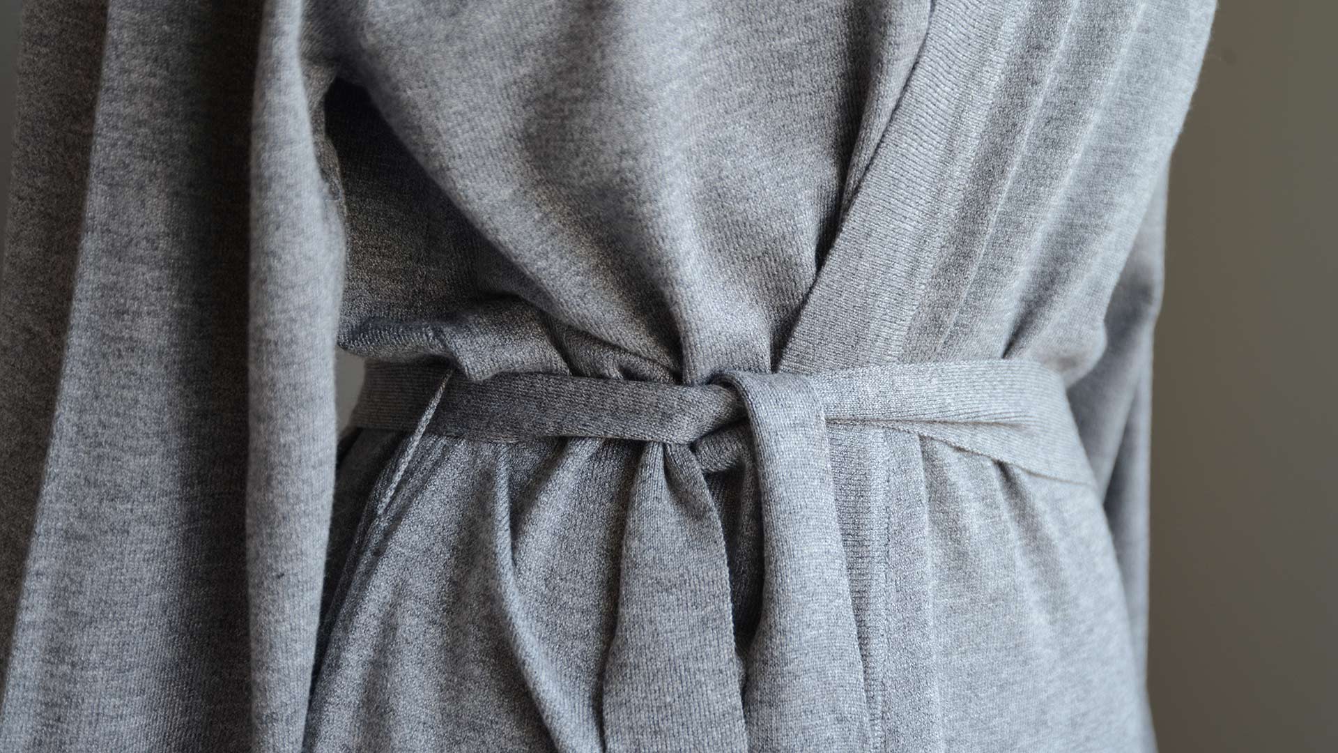 Stylish and comfortable knitted robe in grey. Can be used as a long-length, belted cardigan or cosy dressing gown.