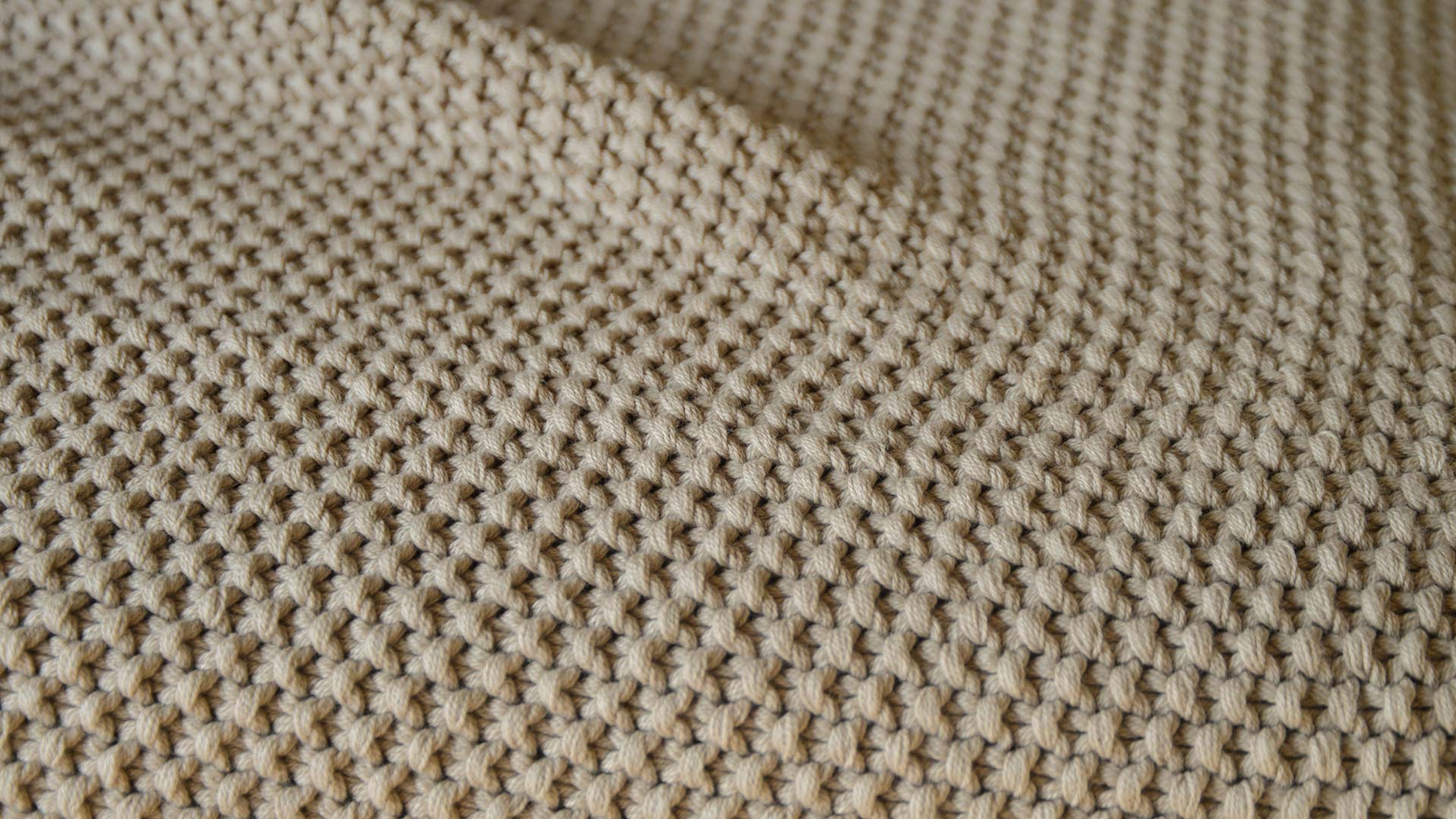 A textured, knitted throw in a plae taupe shade. A stylish blanket – perfect for in the lounge or over the end of your bed.