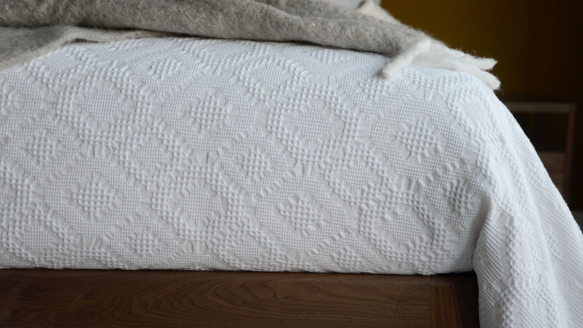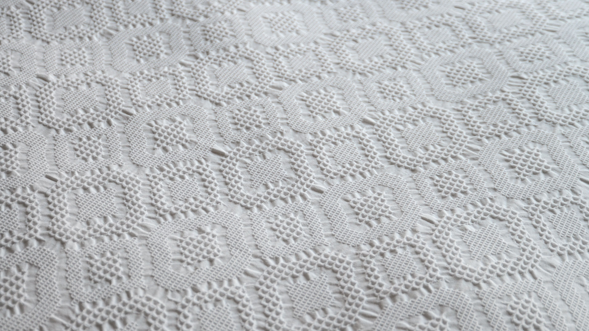 An elaborate lace textured duvet set in soft white cotton. A contemporary diamond design that compliments both traditional and modern interiors, perfect for creating that hotel feeling at home. This raised lace look patterned duvet set is made with a woven jacquard cotton fabric, backed with 300 thread count cotton percale; ideal for a dreamy night’s sleep.