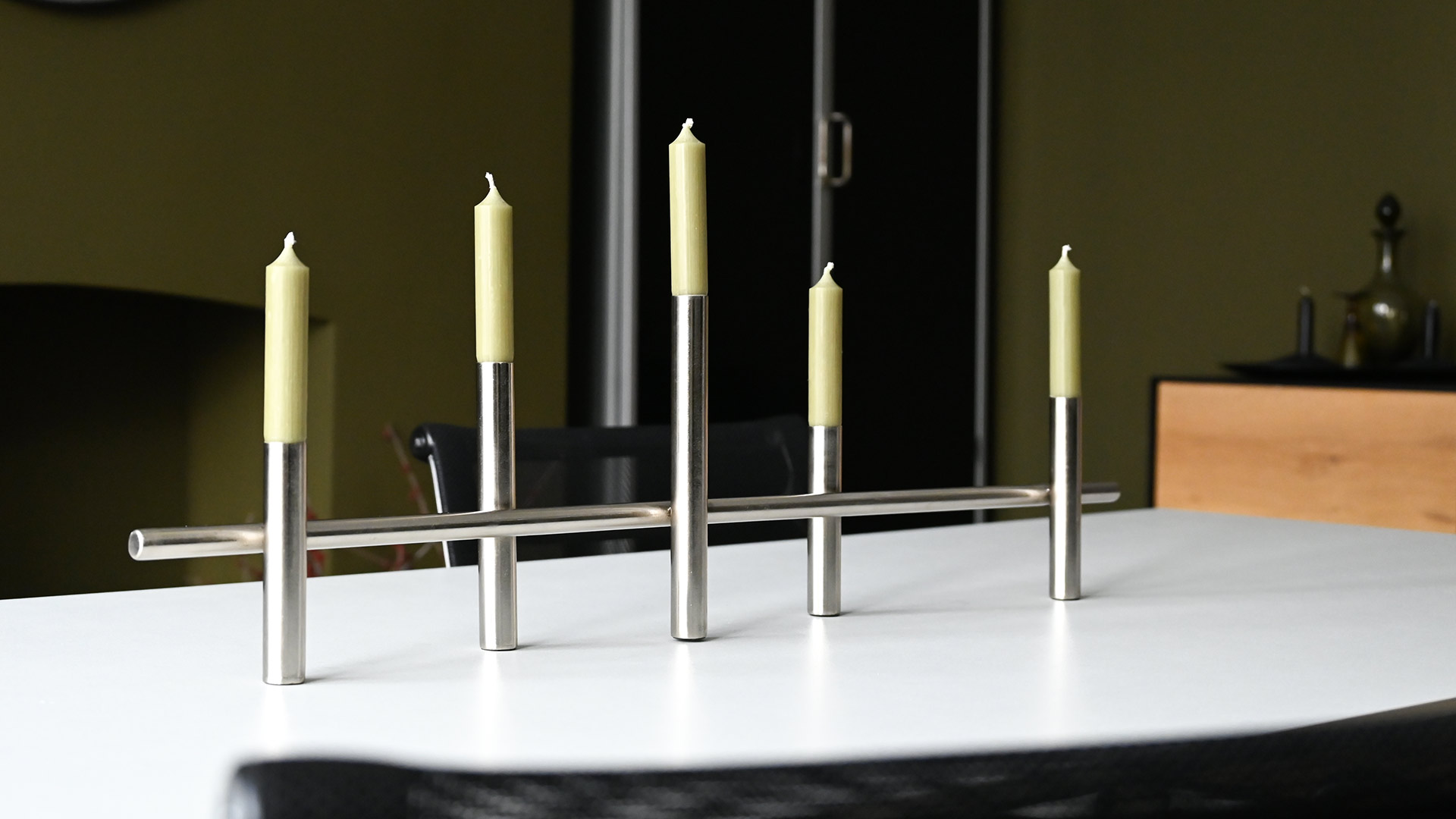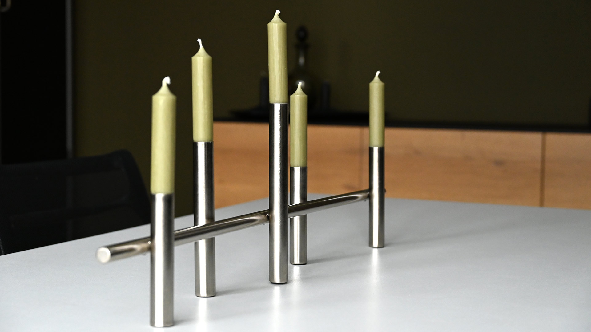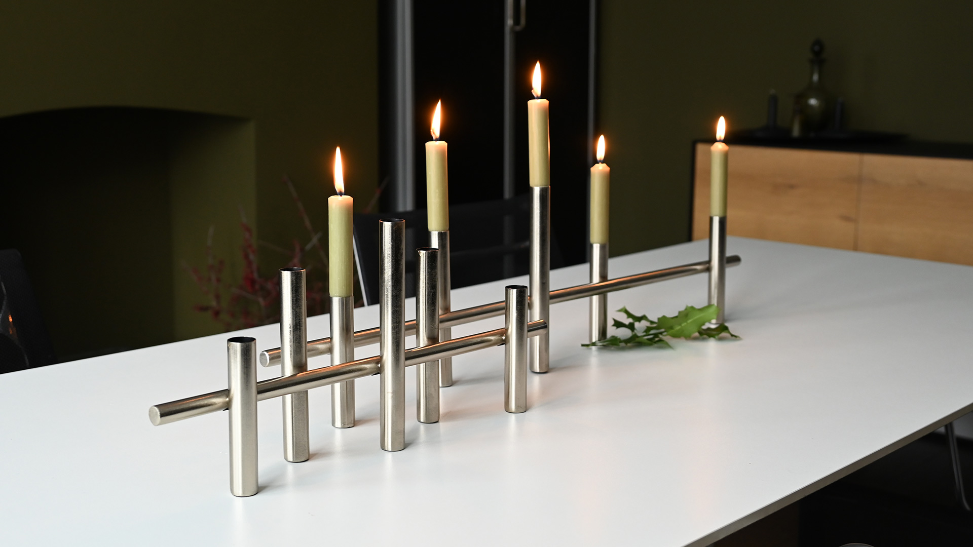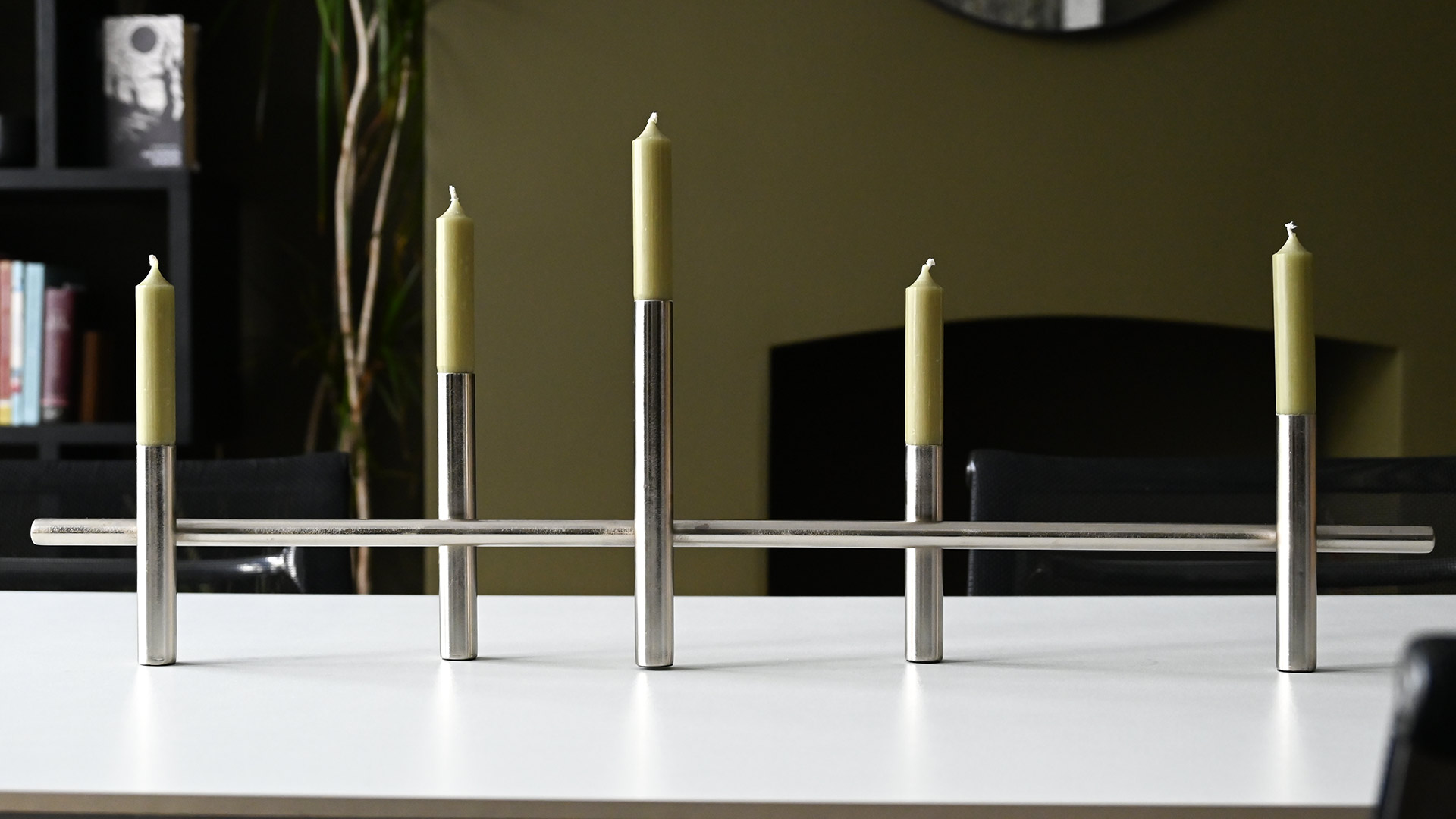 Modern, silver colour candelabras – available in two sizes. Each holds classic 5 dinner candles.