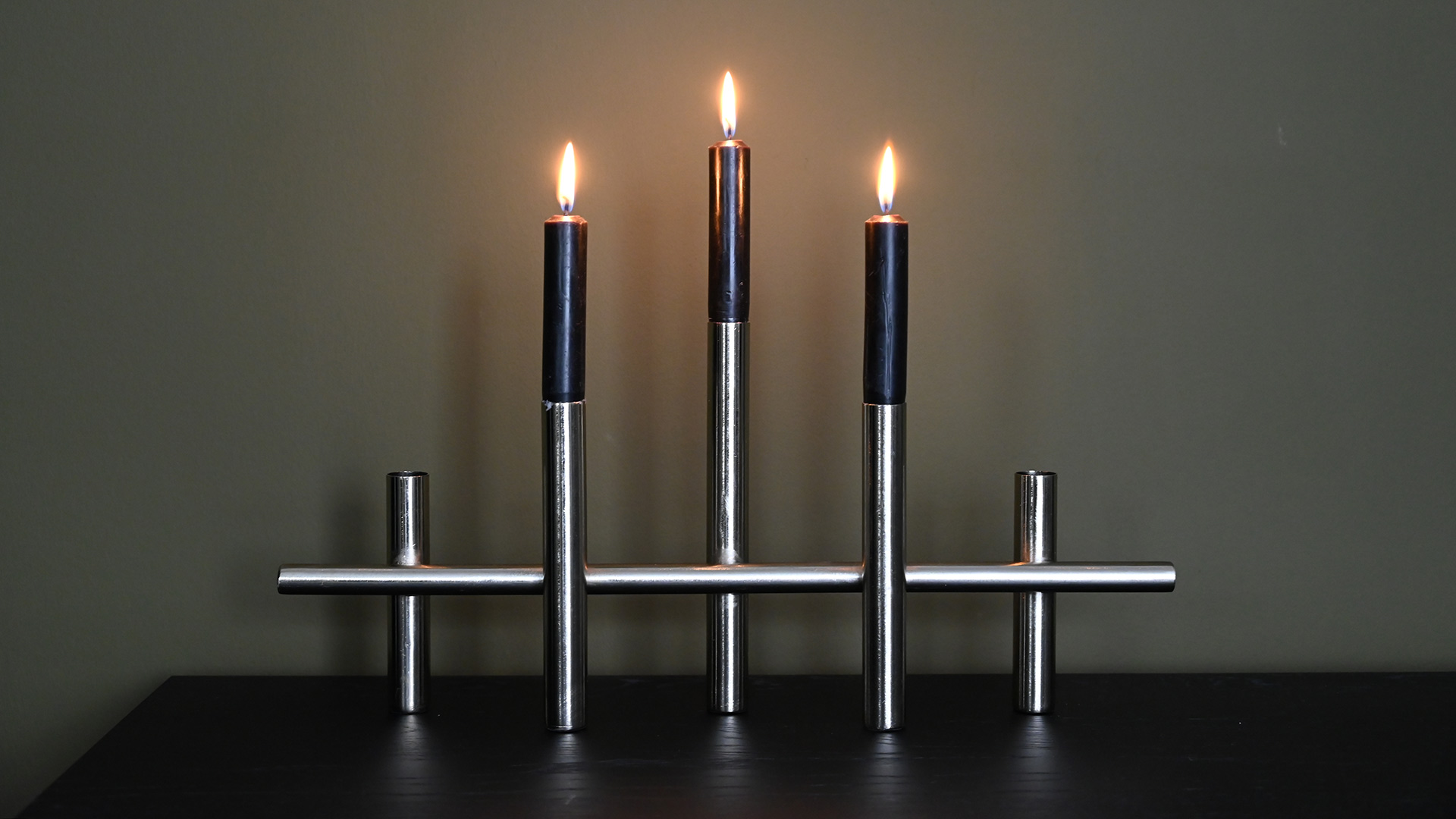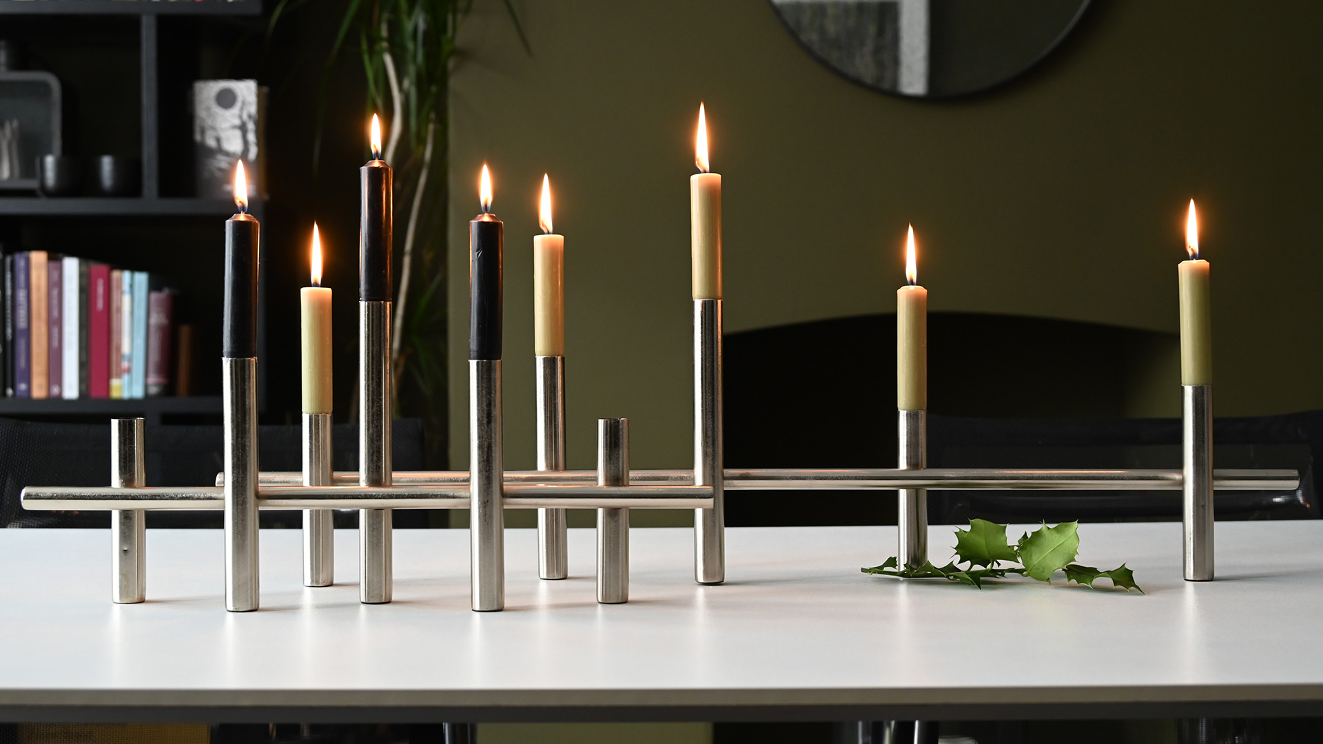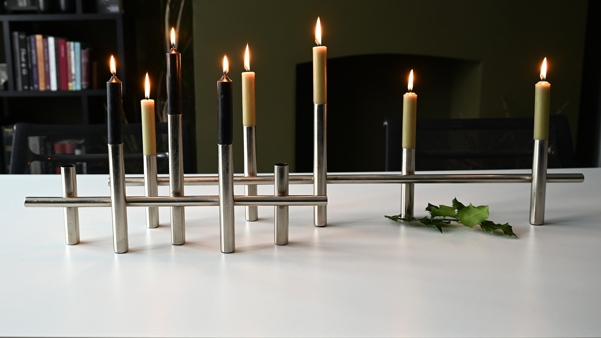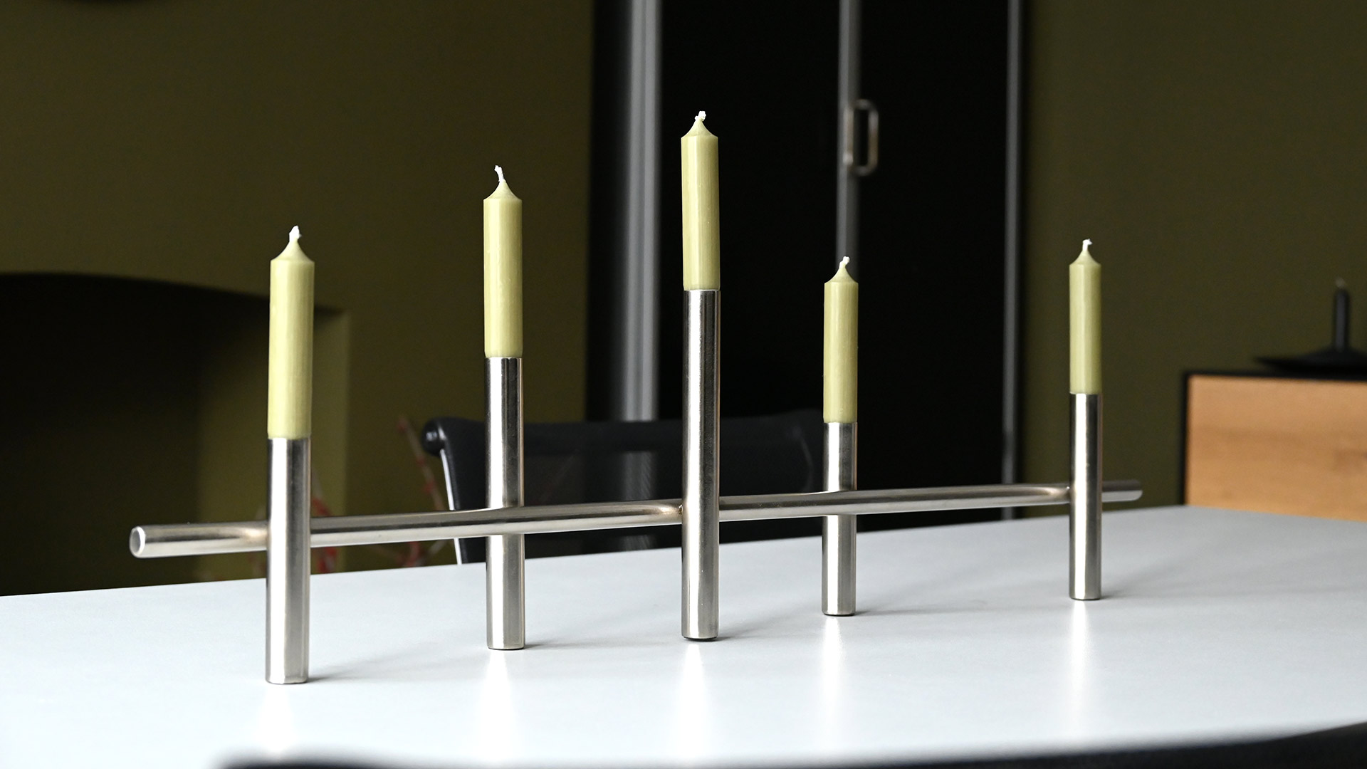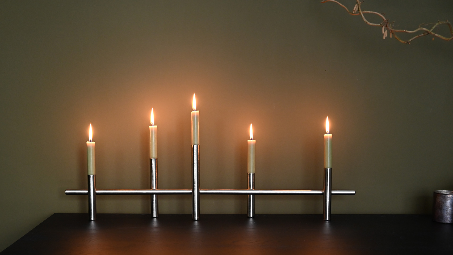 Modern, silver colour candelabras – available in two sizes. Each holds classic 5 dinner candles.