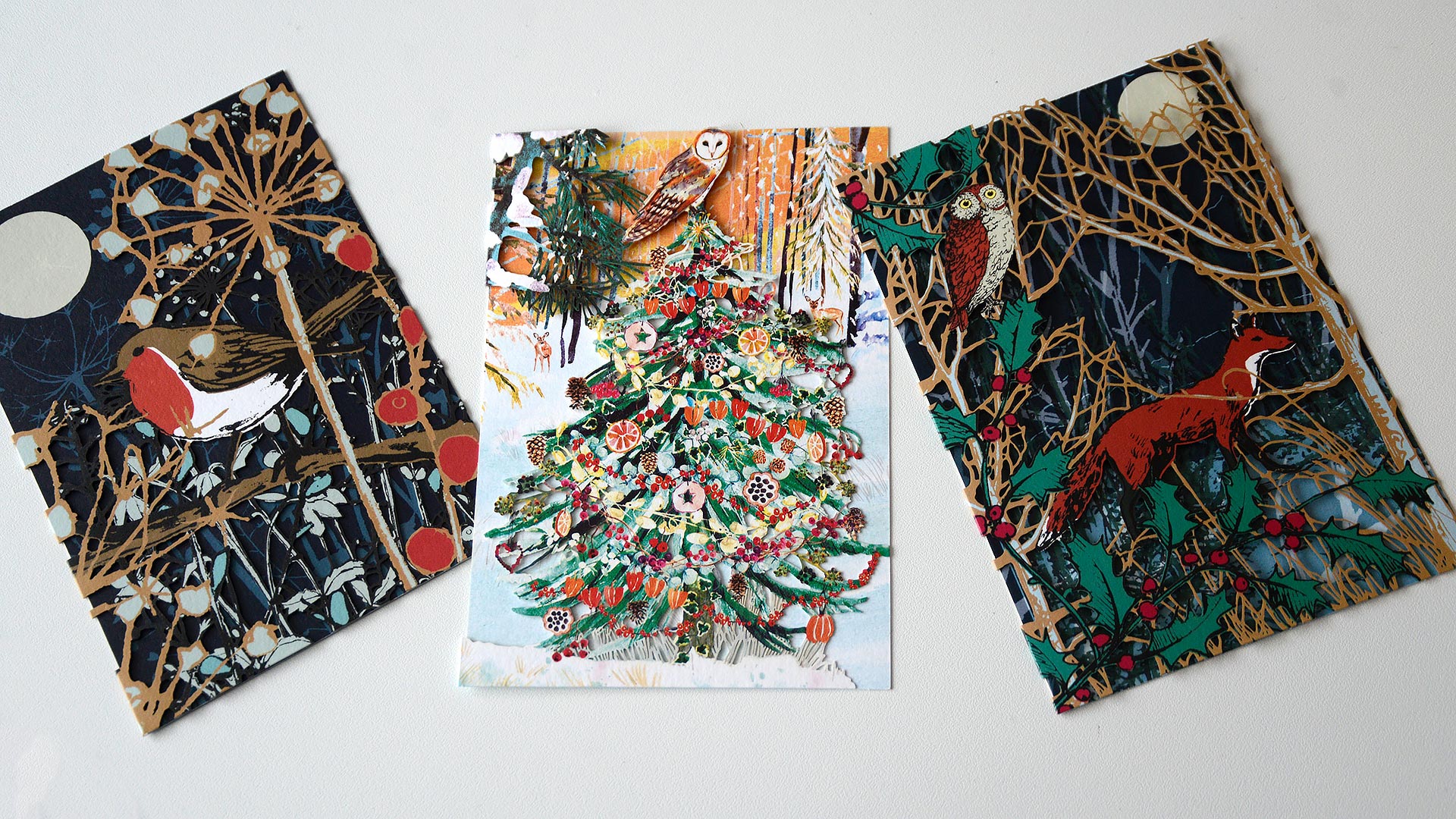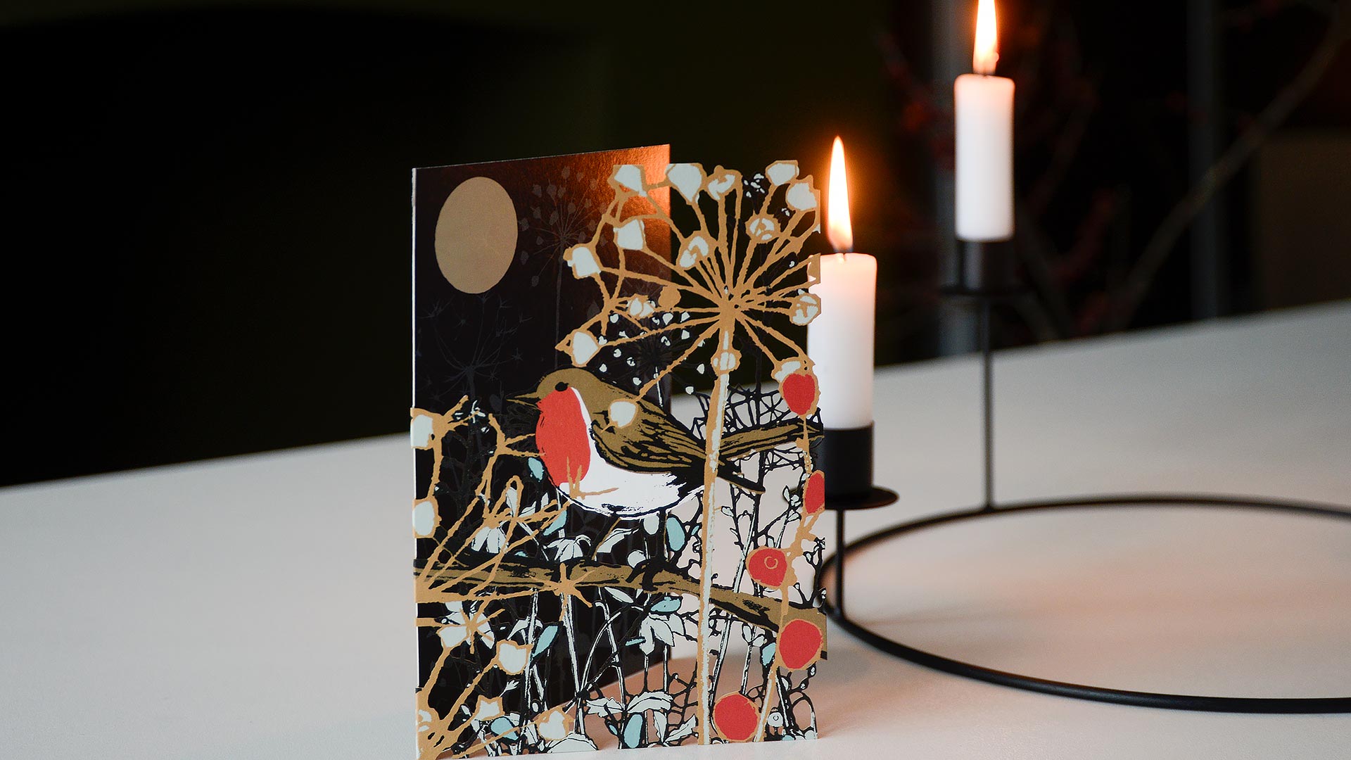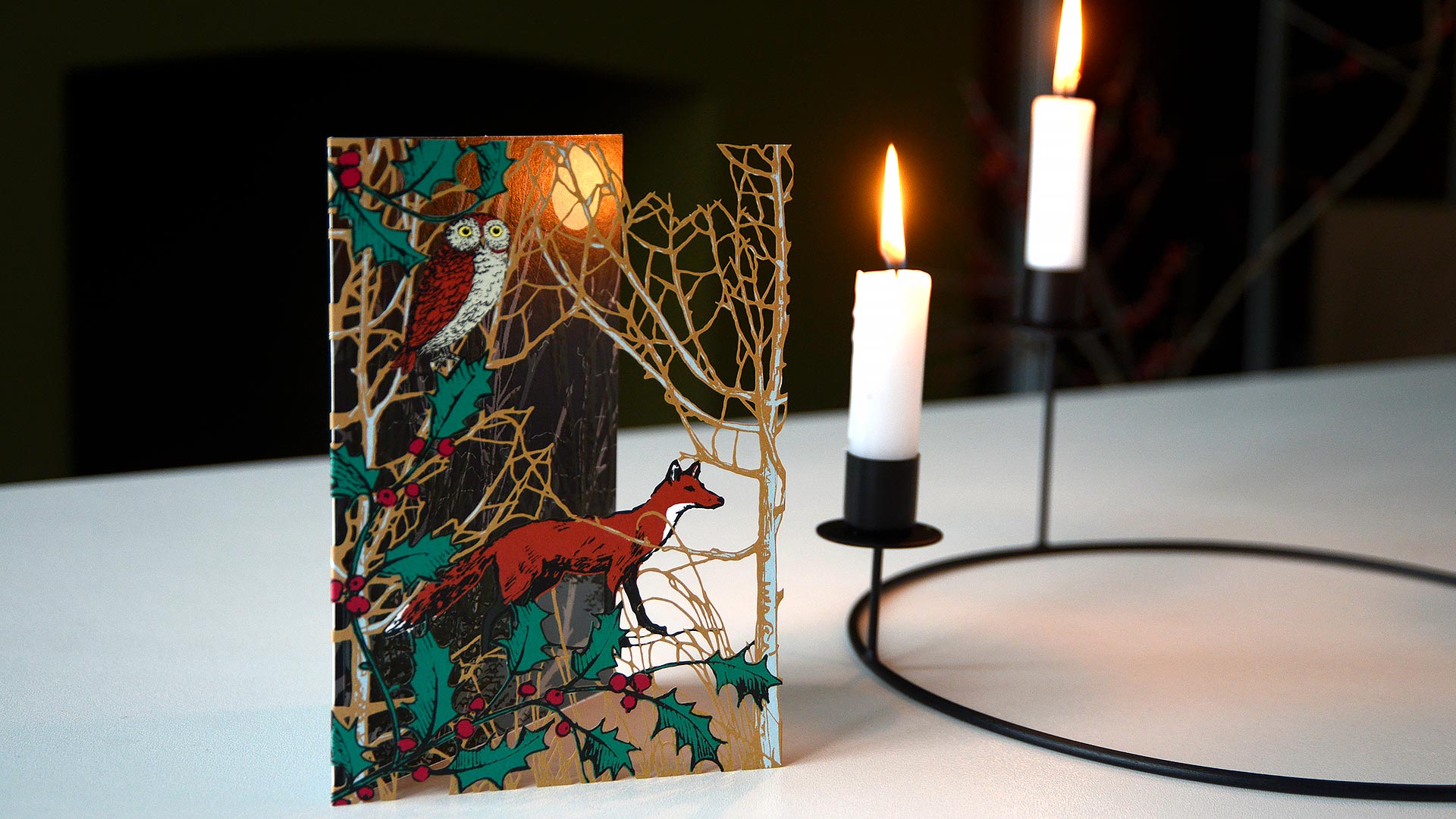 The Fox & The Owl: A beautiful illustration depicting an owl and a fox in a woodland setting surrounded by sprigs of holly. Artwork by MCS. Red Robin:Â A little robin sits atop a branch below a full moon. Artwork by MCS. Owl atop the Christmas Tree:Â A stunning illustration depicting a snowy owl sat atop a Christmas tree in a wintery forest. Artwork by Fay Ford.