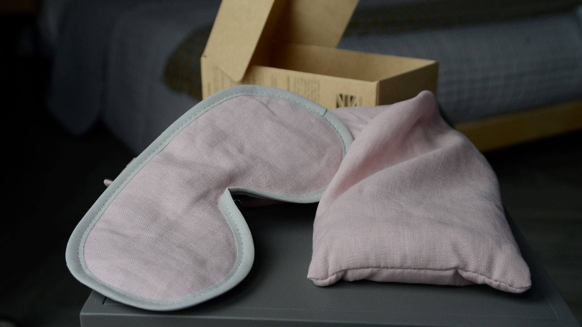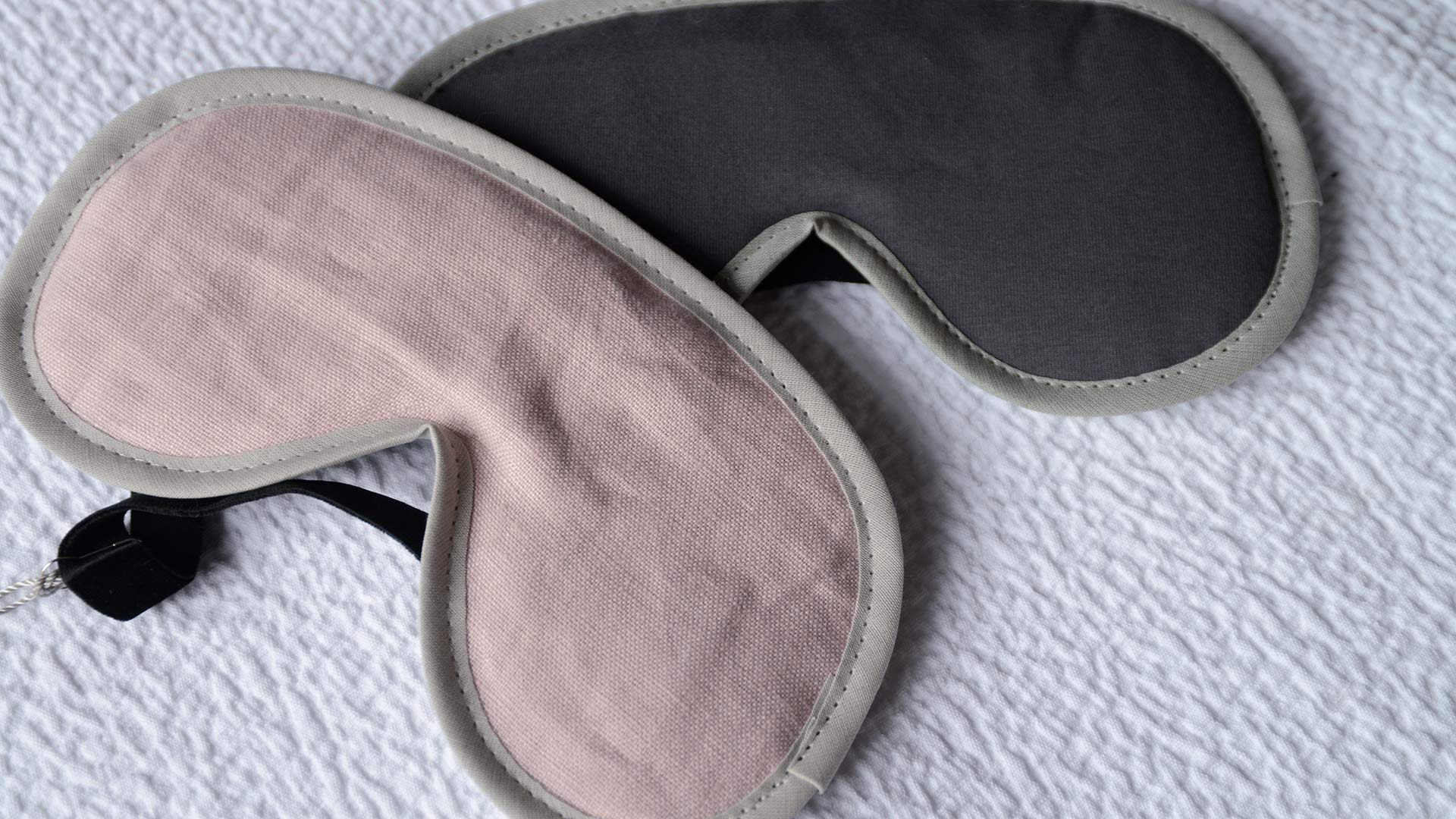 A soft fabric eye mask – in pink linen or dark grey jersey – filled with soothing lavender. A wonderful aid for a good nights sleep. (The reverse is in black, velvet feel fabric with an elasticated band to keep the mask in place).