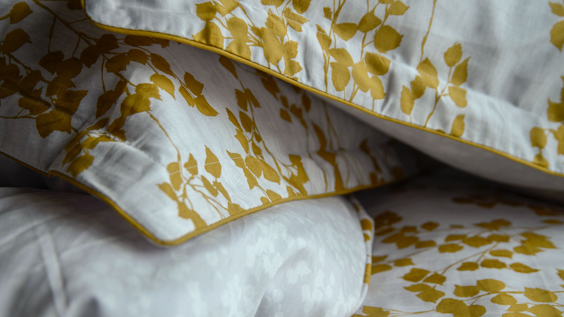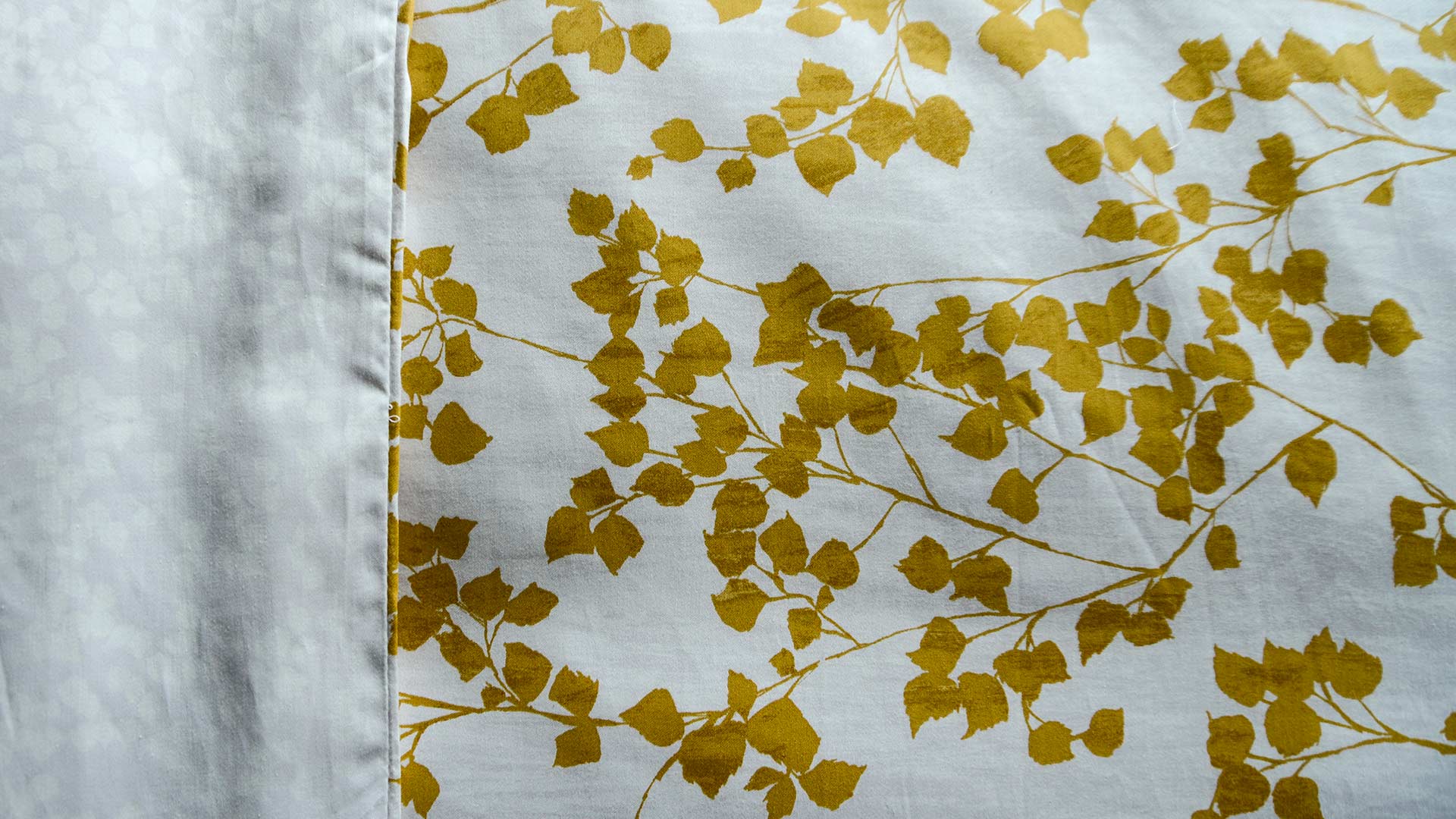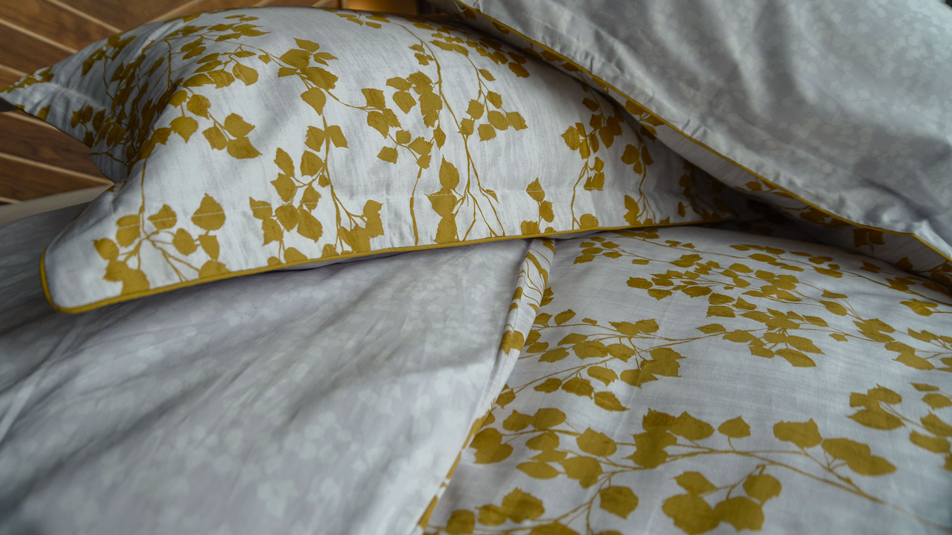 A reversible duvet set with a rich, mustard yellow leaf print. A beautiful, contemporary design. The set includes a duvet cover and pair of pillowcases. Available in double, king and super-king.