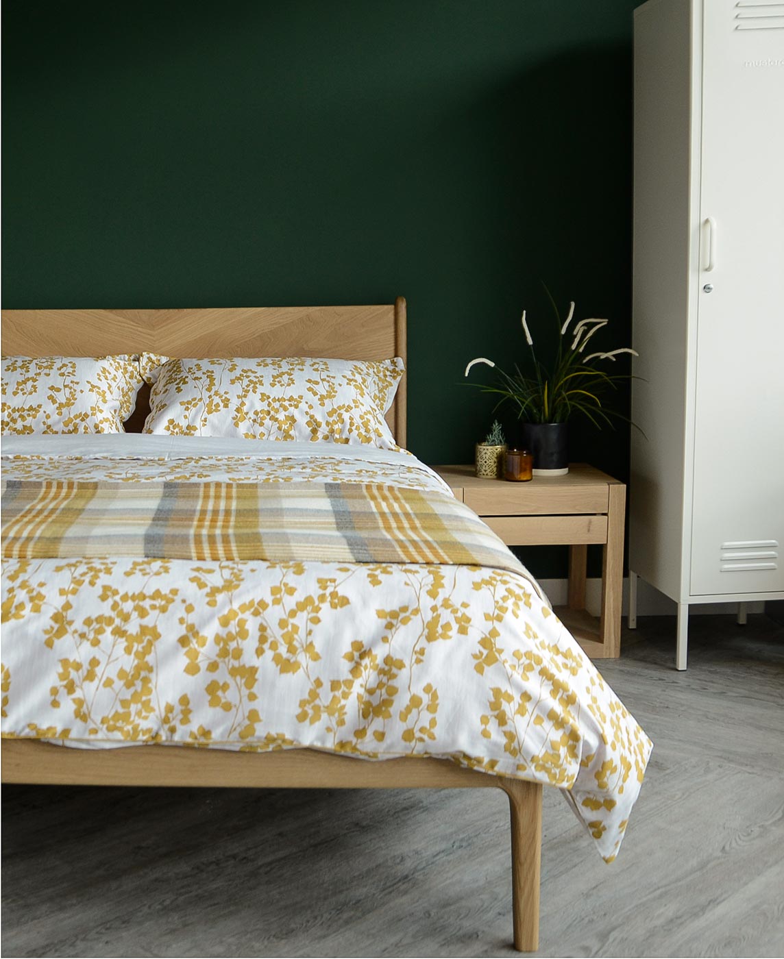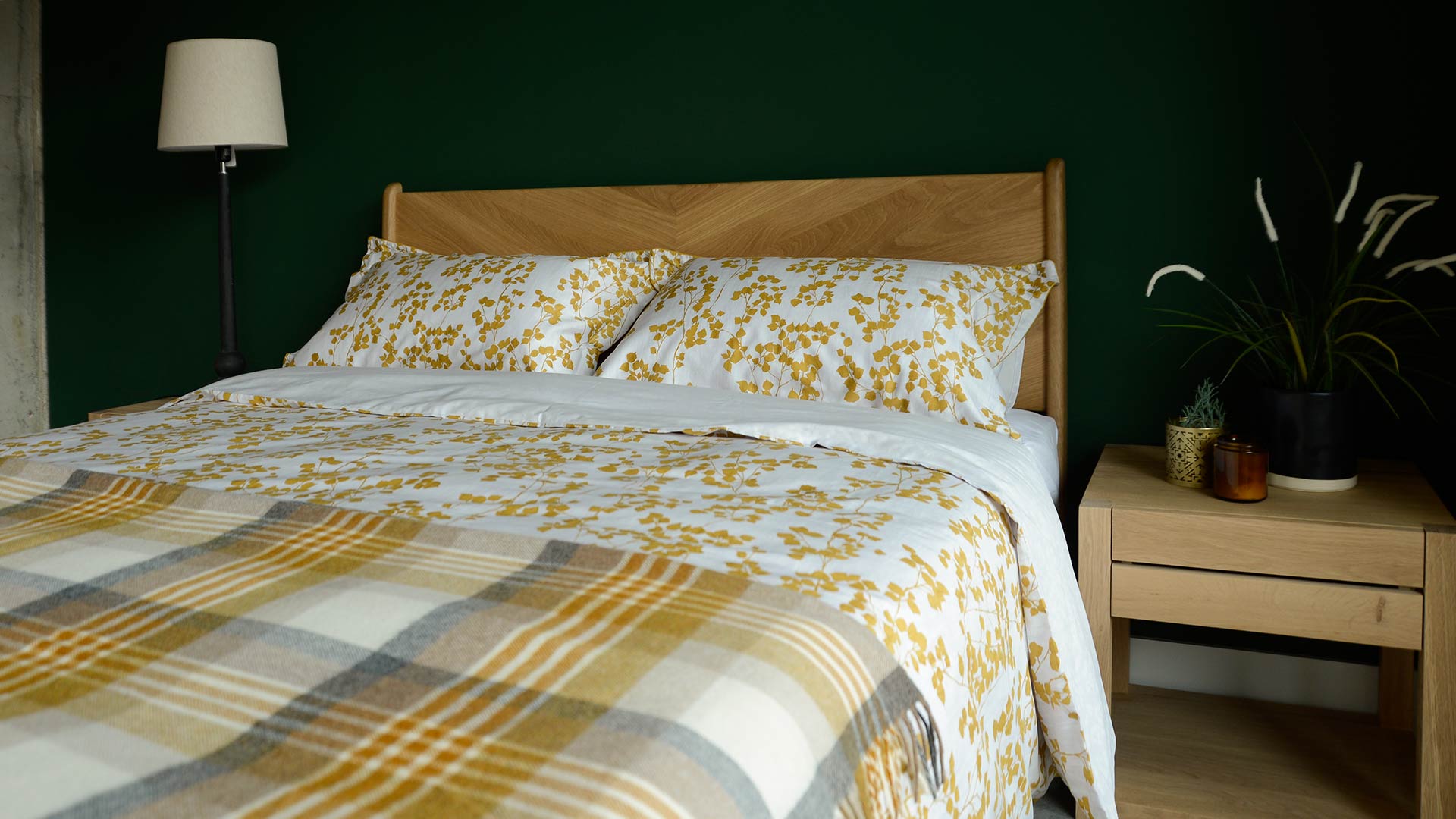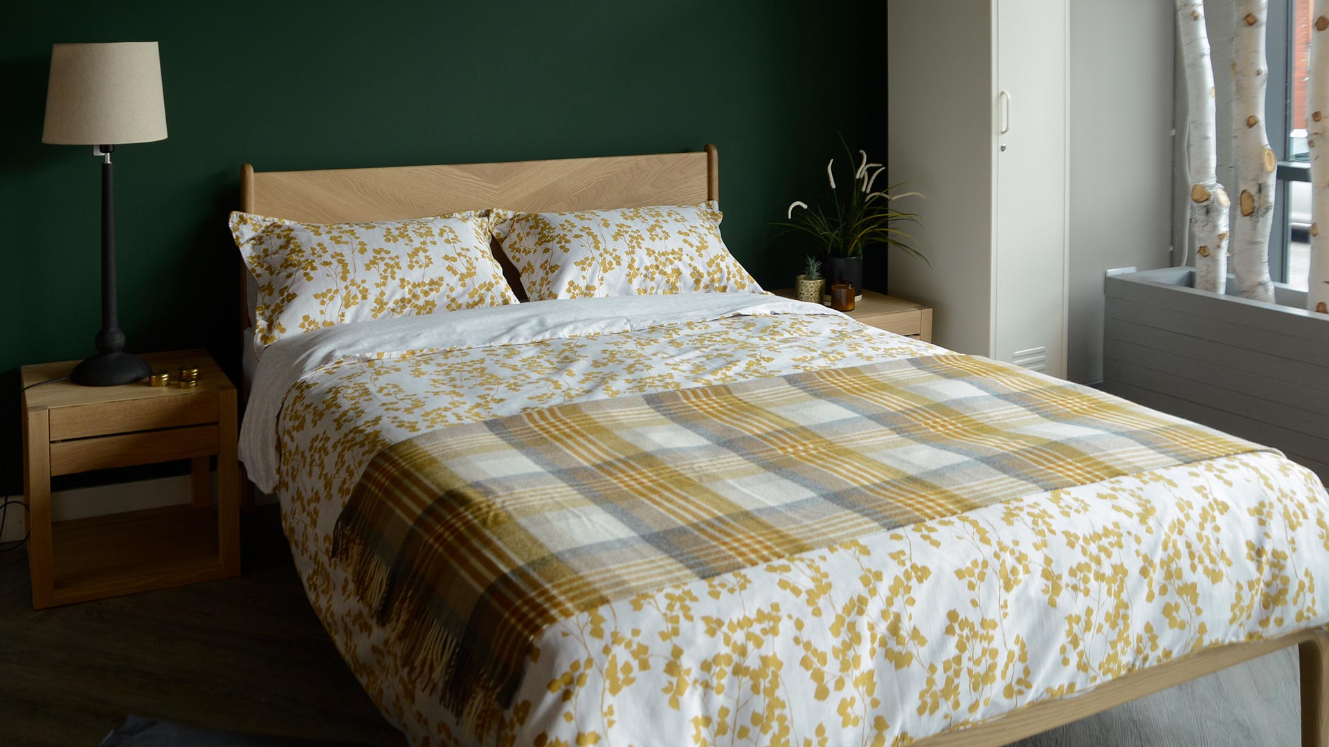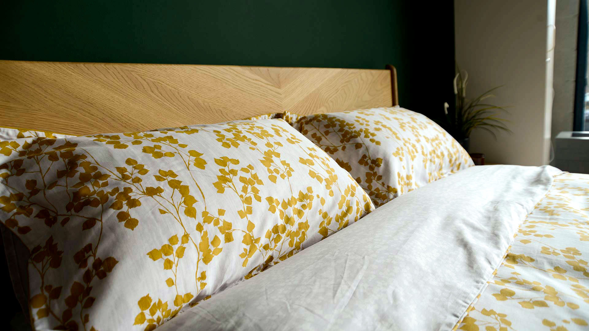A reversible duvet set with a rich, mustard yellow leaf print. A beautiful, contemporary design. The set includes a duvet cover and pair of pillowcases. Available in double, king and super-king.