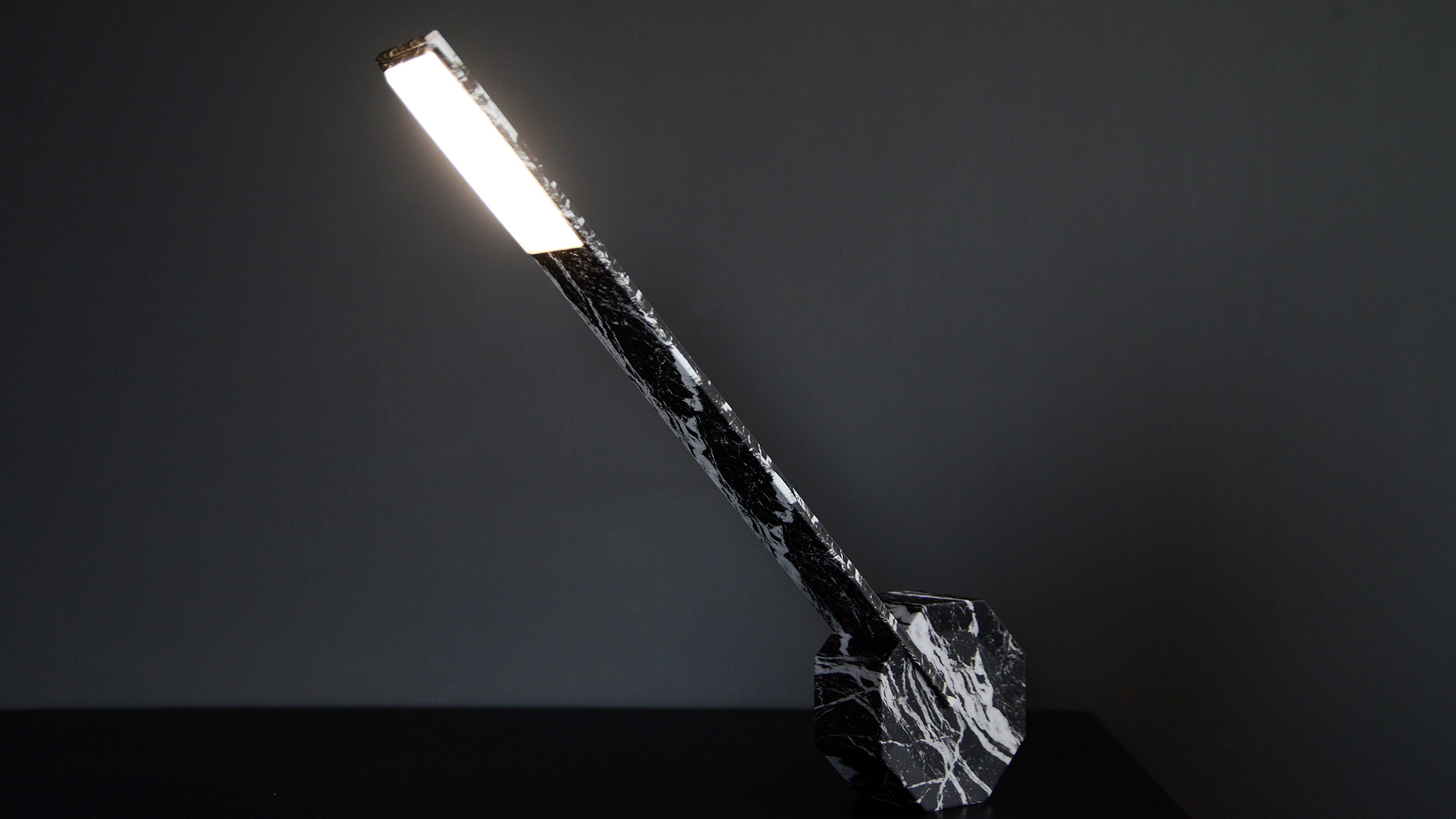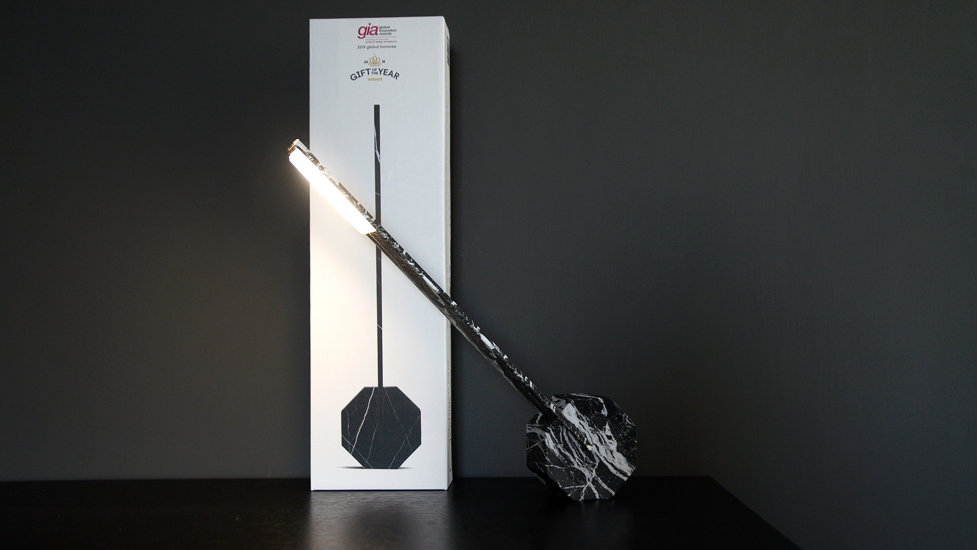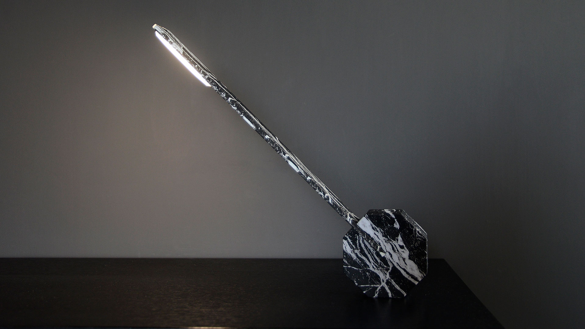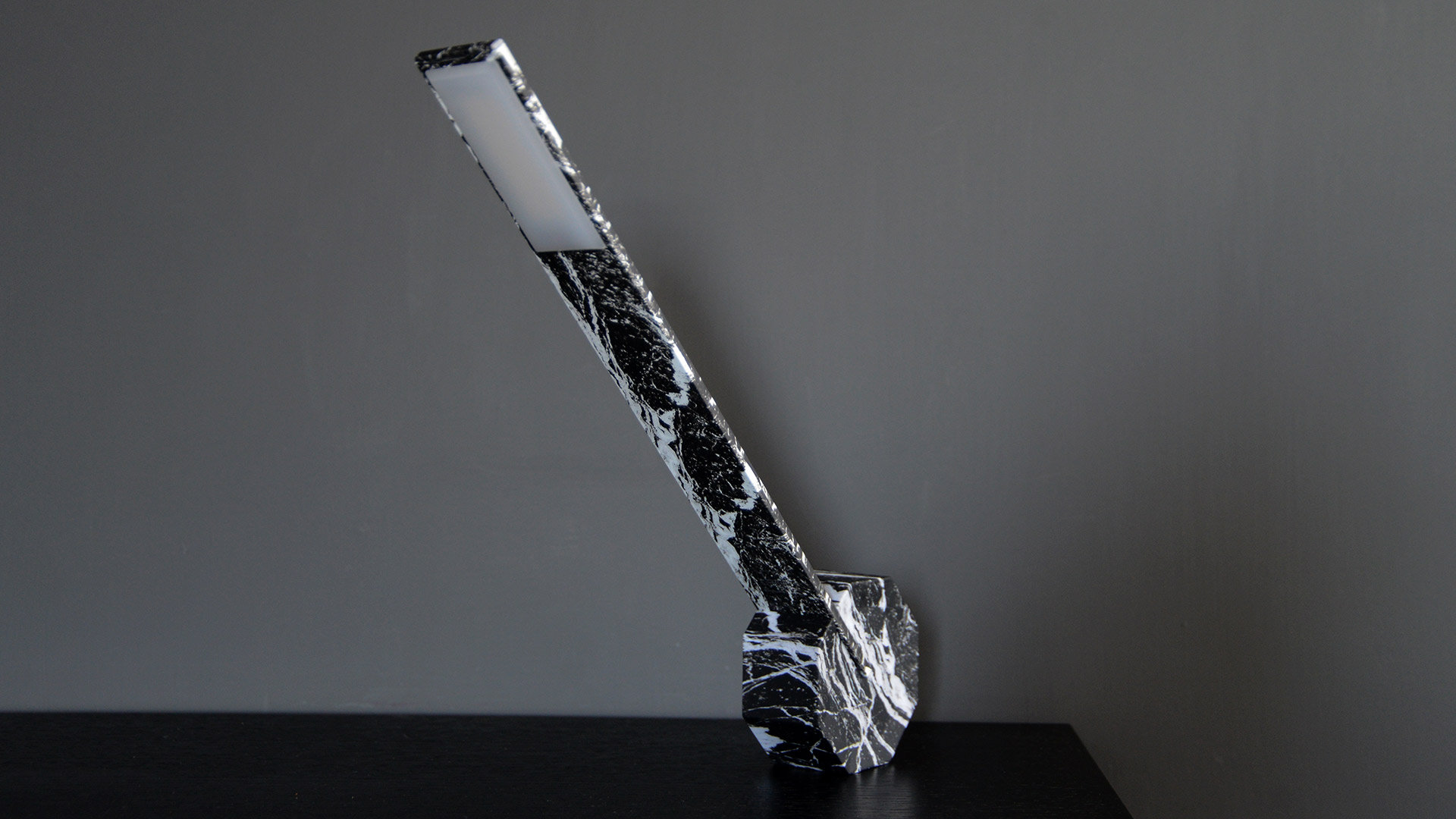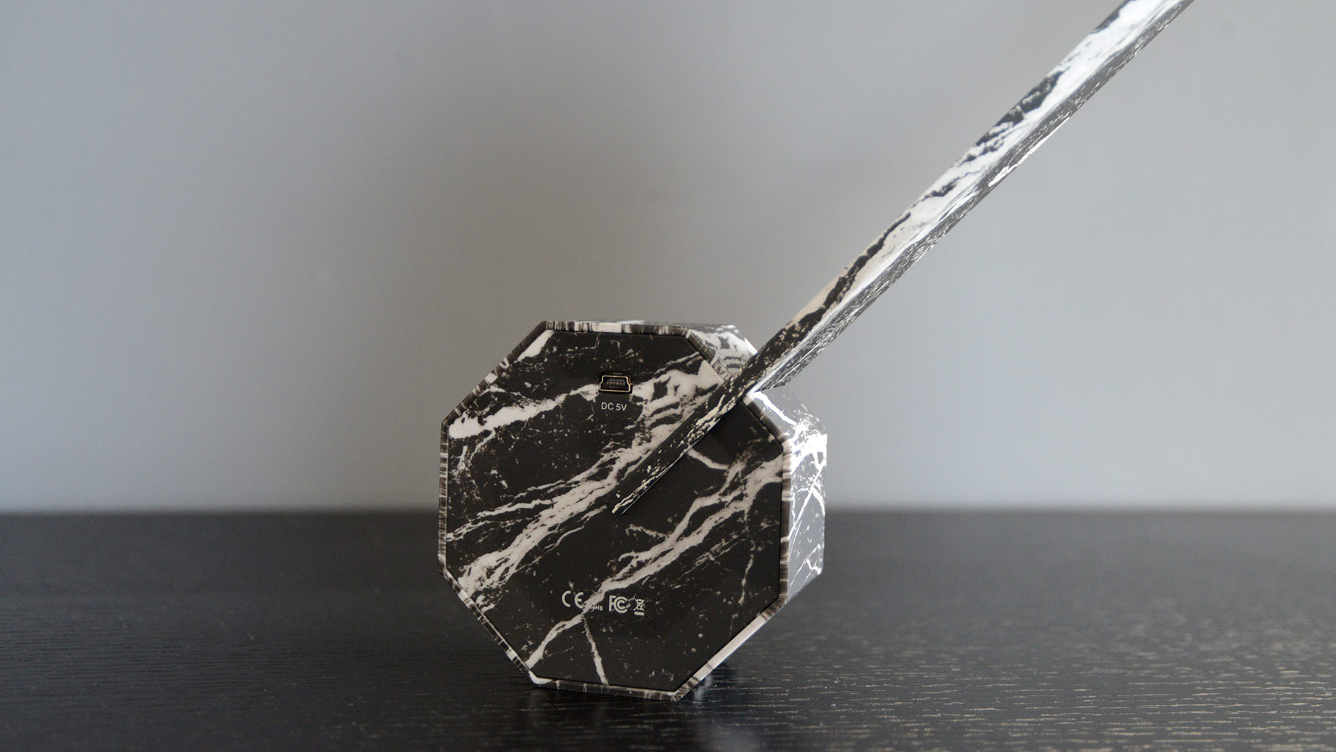 The Octagon is a rechargeable LED table lamp with a stunning black marbled look finish and a modern industrial aesthetic.