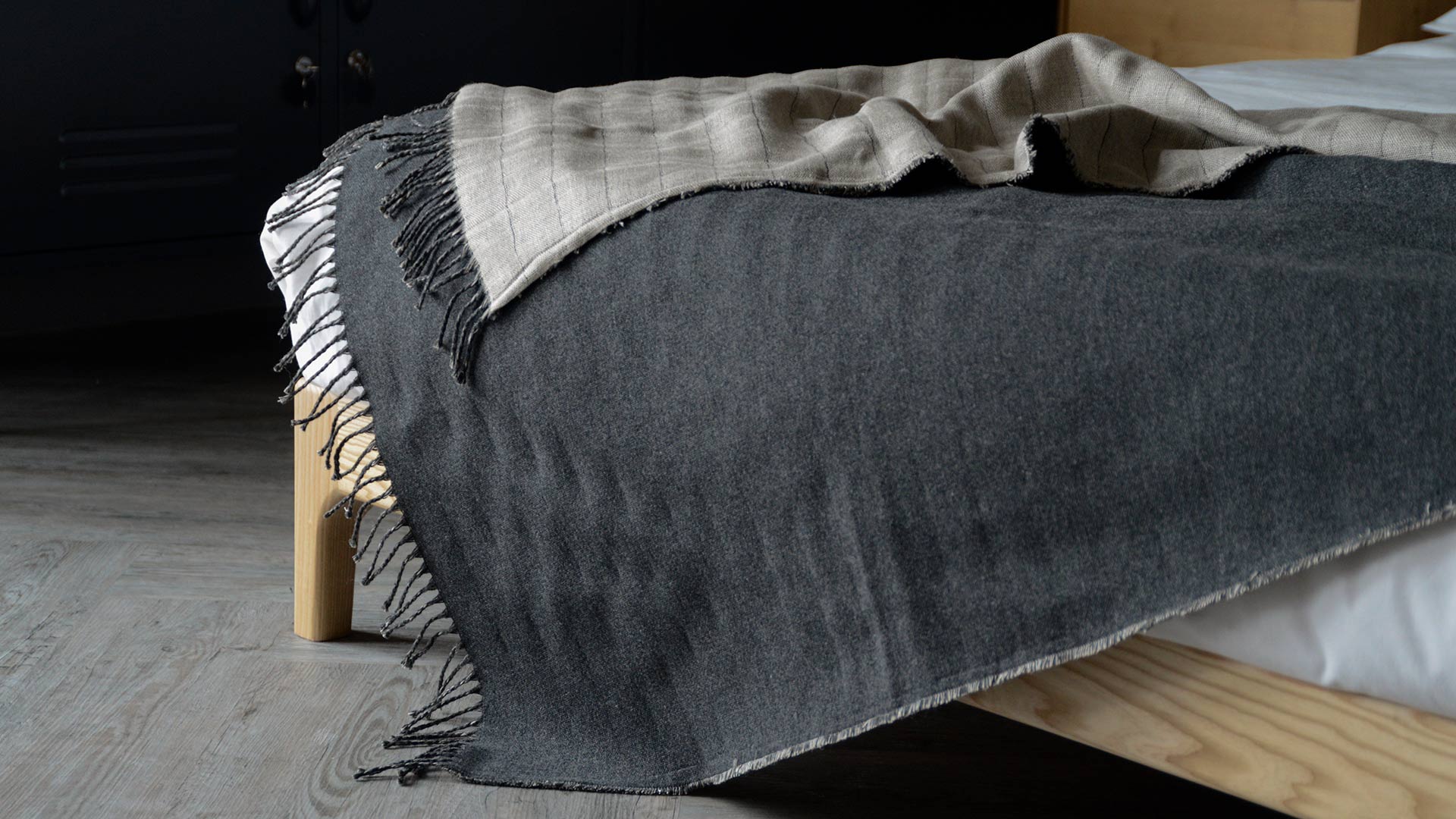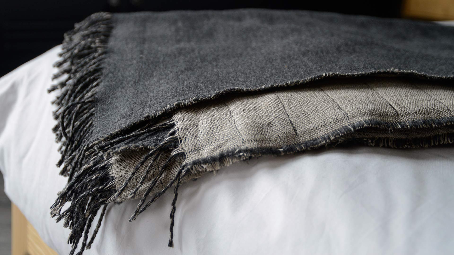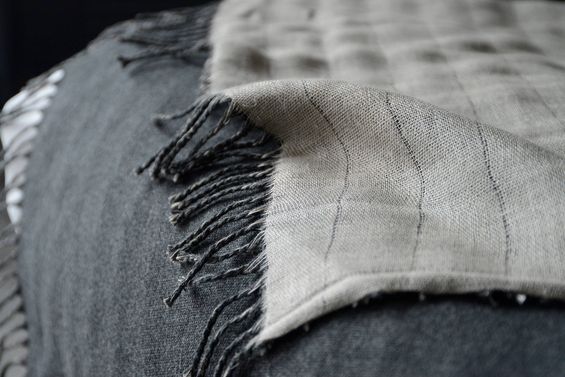Reversible throws in merino lambswool and linen. Available in two colourways: Mushroom: a mid, cool brown Merino lambswool. The linen reverse is in a natural, pale biscuit colour. Charcoal: a deep, grey marl Merino lambswool. The linen reverse is in a natural, pale biscuit colour.