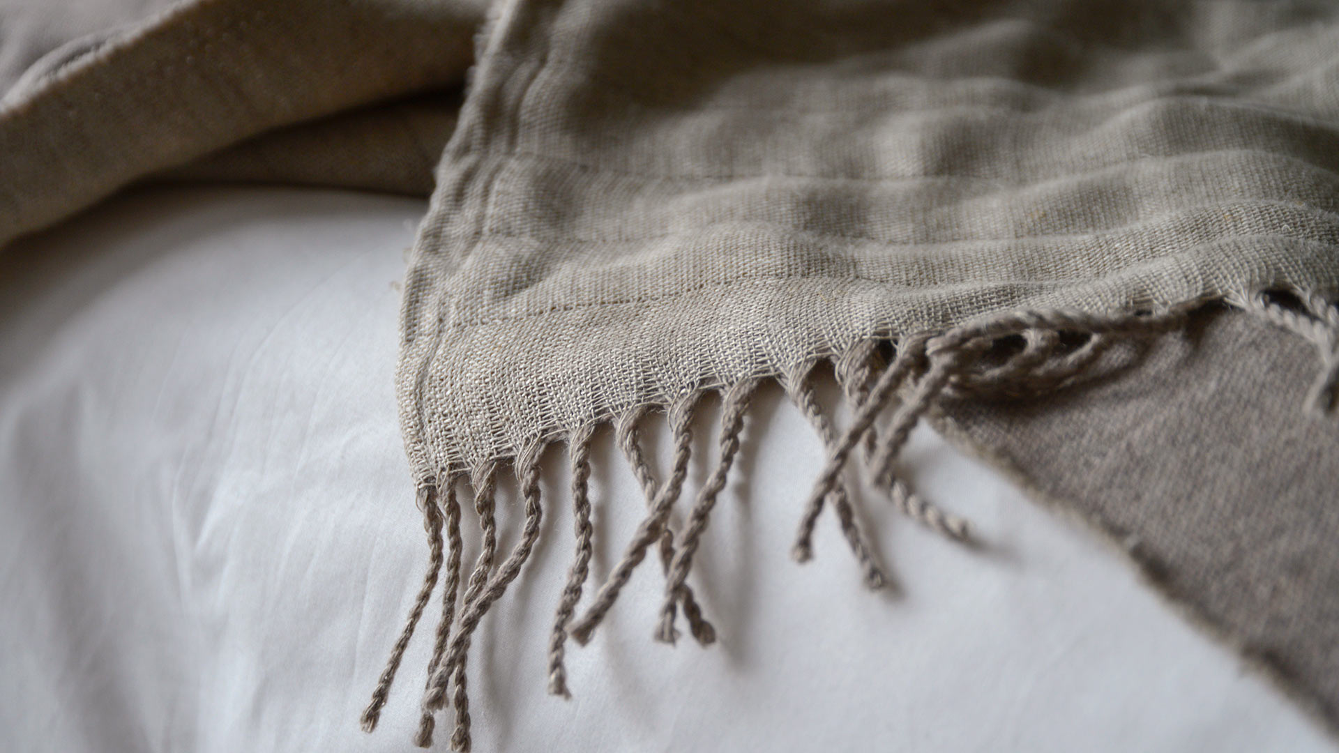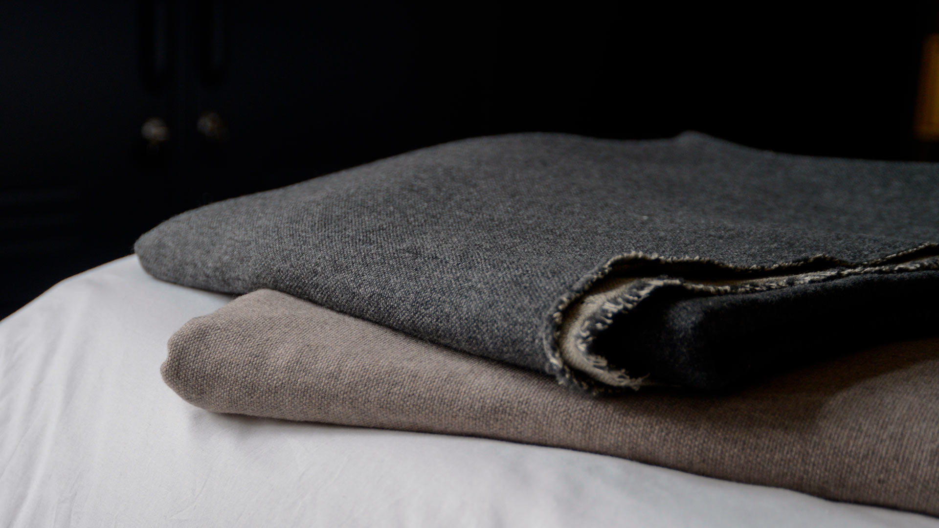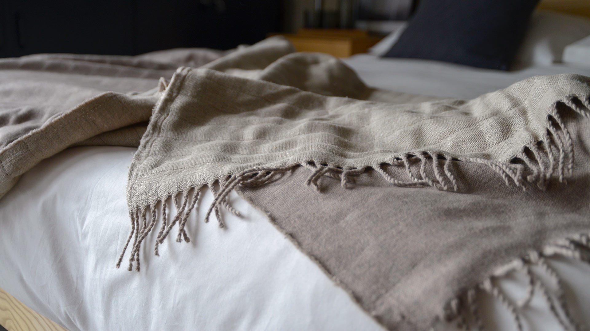 Reversible throws in merino lambswool and linen. Available in two colourways: Mushroom: a mid, cool brown Merino lambswool. The linen reverse is in a natural, pale biscuit colour. Charcoal: a deep, grey marl Merino lambswool. The linen reverse is in a natural, pale biscuit colour.