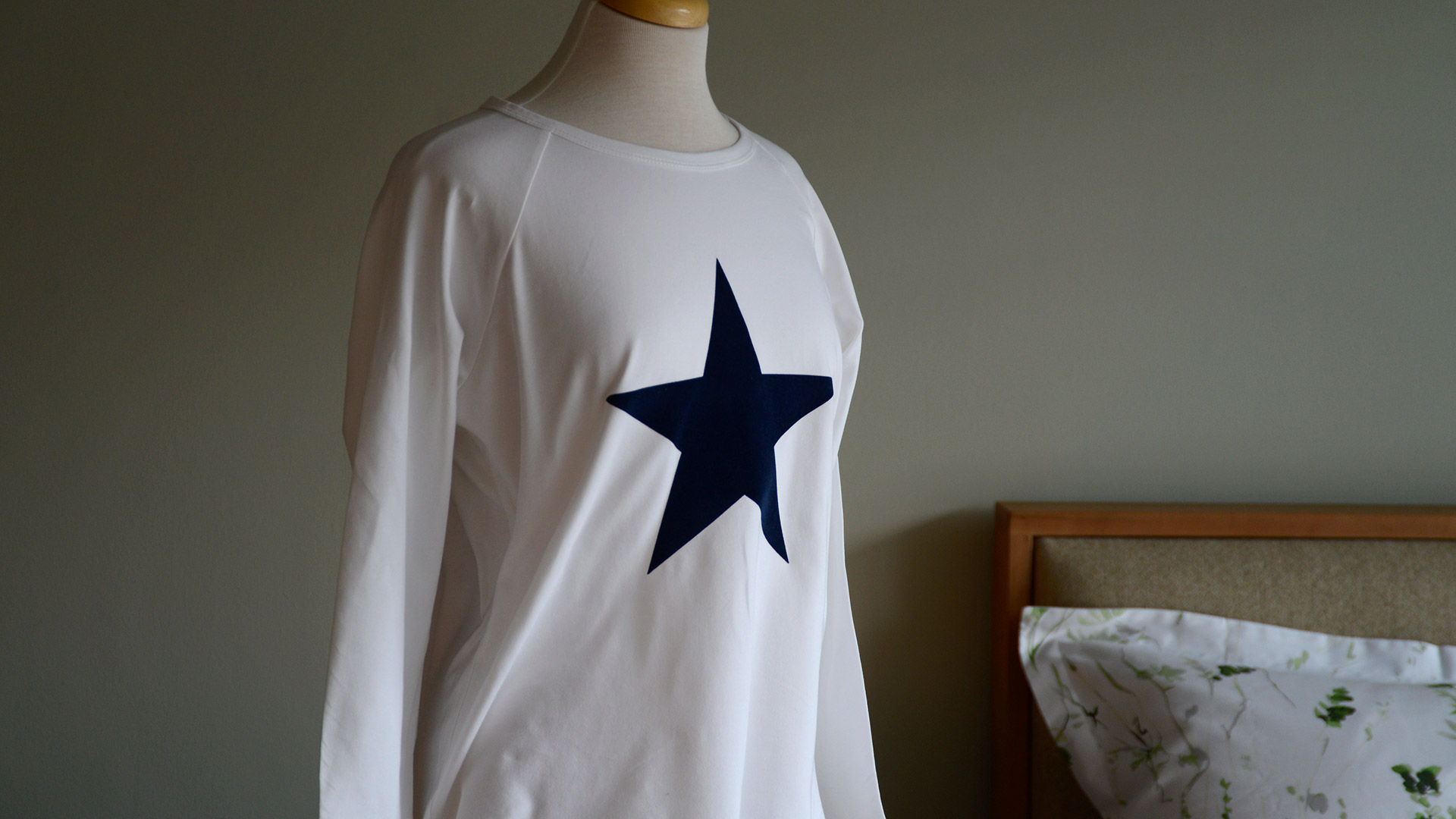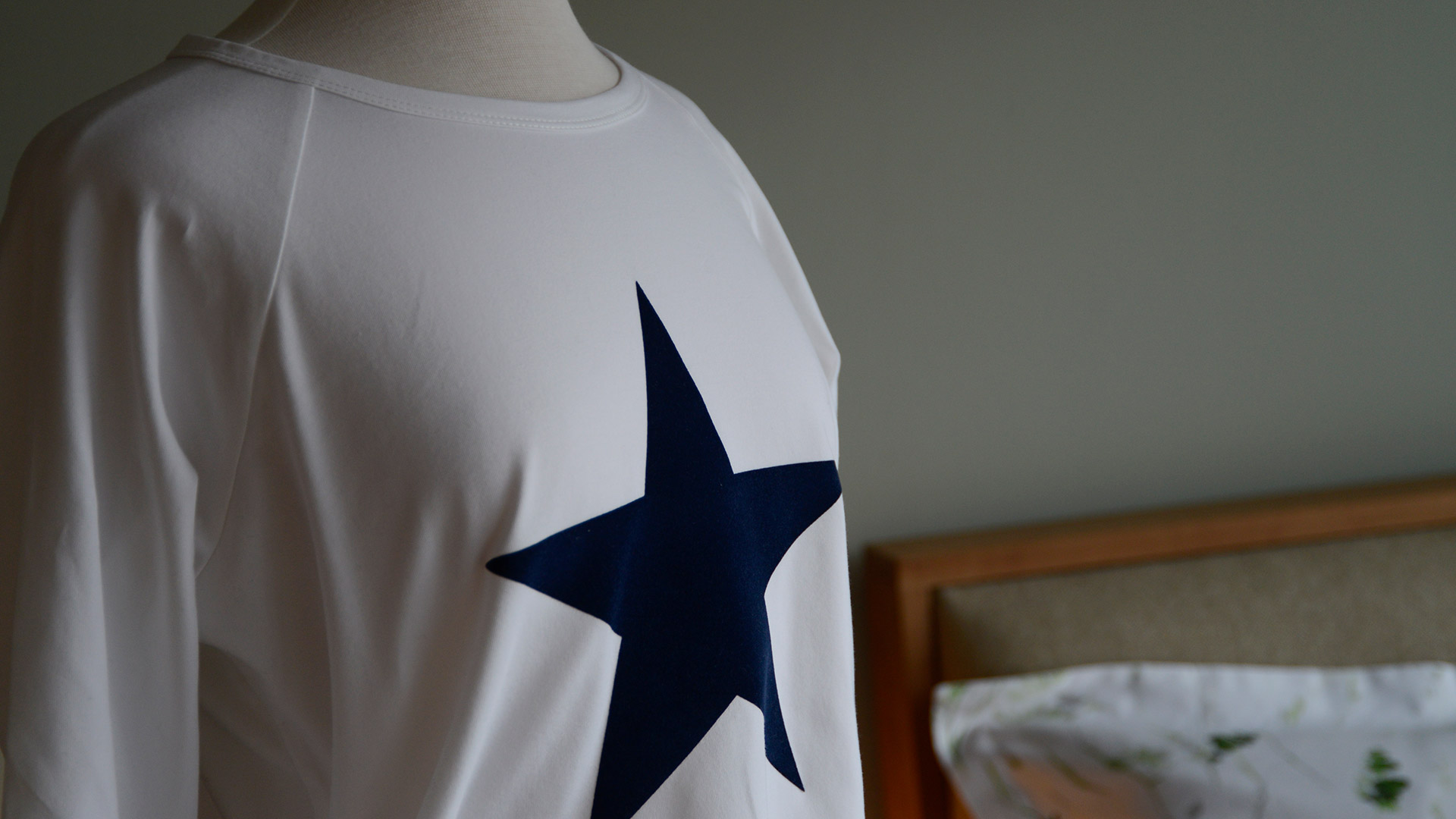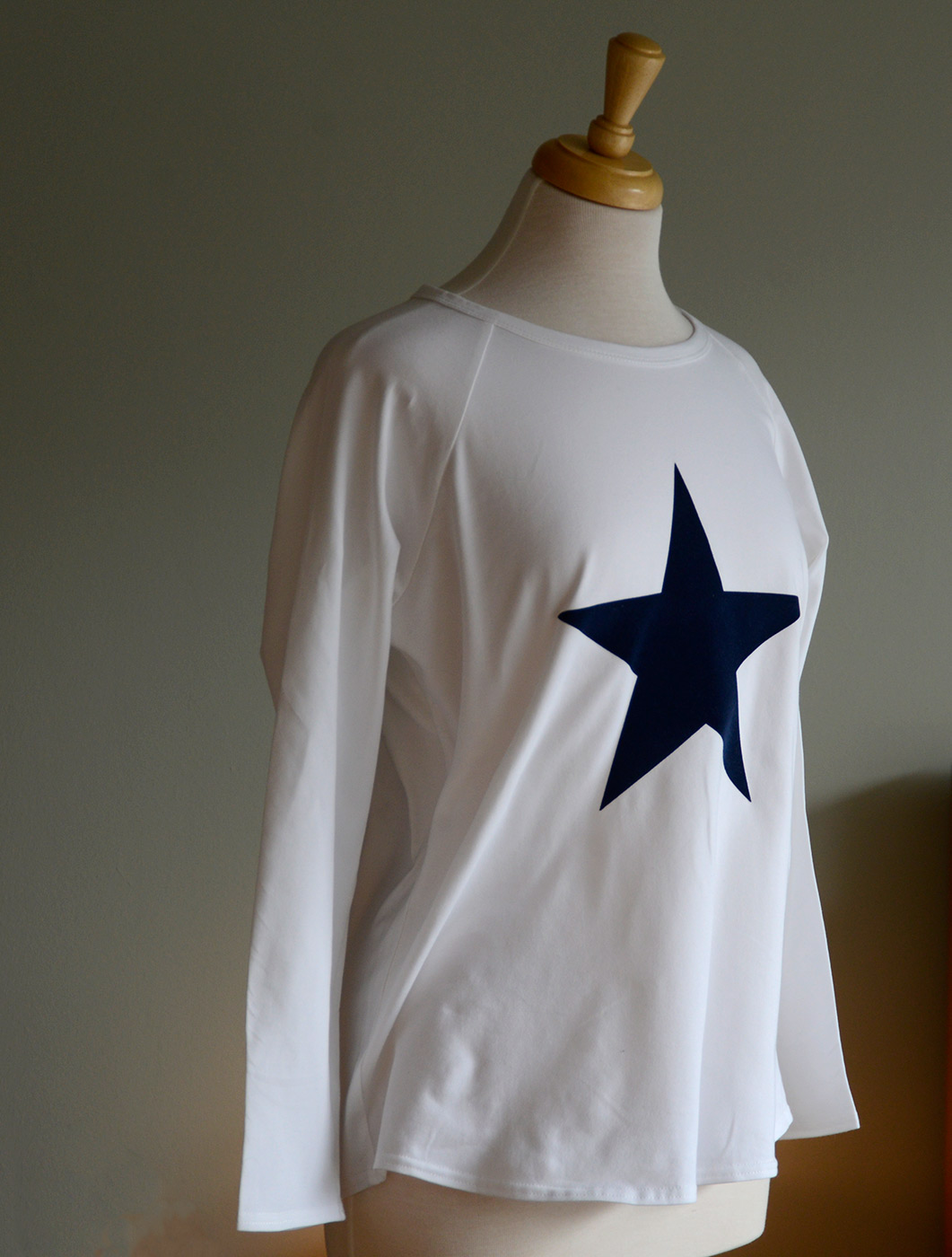 A white, long sleeve T-shirt with a navy star motif. This comfy, relaxed top has a wide round neck and raglan sleeves.