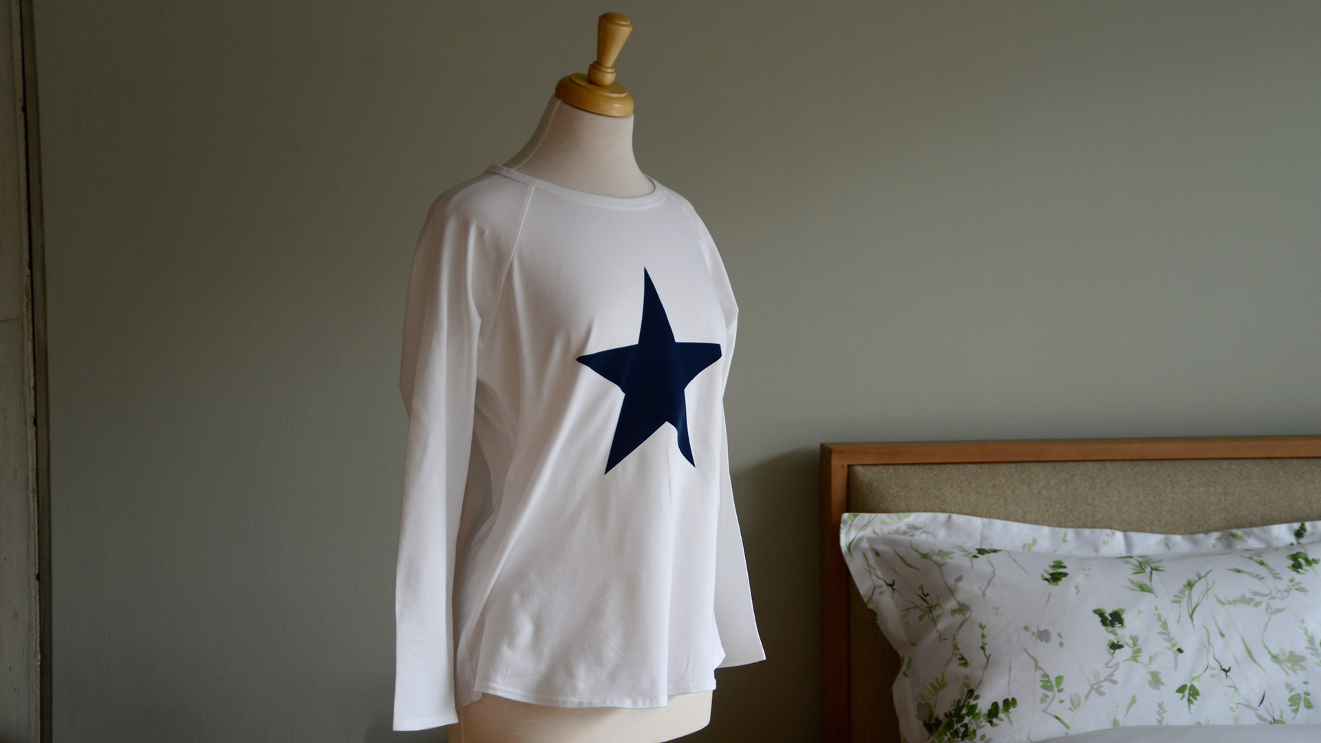 A white, long sleeve T-shirt with a navy star motif. These comfy, relaxed tops have a wide round neck and raglan sleeves. The perfect long sleeve T-shirt for lounging around the house, but stylish enough to be worn out and about. A lovely, versatile addition to your wardrobe.