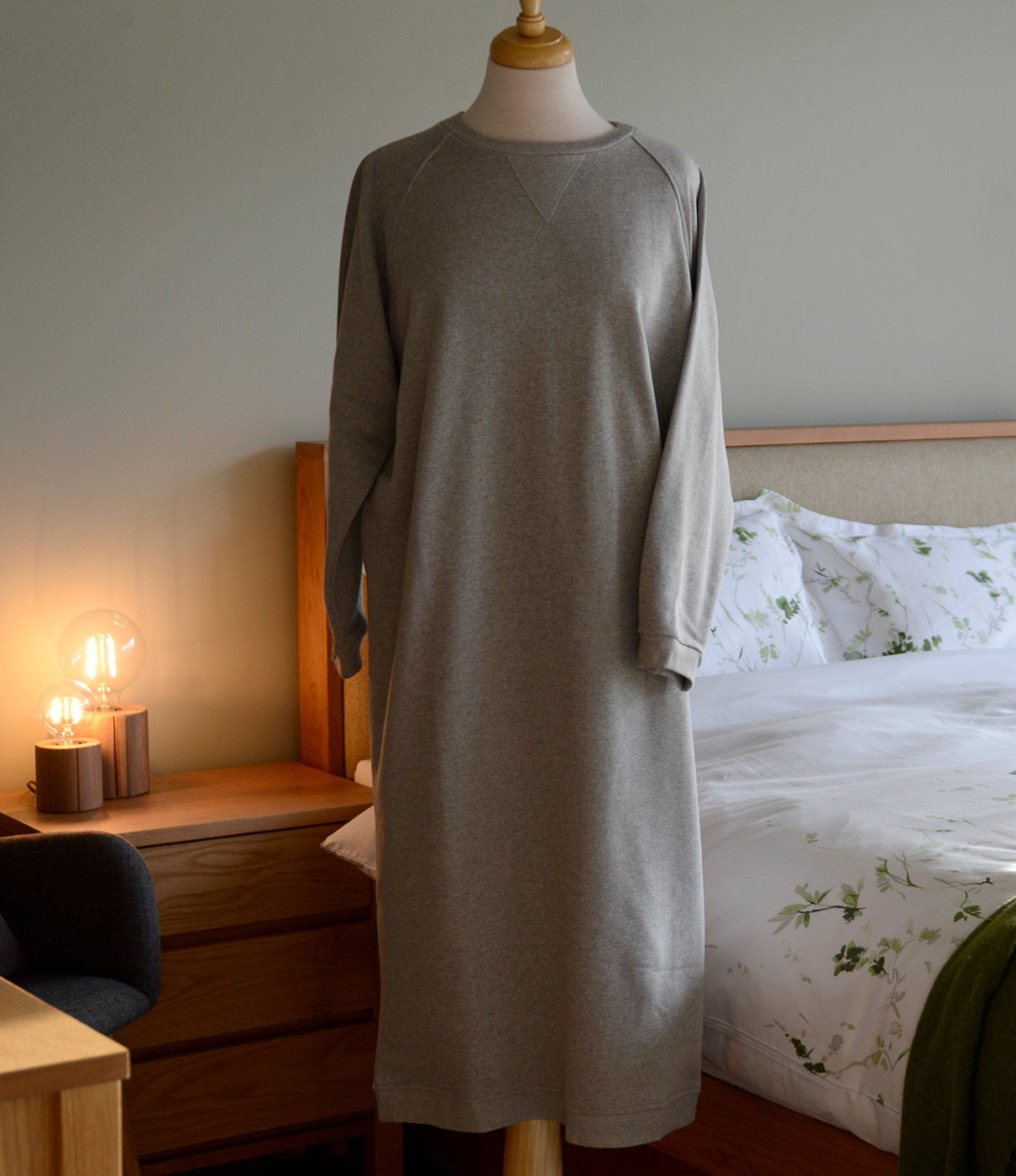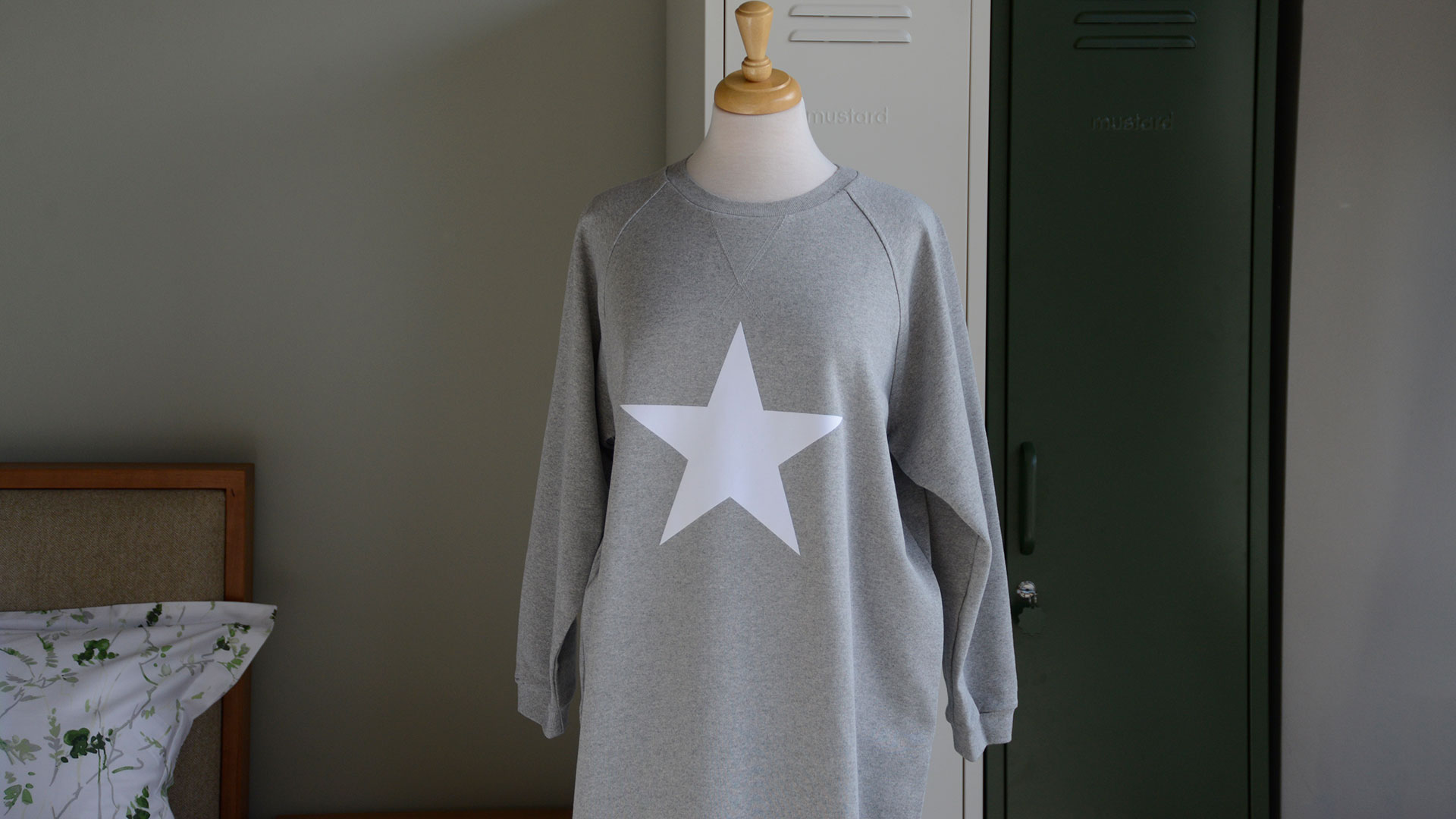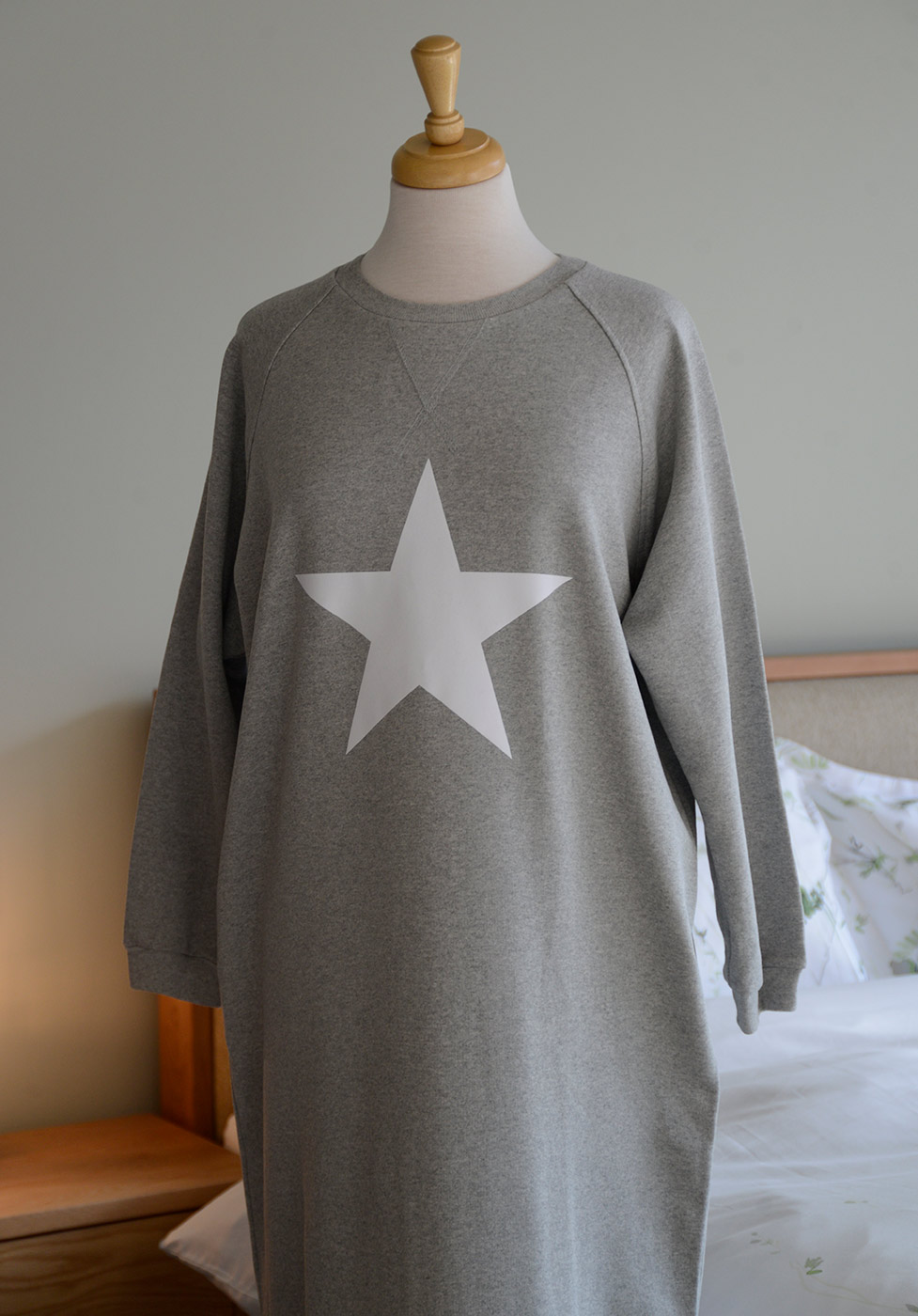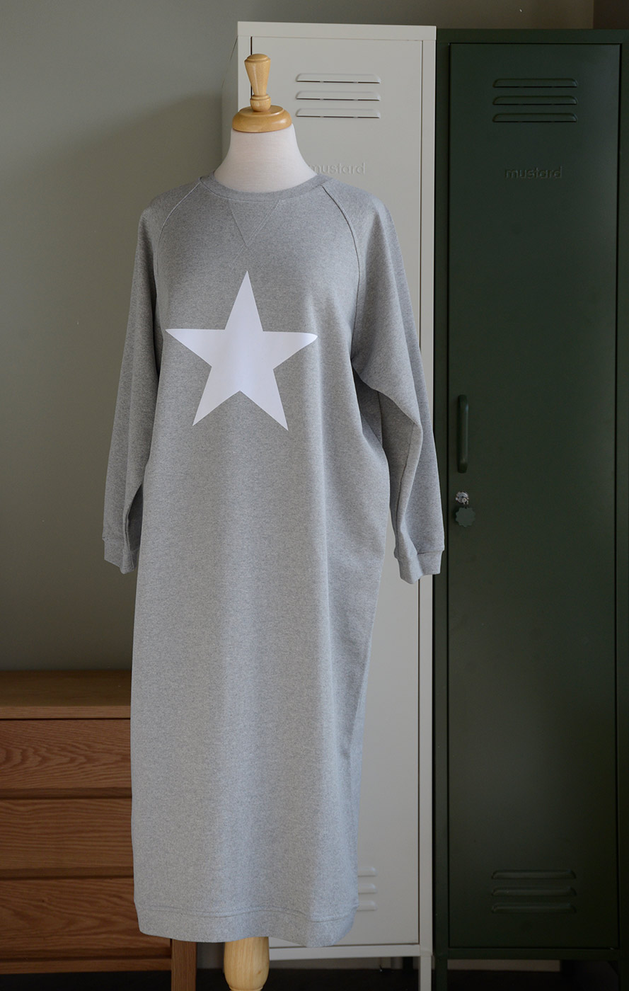 Part of our relaxed, luxury lounge-wear collection – a soft, long sleeve sweatshirt dress in a relaxed, comfy fabric. The dress has a round neck with long, raglan sleeves and sweatshirt style hem. Available in a mid grey marl fabric, plain or with a white star motif.