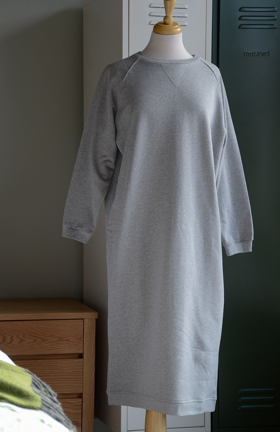 A soft, long sleeve sweatshirt dress in a relaxed, comfy fabric. The dress has a round neck with long, raglan sleeves with ribbed cuffs and matching sweatshirt style hem. This long dress is comfy and relaxed. Available in a mid grey marl fabric, plain or with a white star motif.