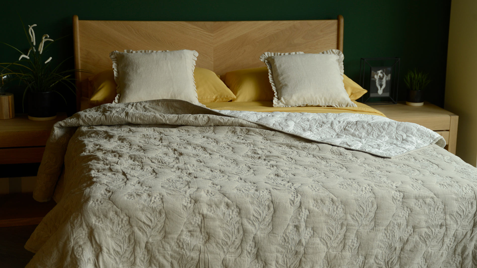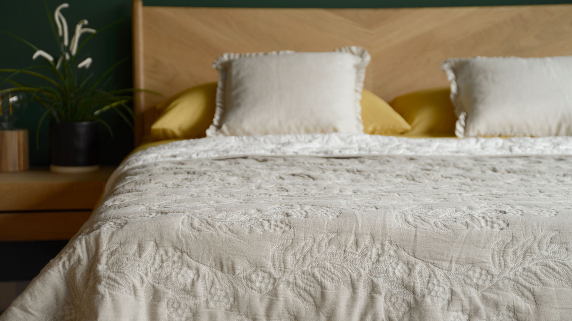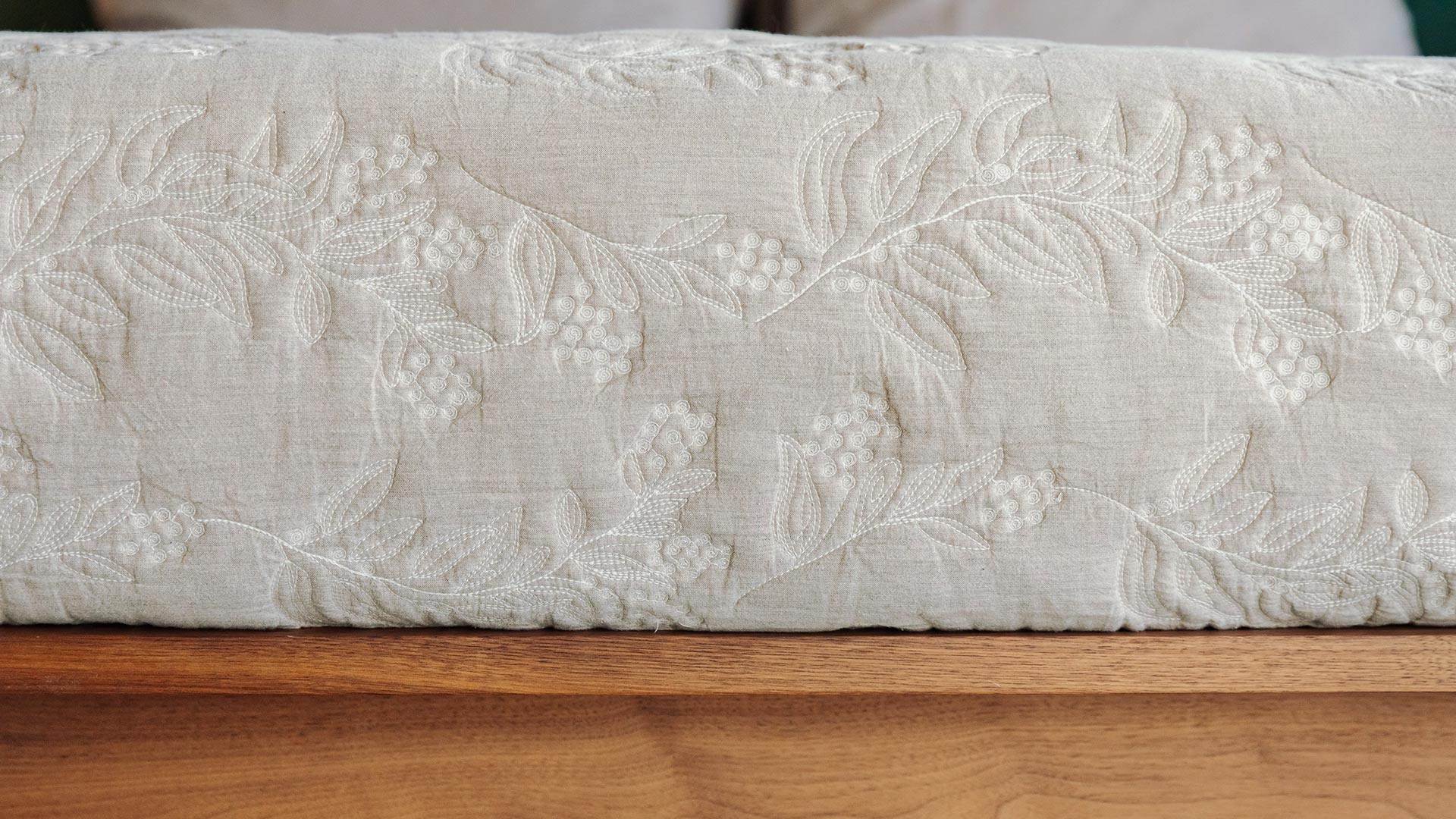 A timeless design – this beautifully embroidered quilt has an upper side in a warm stone colour with an ivory reverse. Elaborate embroidery of leaves and berries in ivory thread decorates this classic quilt.