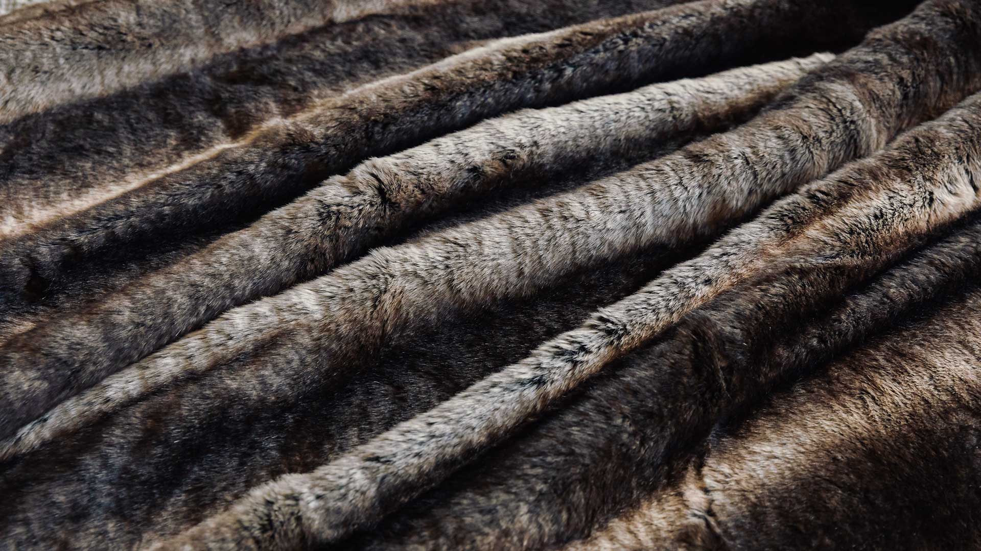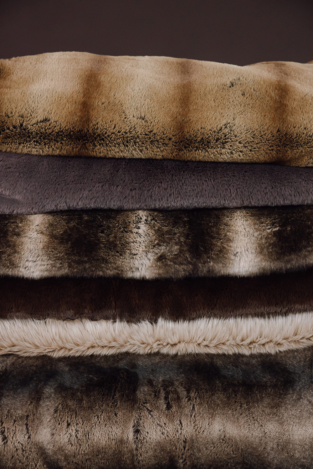 Russian Blue:Â a deep, mid-grey shade with a warm blue undertones, complete with a faux suede backing in a similar deep grey colour Brown Bear:Â a rich, warm brown shade with hints of copper and caramel when the deep espresso brown ‘fur’ catches the light Gold Alaska Rabbit: a warm golden brown shade with stripes of dark brown throughout and varying shades of pale browns and caramels Taupe Alaska Rabbit: a very dark brown shade with stripes of very pale taupe throughout and varying shades of pale browns and greys Alaska Fox: this ‘fur’ has bold, contrasting stripes; a blend of tones including dark espresso brown, mid ash brown and pale ecru with the depth of the pile in dark charcoal Siberian Wolf:Â an extra-deep, flowing faux fur pile; incorporating cream and burnt caramel tones