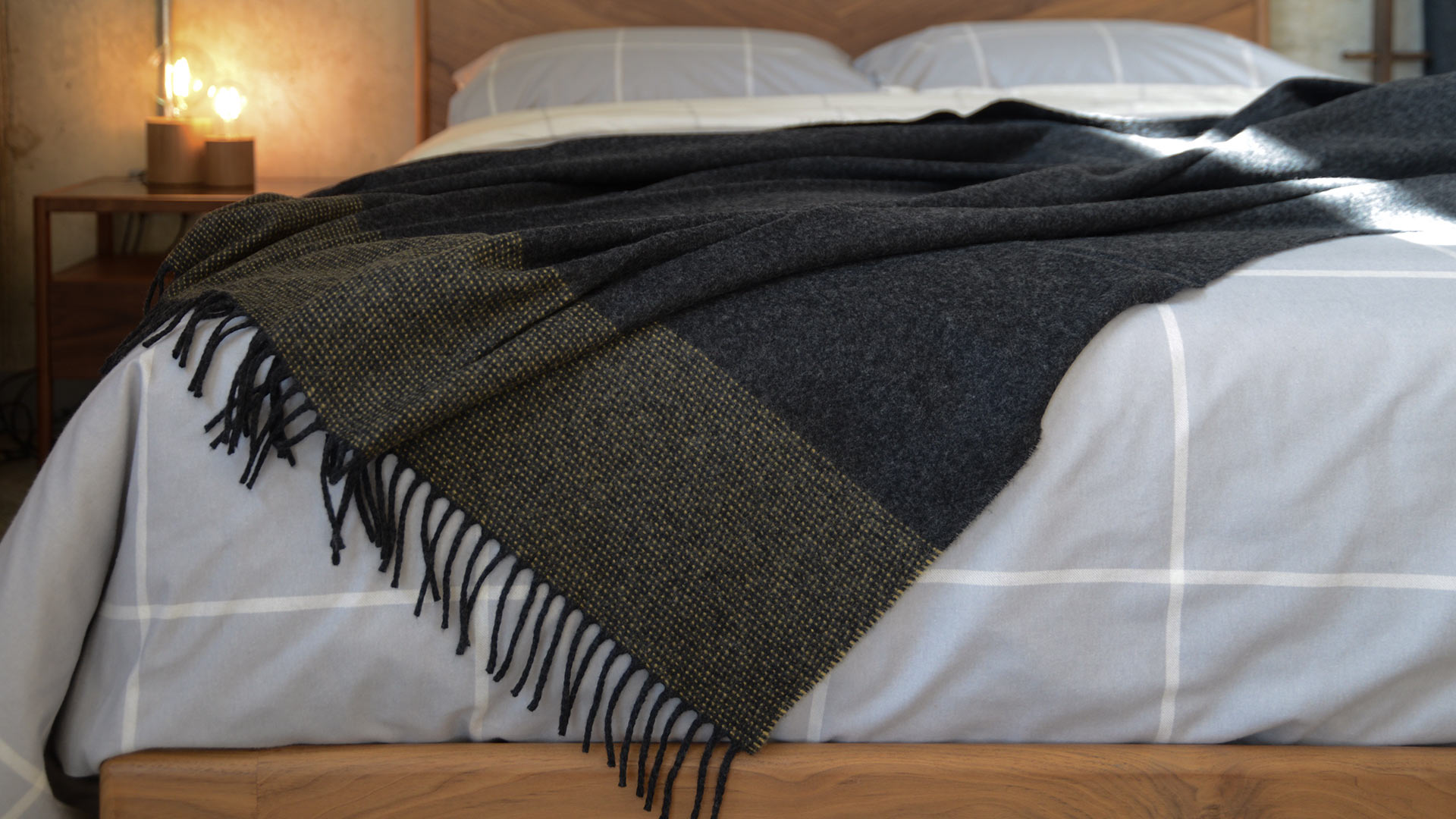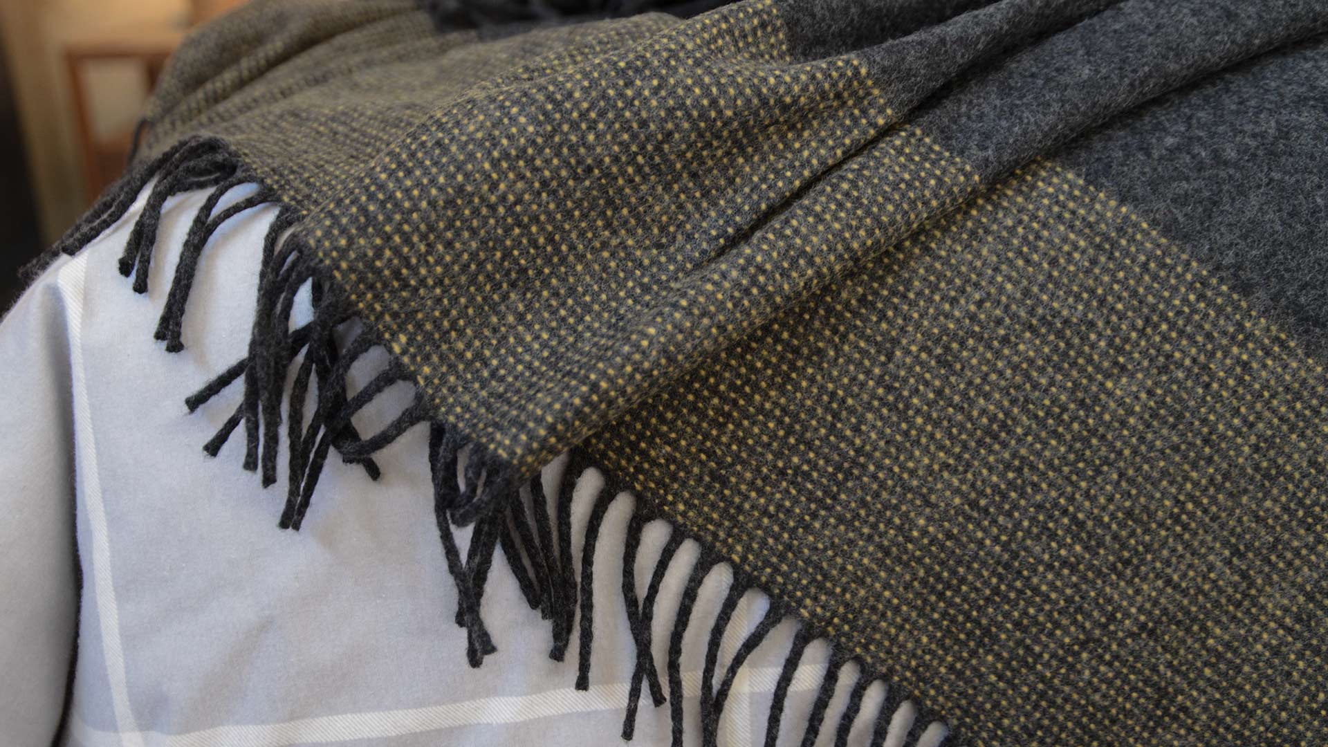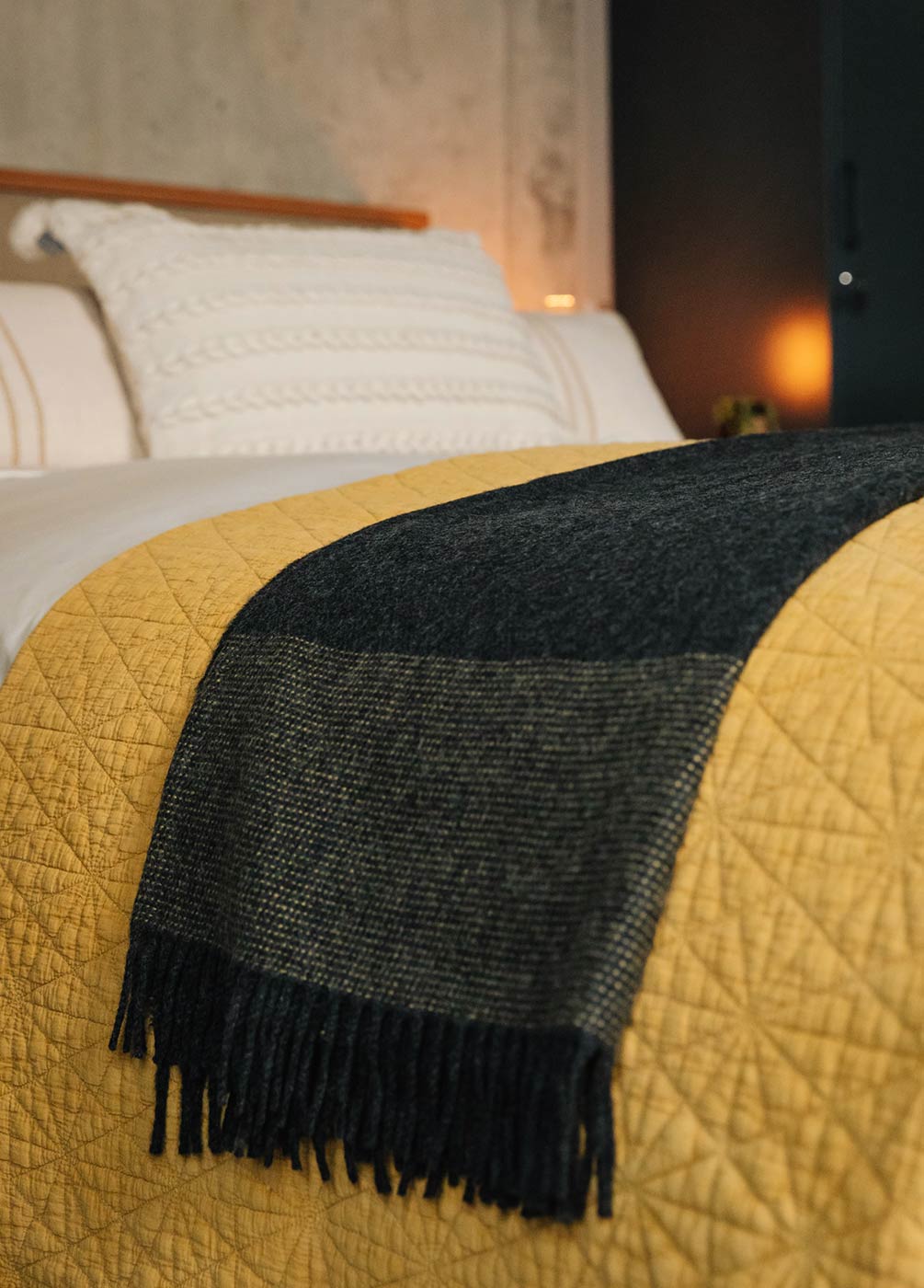 Cosy, and luxuriously soft merino and cashmere throws in charcoal and yellow, or grey and orange. Modern and stylish blankets that are large enough for over the end of your bed and soft enough to snuggle under on the sofa. Finished with a fringe to two ends across the width. Made in Ireland by McNutt of Donegal – making some of the world’s finest textiles for over 60 years.
