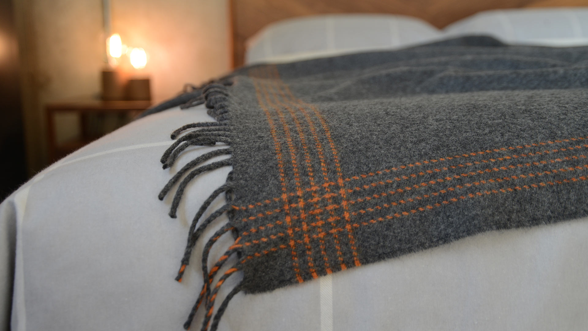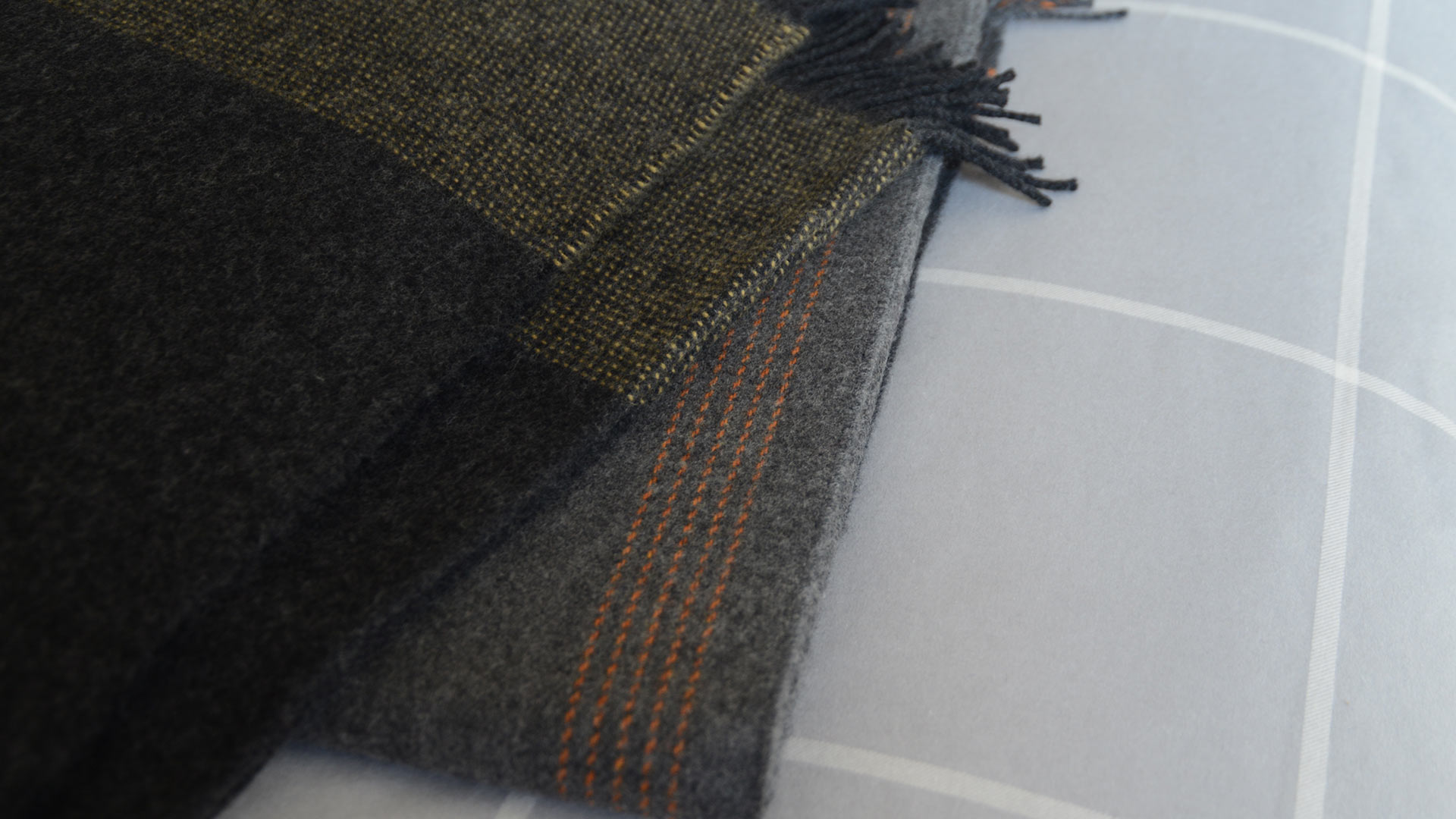 These contemporary, luxury throws are made of super-soft meriono lambswool and cashmere. Available in two colourways: – charcoal with wide yellow bands across two edges – steel grey with fine orange stripes along all 4 sides