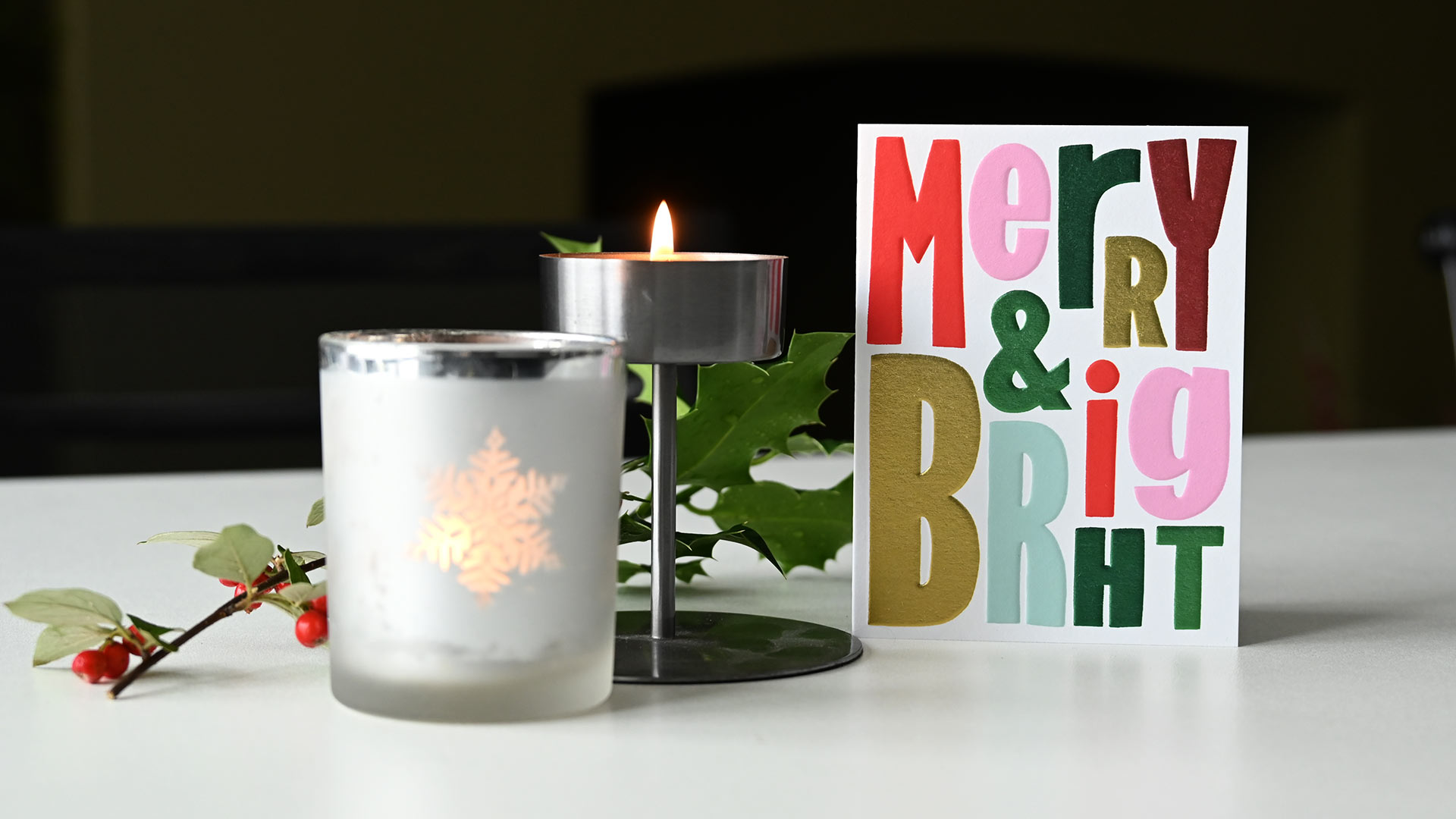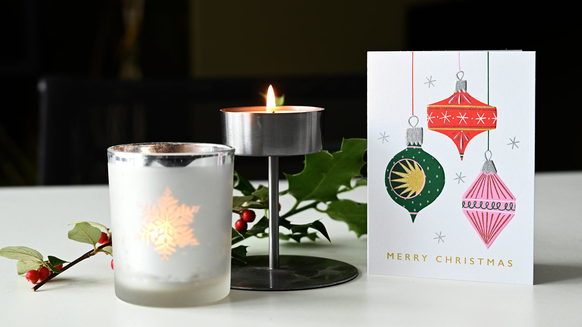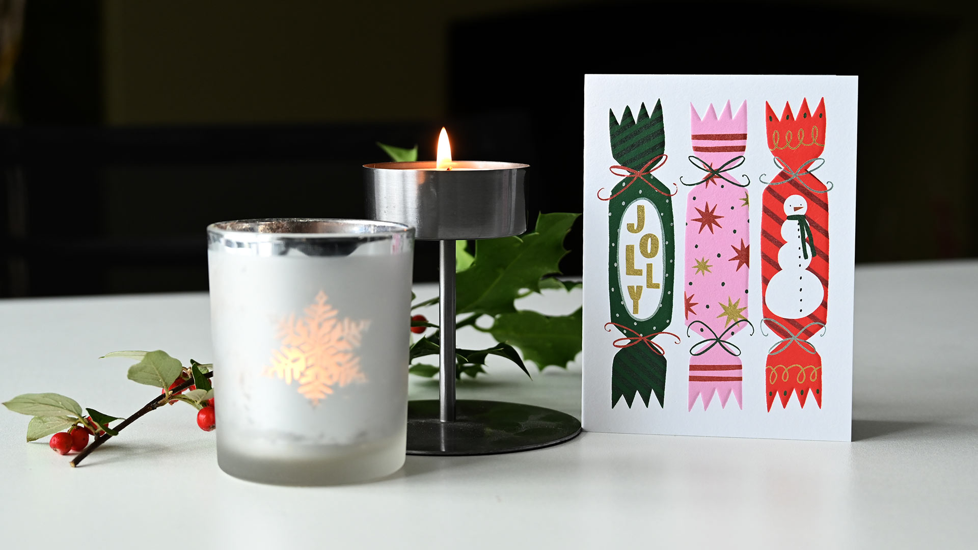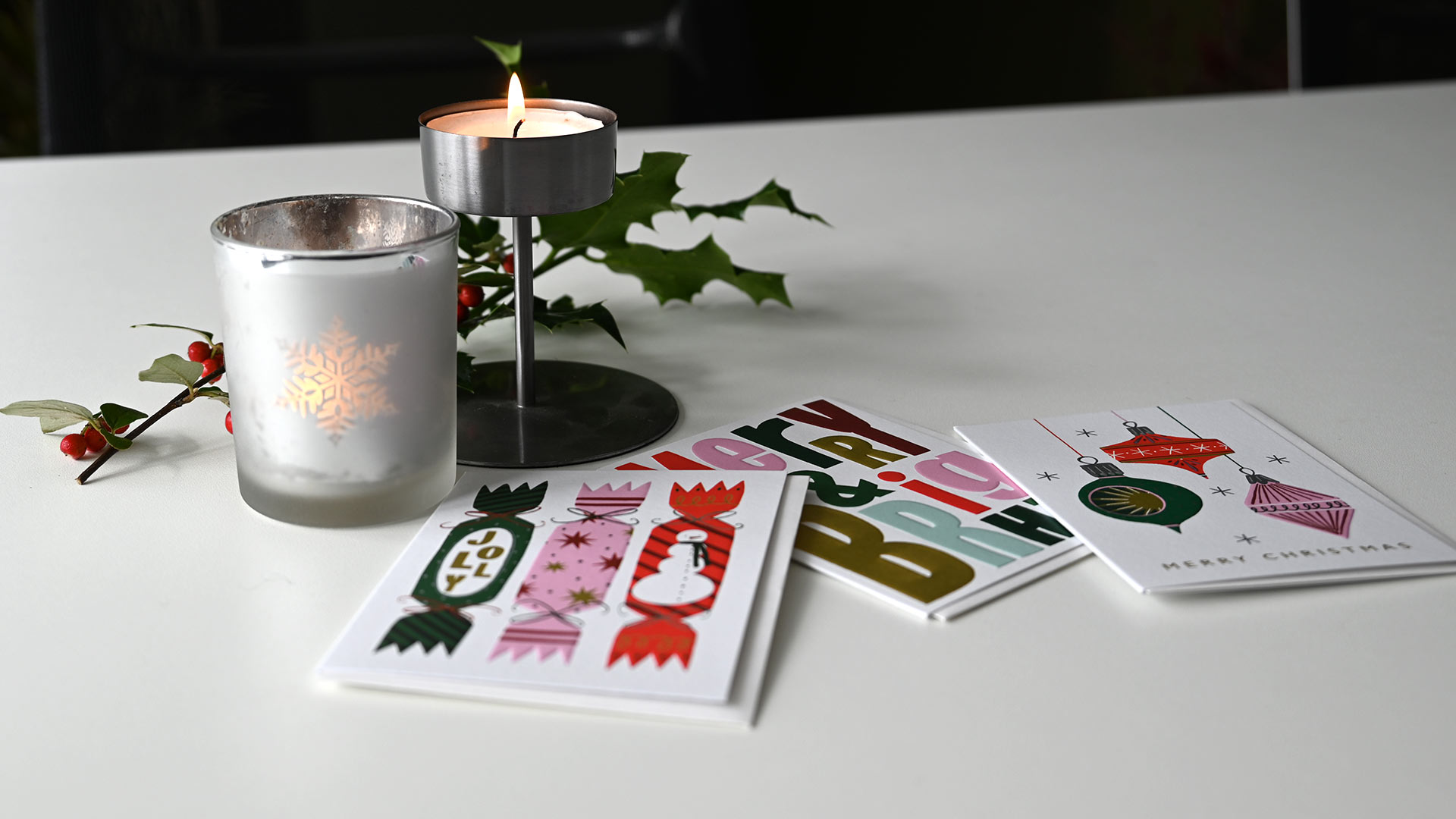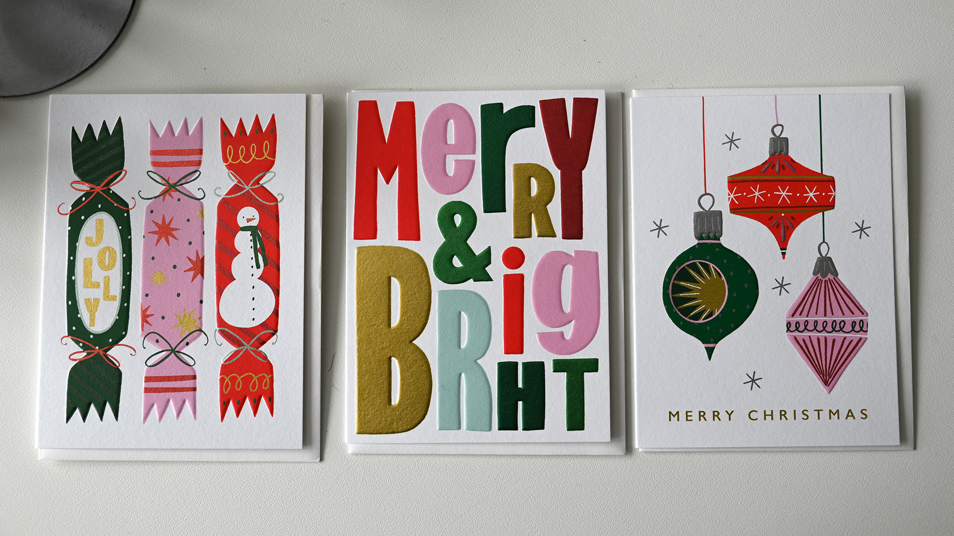 Set 2 with White Envelopes: 1x Christmas Baubles: 3 colourful vintage look ornaments with embossed details. 1x Merry & Bright: bold colourful embossed lettering with a white background 1x Jolly crackers: 3 colourful vintage look crackers with embossed details.