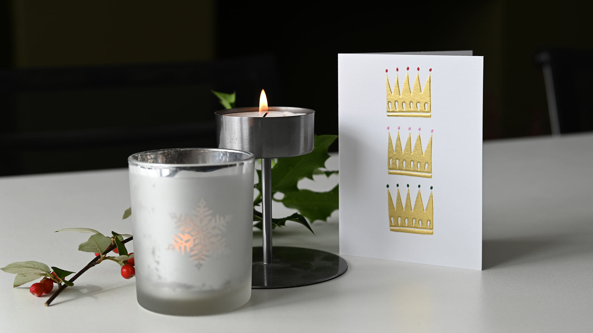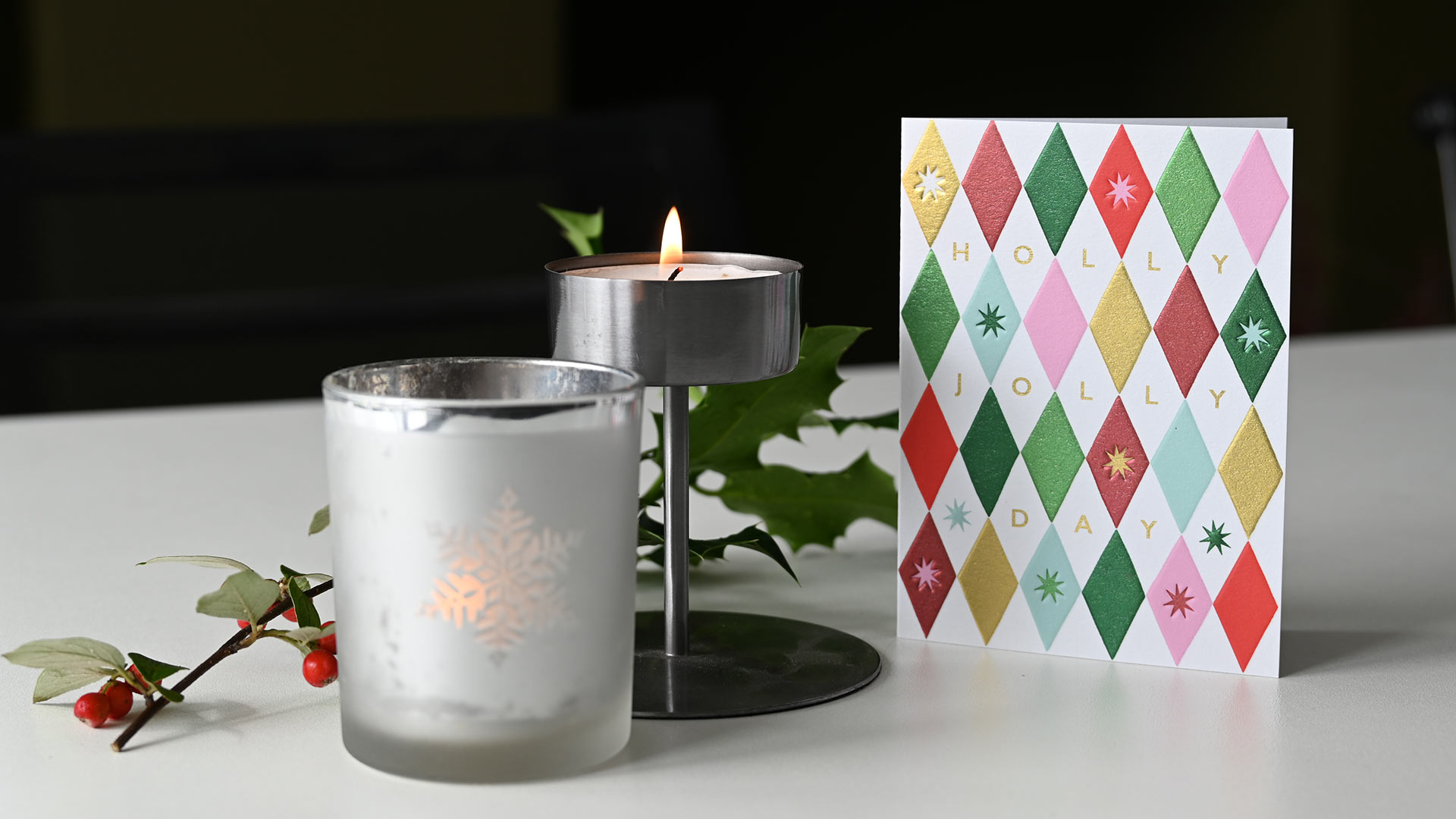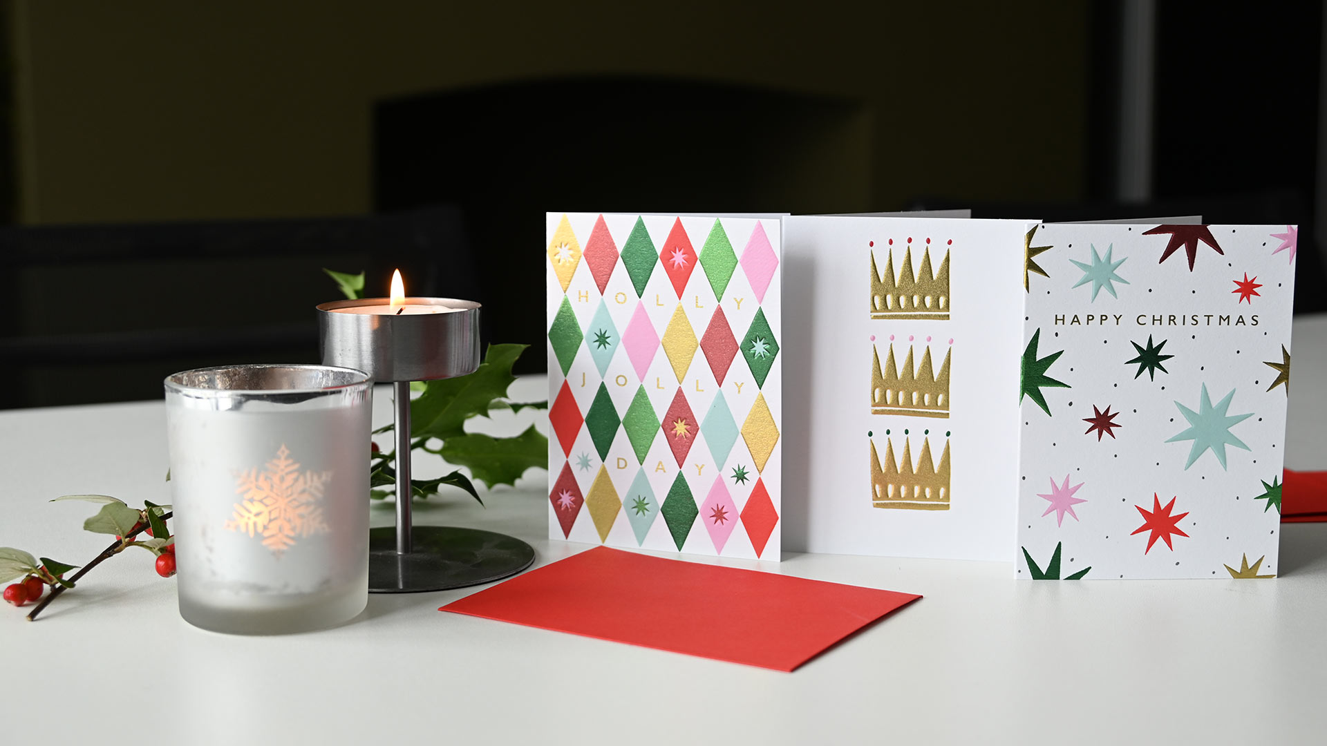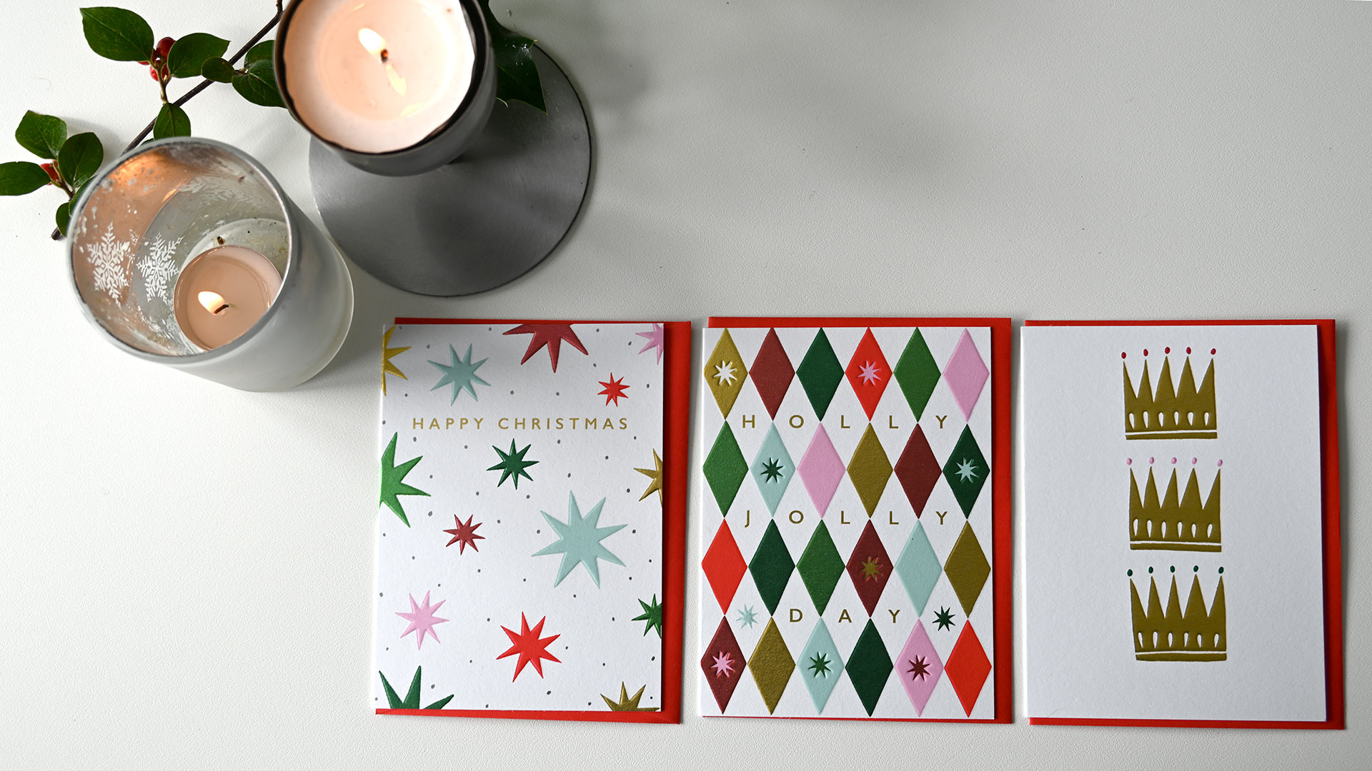 Set 1 with Red Envelopes: 1x Christmas Stars: colourful embossed stars against a white backdrop with silver dots. 1x Three Kings: three gold embossed crowns in a stack with colourful details. 1x Jolly Diamonds: a colourful diamond pattern featuring ‘Holly Jolly Day’ in gold letters.