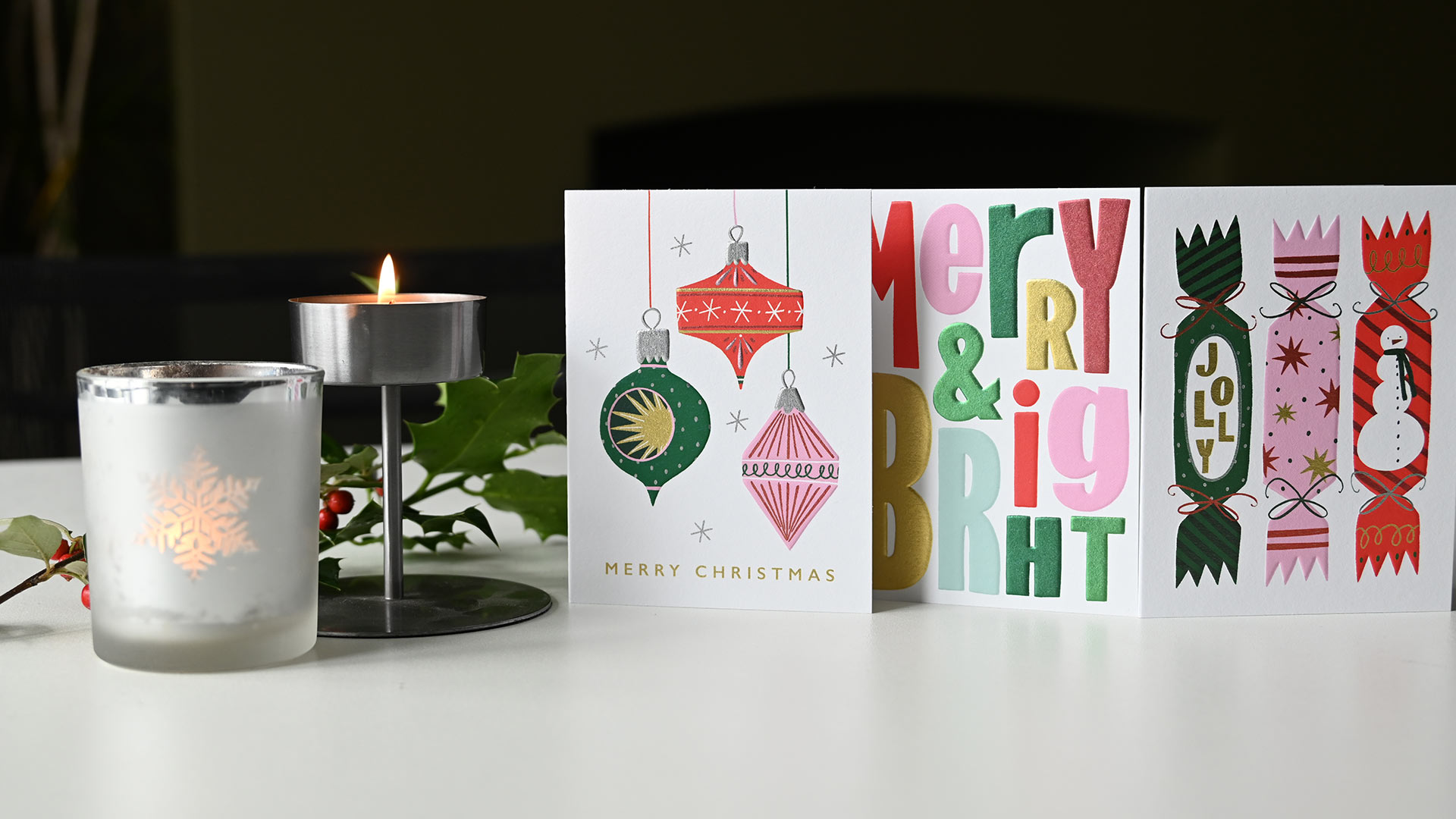 These sets of 3 luxury mid-century look Christmas cards have embossed details and white or red envelopes. Vintage look, high quality Christmas cards – perfect for your very nearest and dearest.
