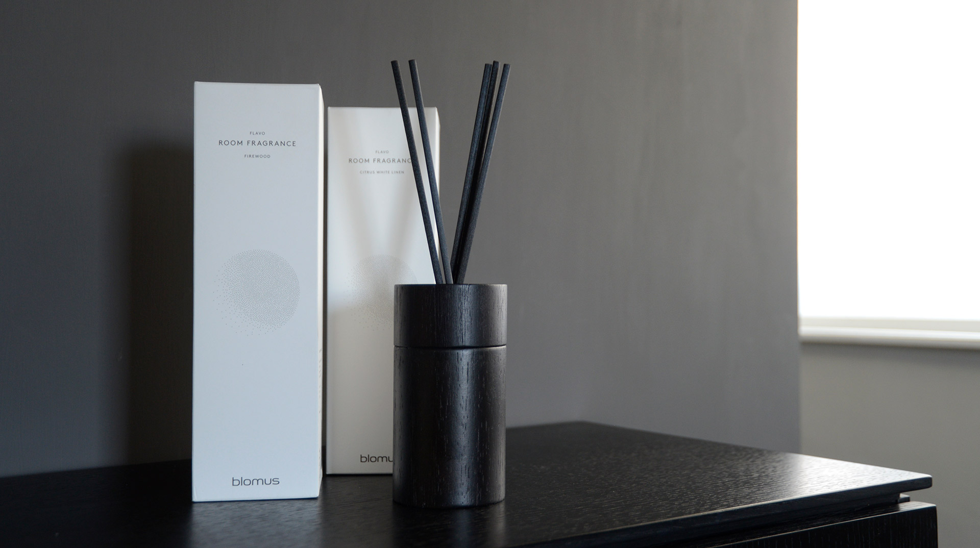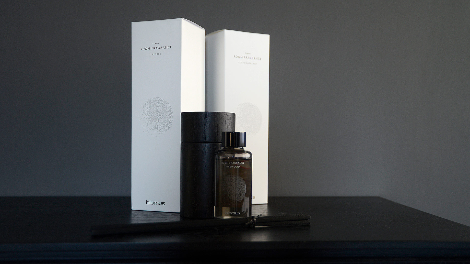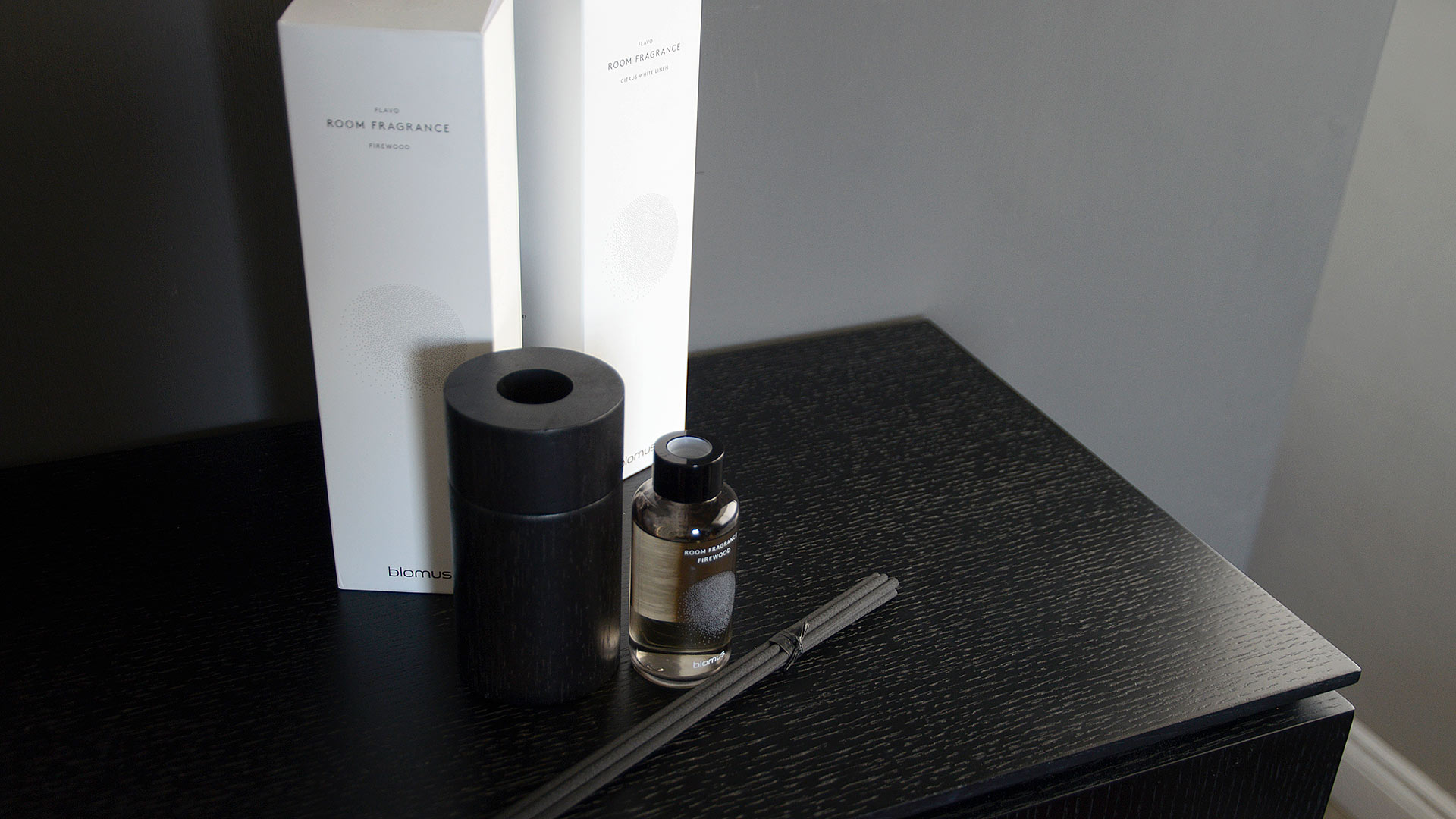 Modern, luxury room fragrance in wooden holders, available in the following scents; Firewood or Citrus White Linen.