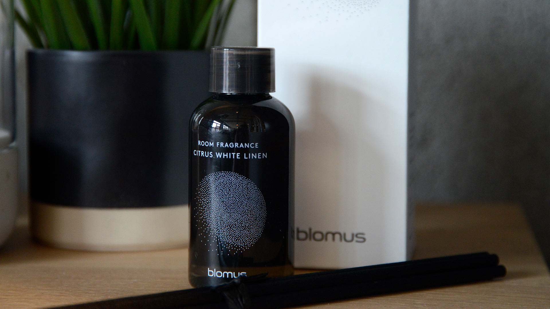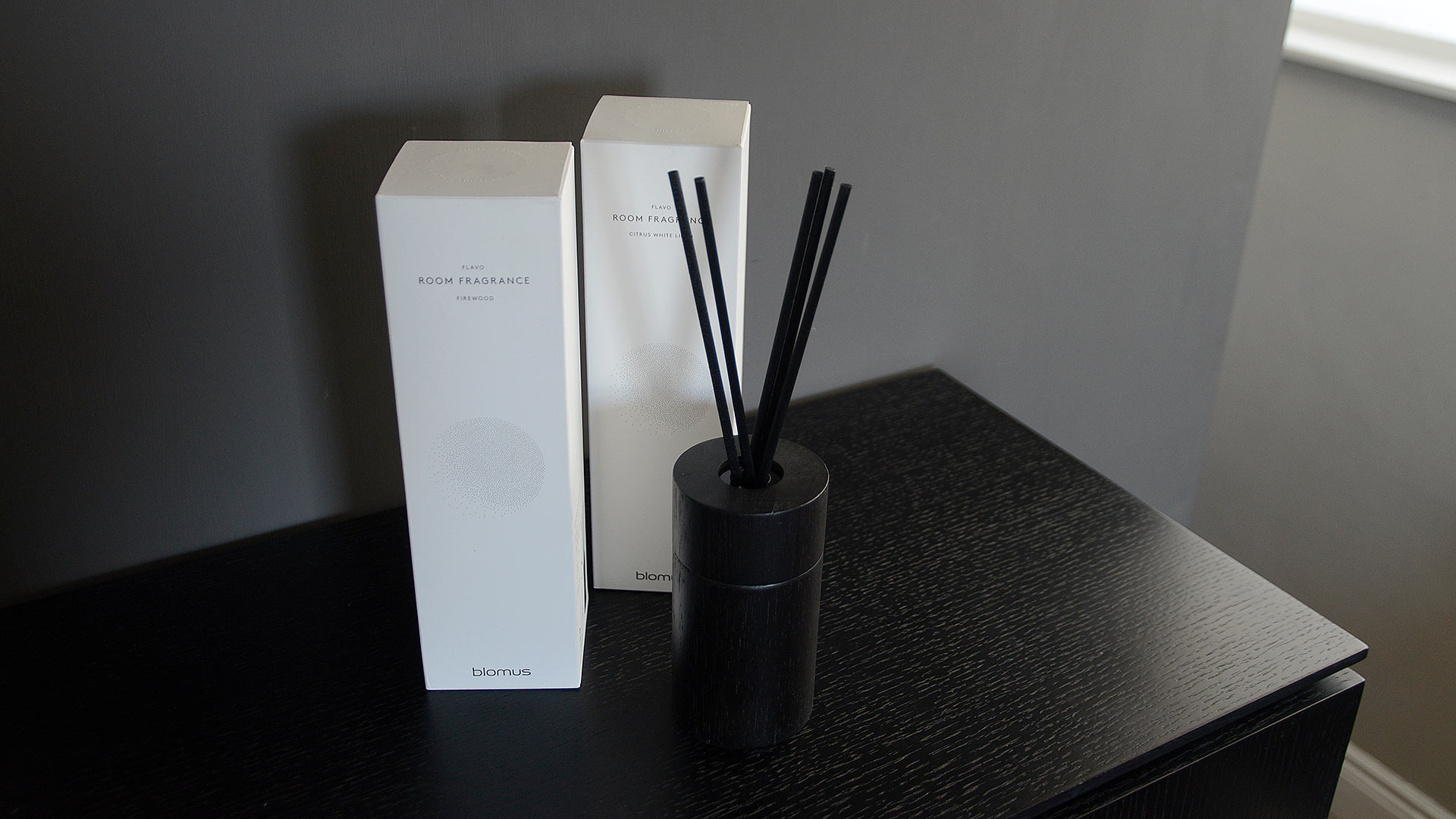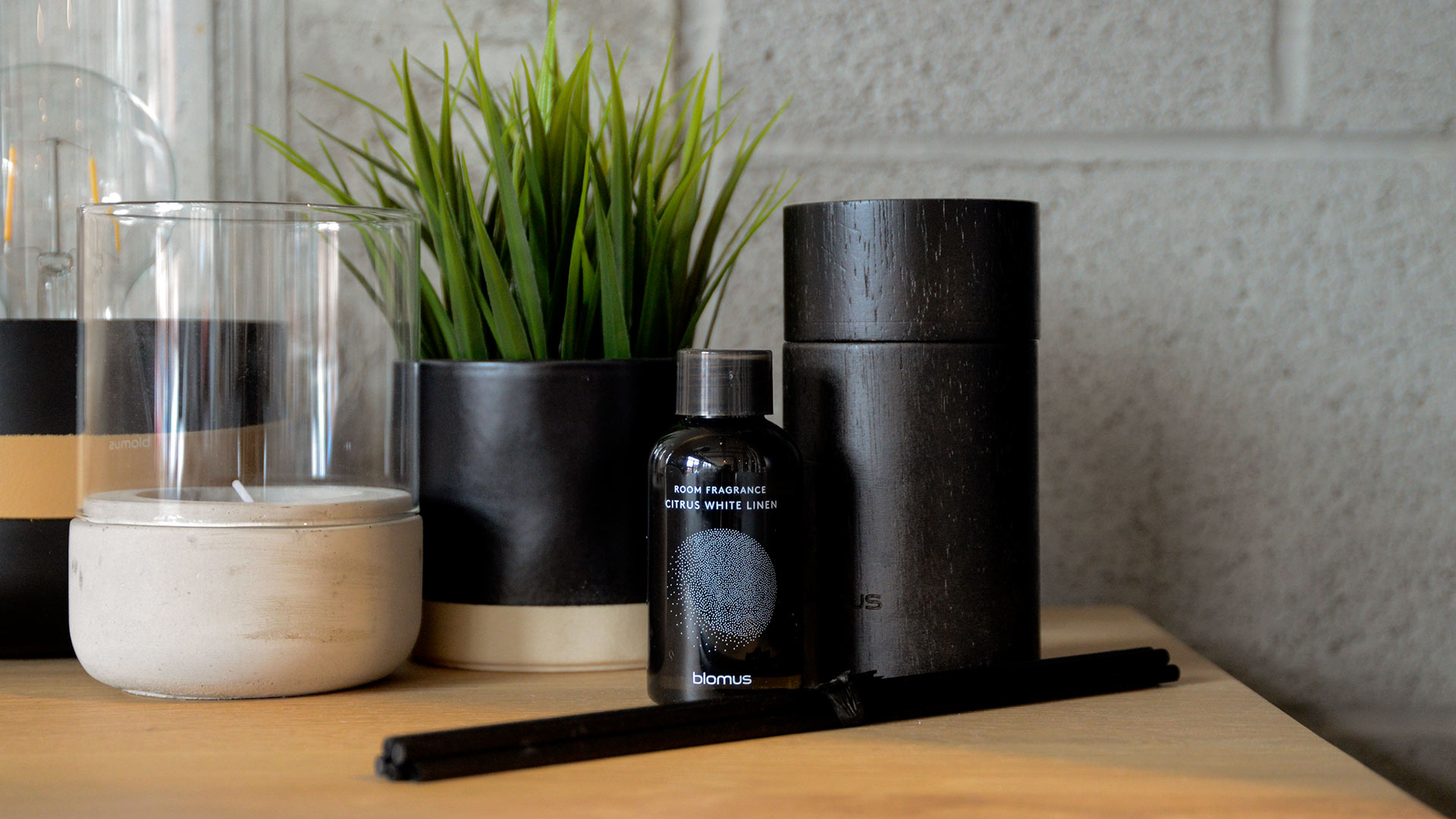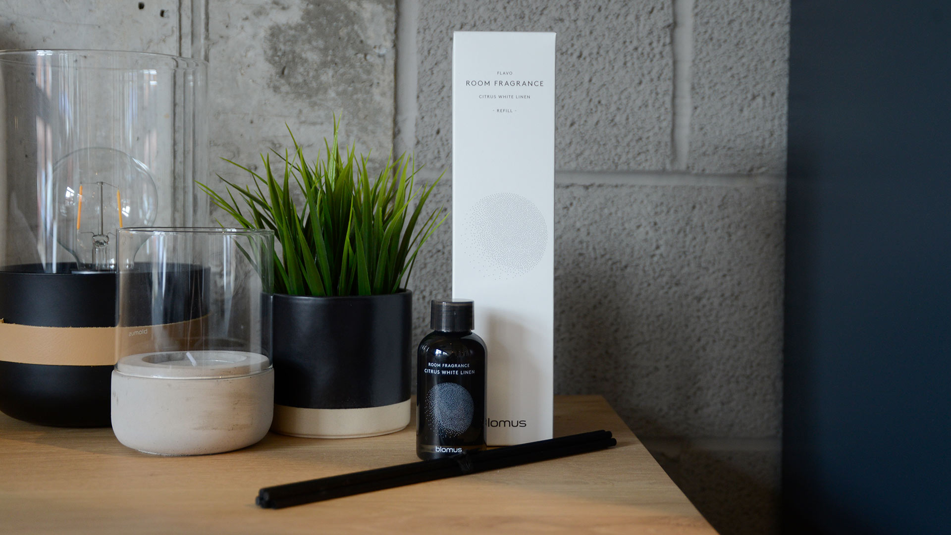 Modern, luxury room fragrance in wooden holders, available in the following scents; Firewood or Citrus White Linen.