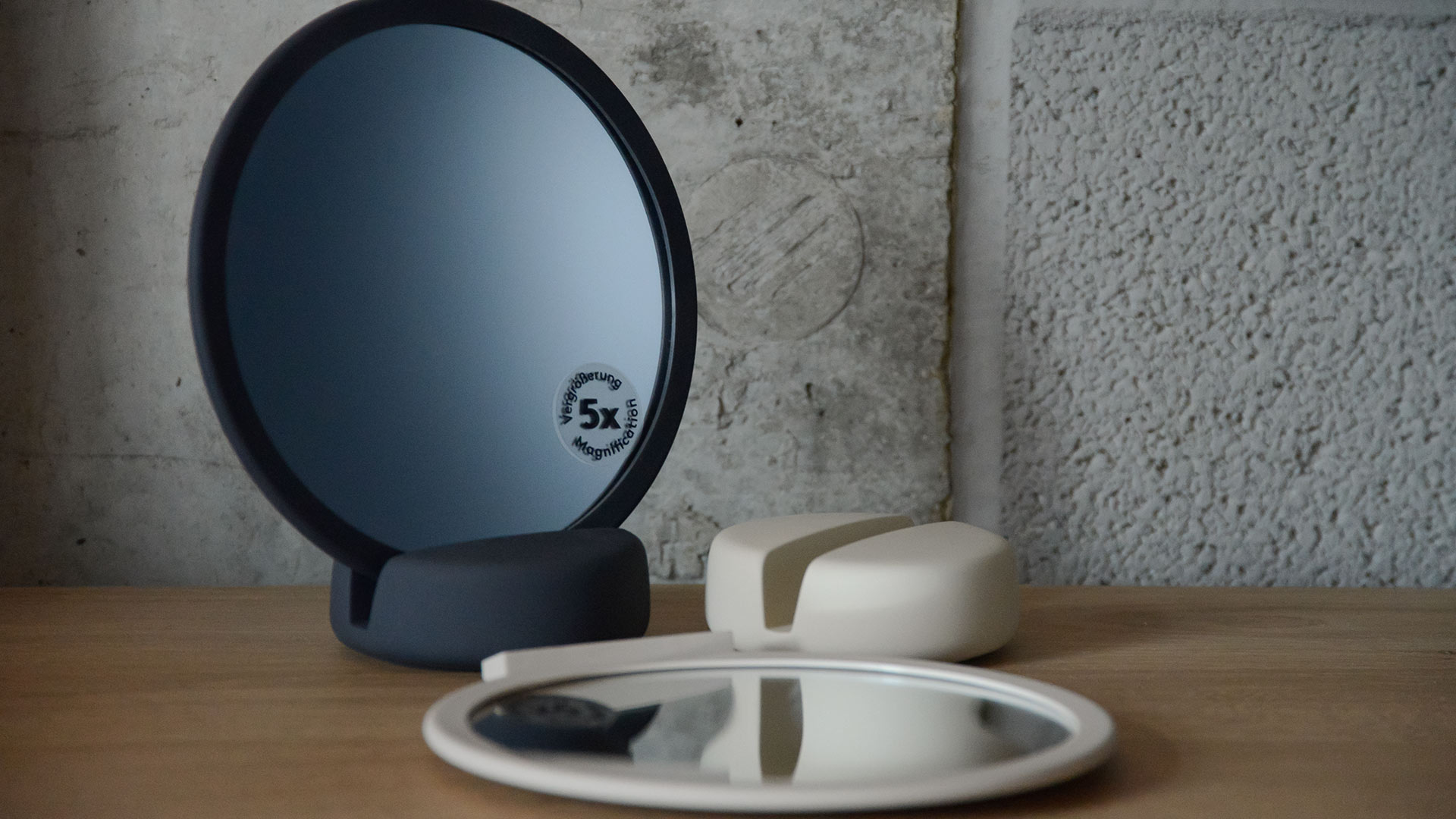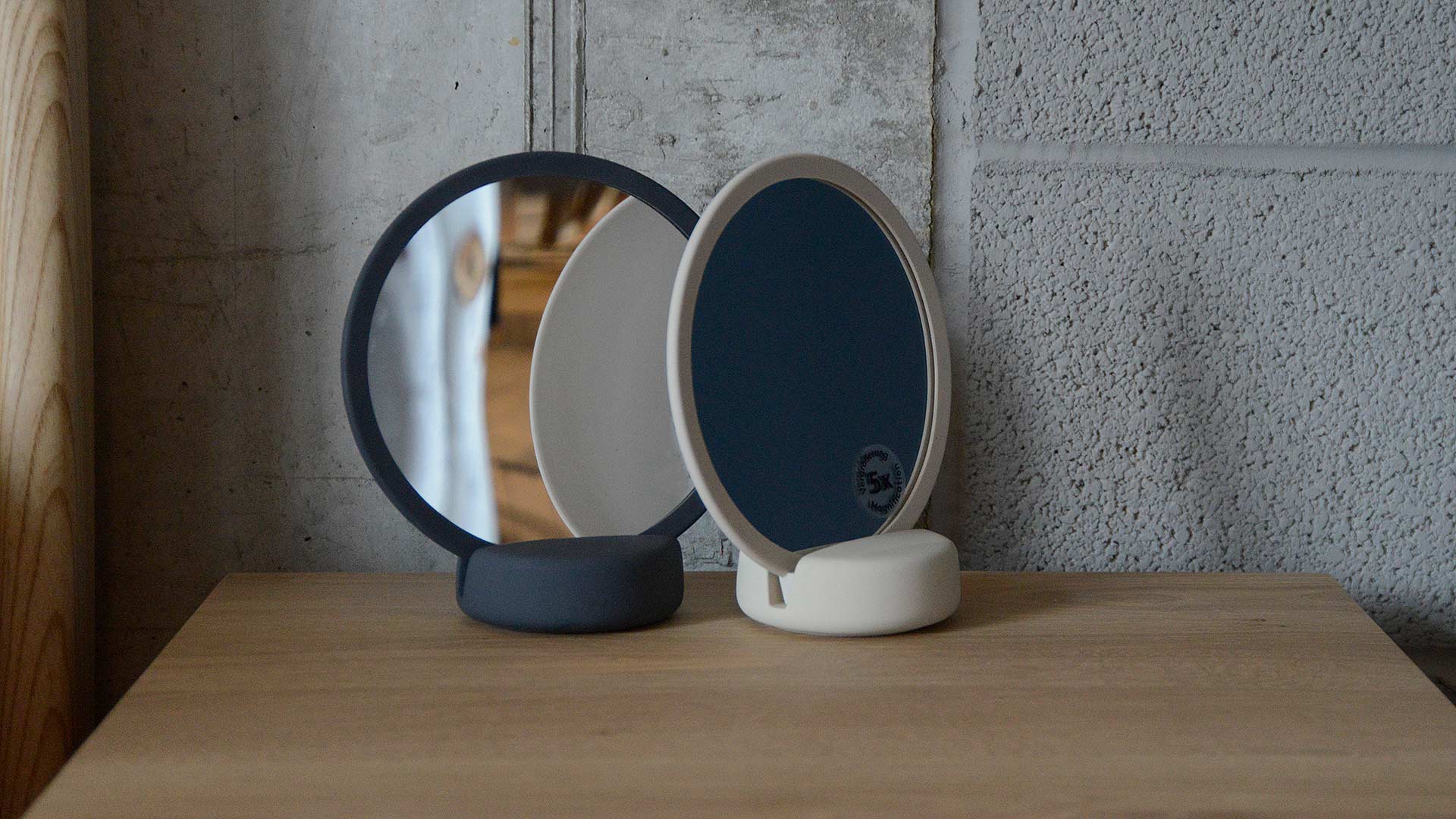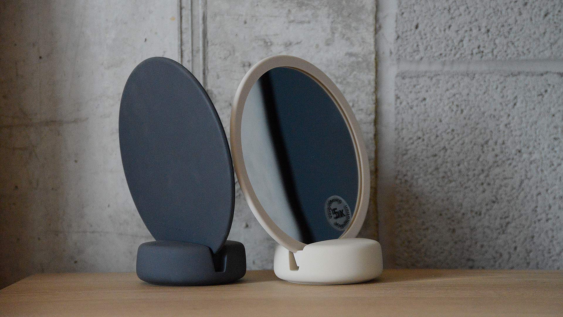 Stylish mirrors in contemporary, neutral shades. The mirror can be used as a hand-mirror or proped up with the use of a sturdy base to make a table-top mirror. Magnifies x5. Available in the following colours: