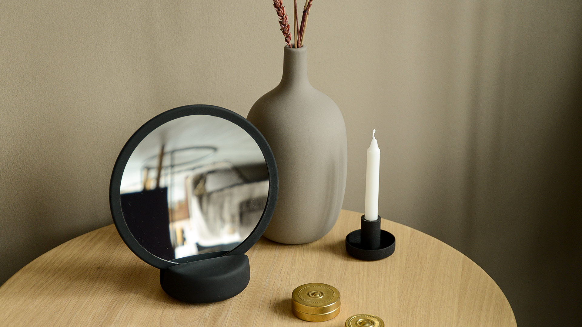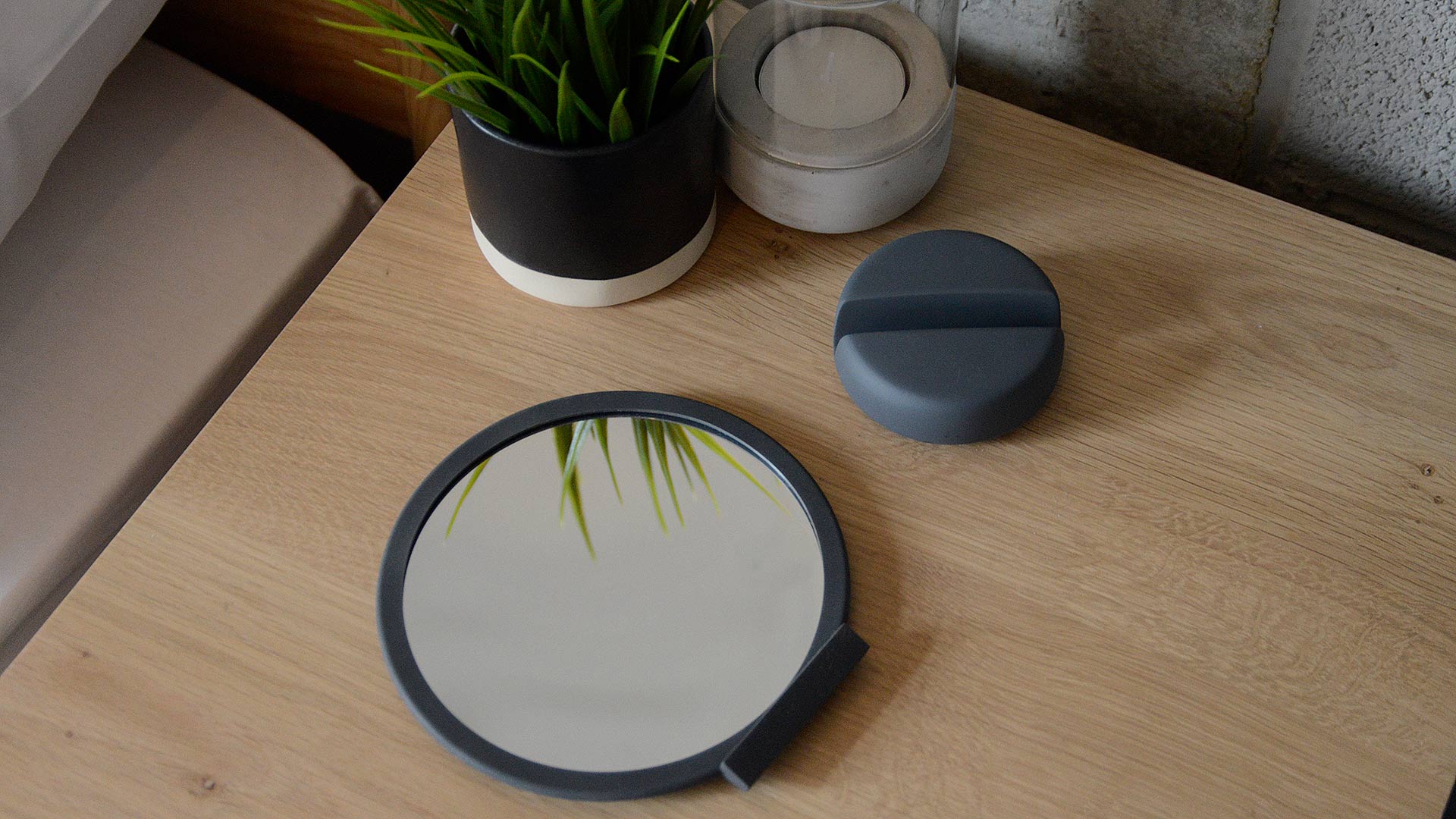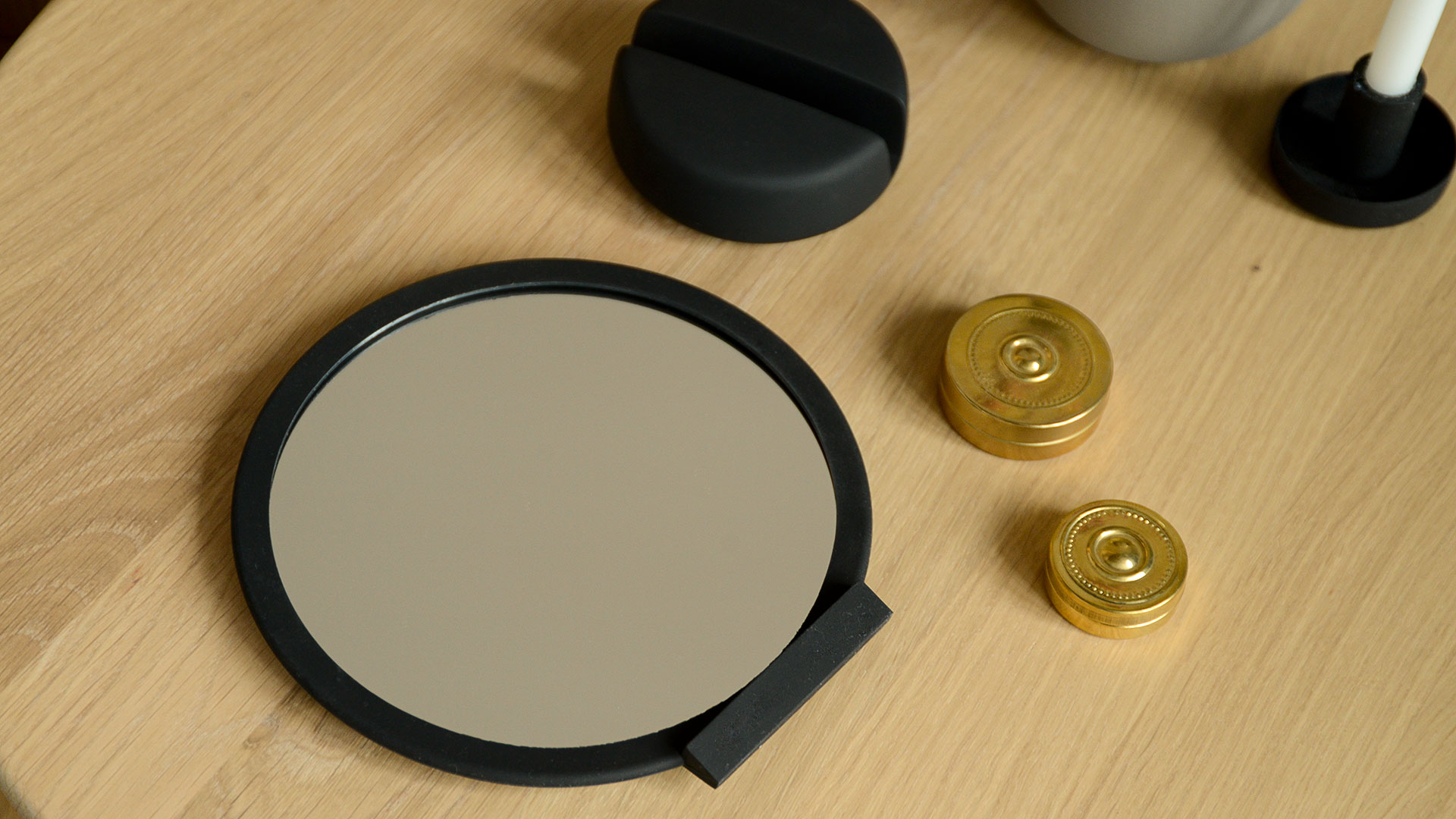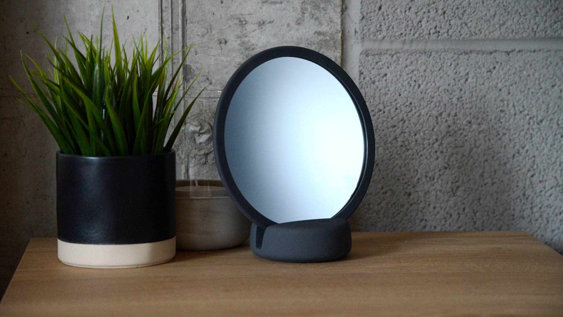 Stylish mirrors in contemporary, neutral shades. The mirror can be used as a hand-mirror or proped up with the use of a sturdy base to make a table-top mirror. Magnifies x5. Available in the following colours: