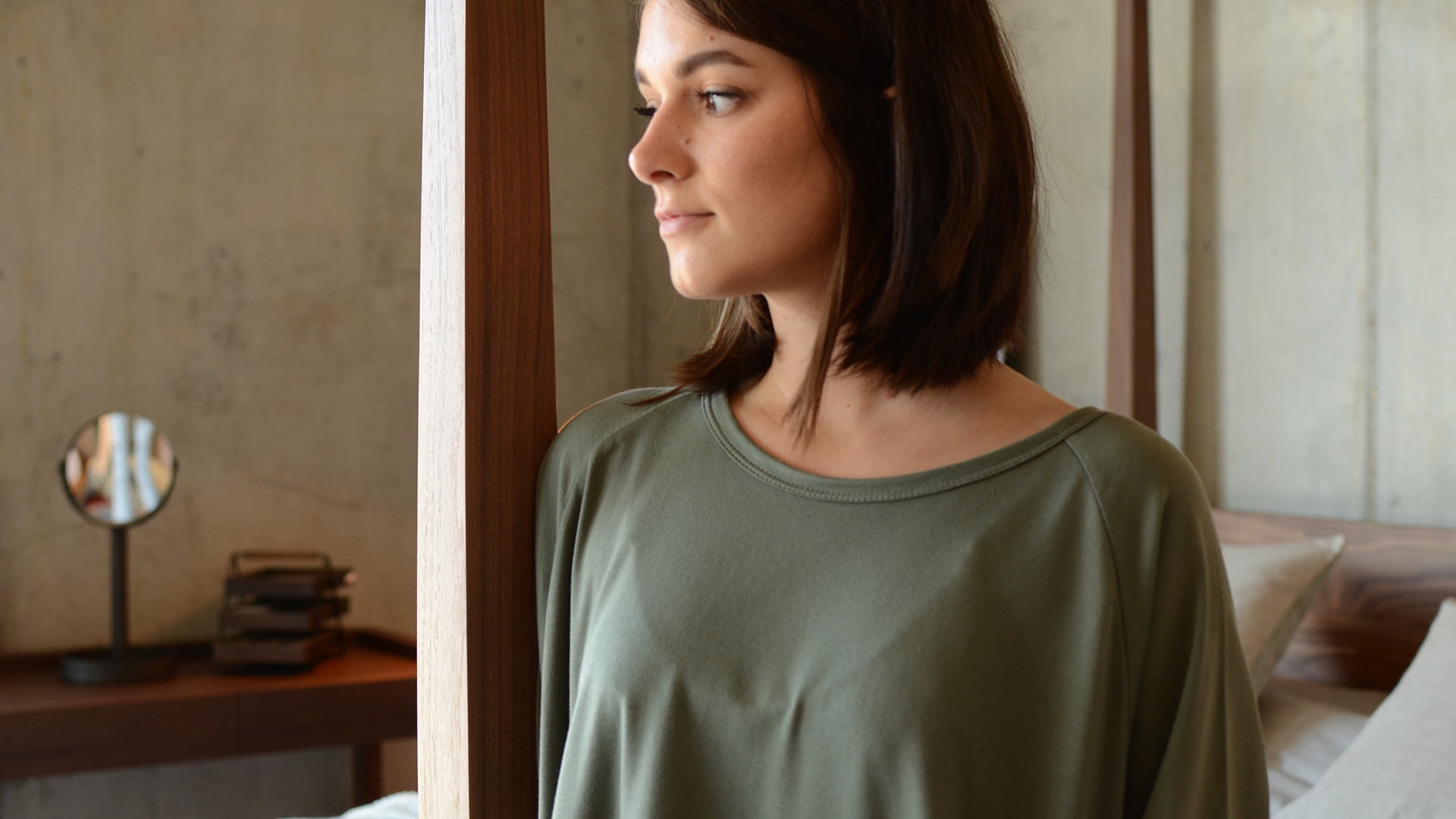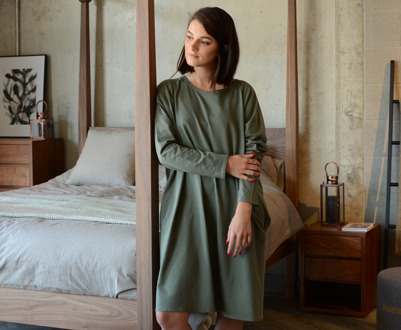 Part of our relaxed, luxury lounge-wear collection – a cotton rich jersey dress in a khaki, light weight fabric.