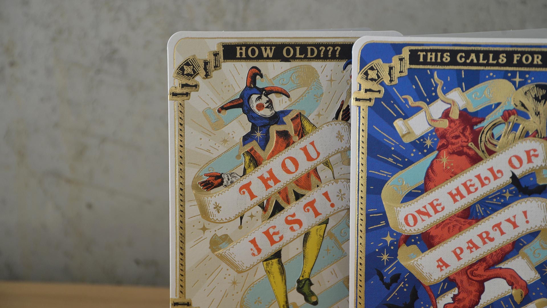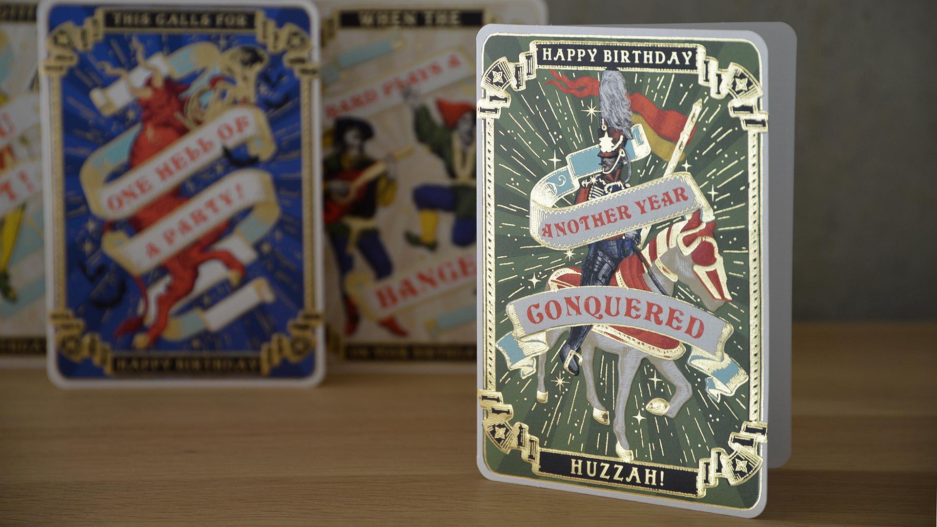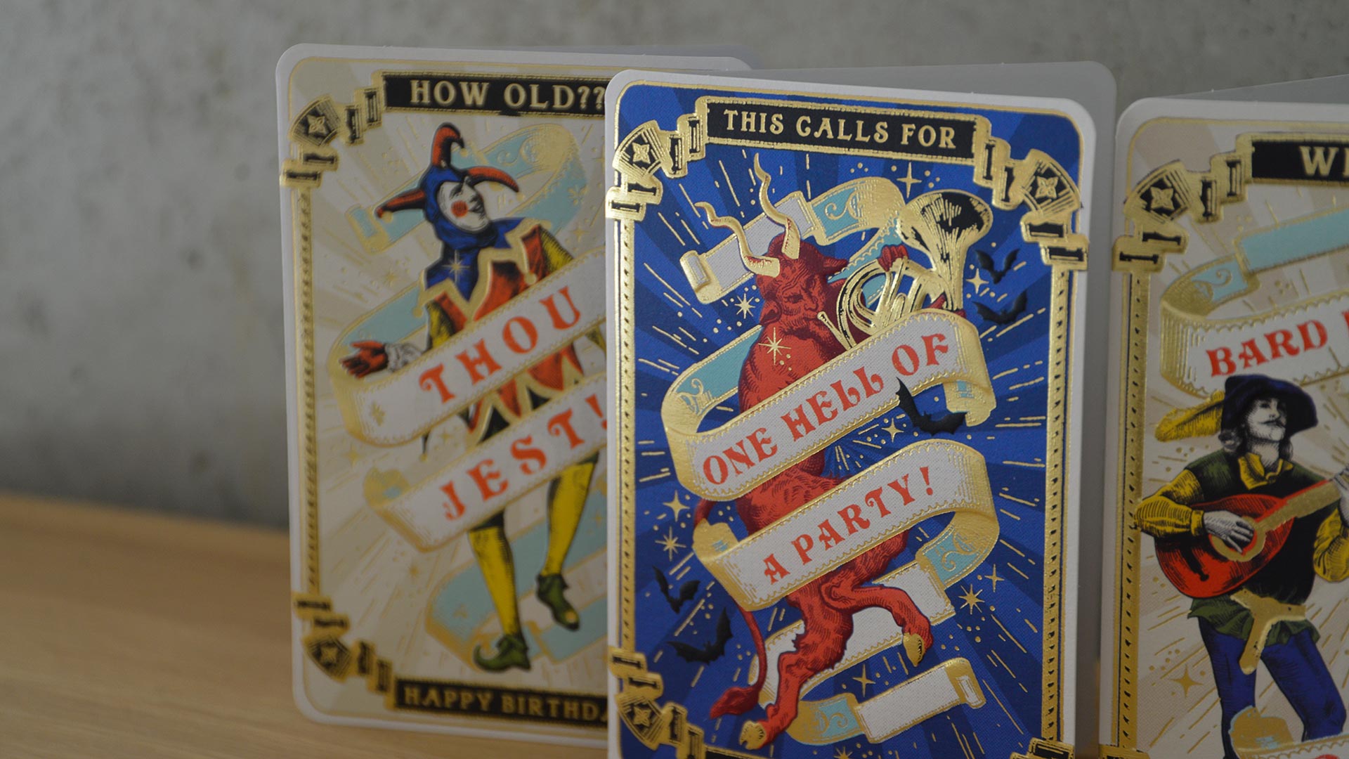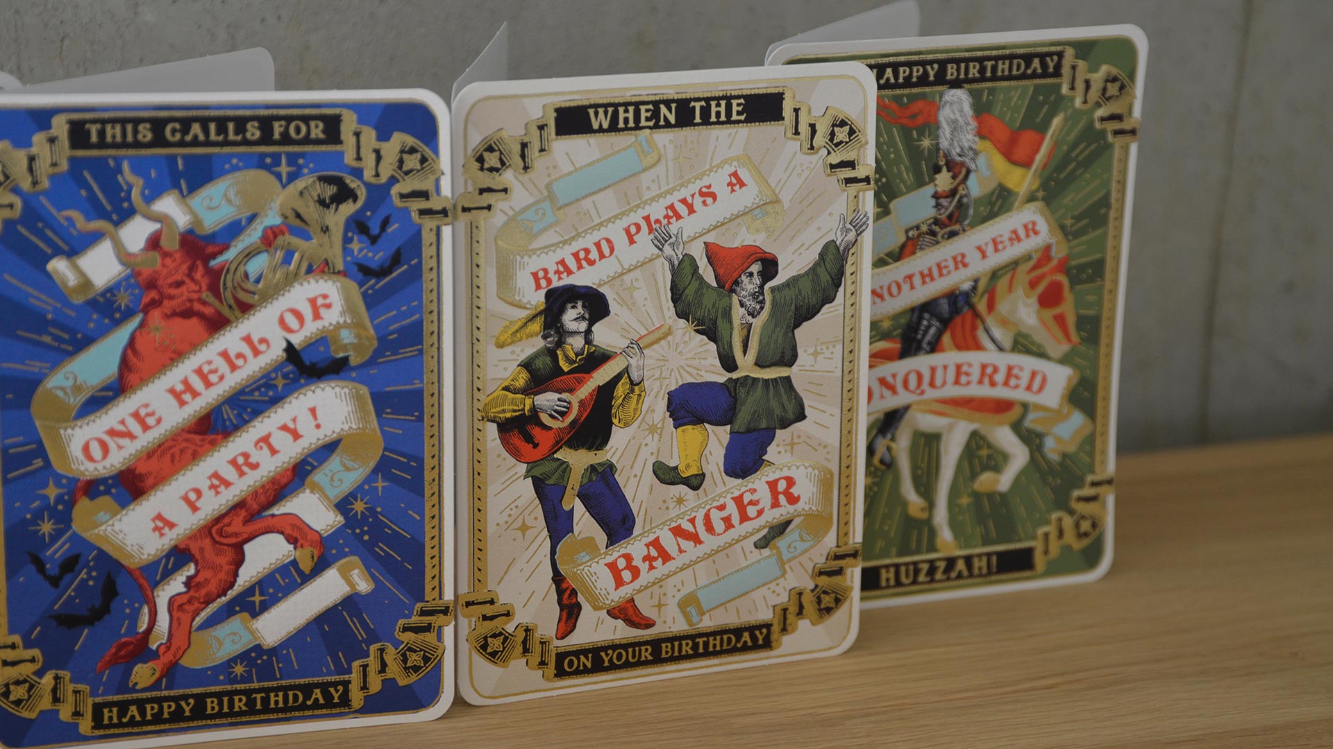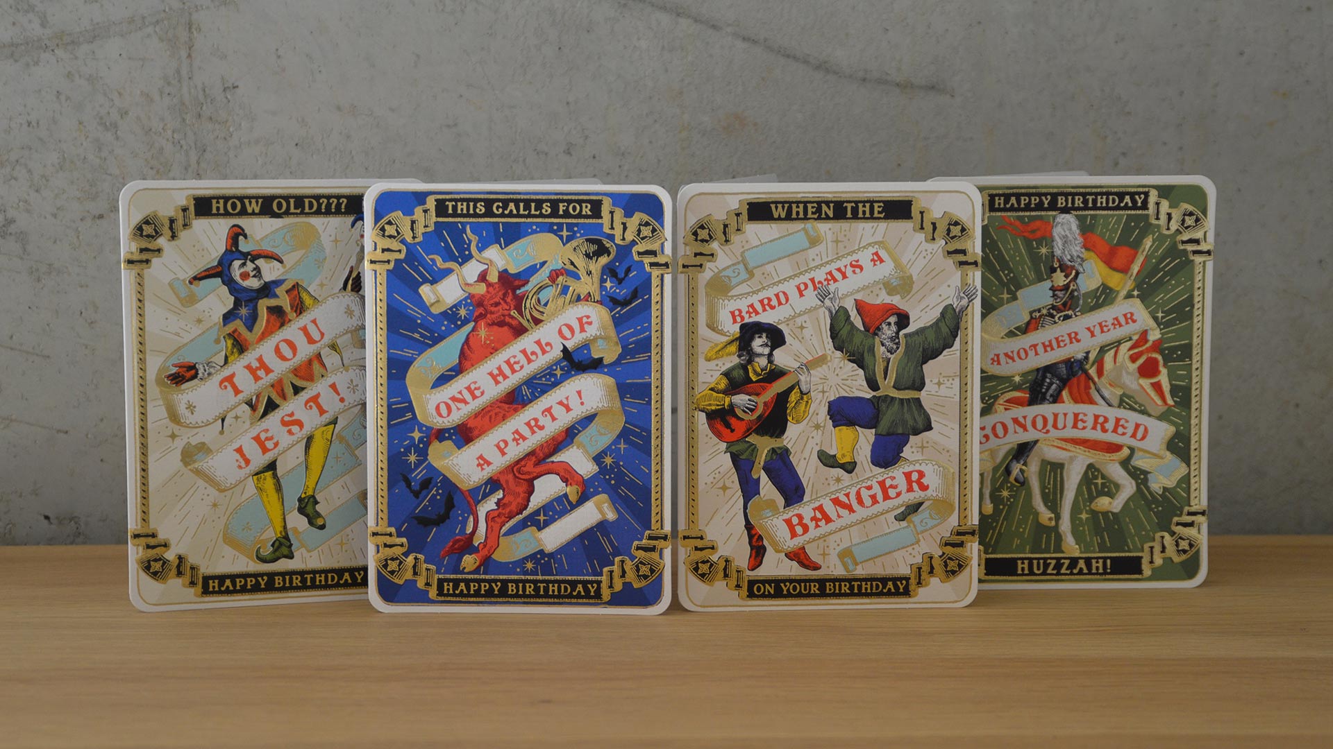 A set of 4 medieval style birthday cards – fun and playful designs wishing your loved one a happy birthday. Each card features a different design with gold foil accents, and the birthday card set includes all four – one of each design. Ideal for keeping on hand throughout the year for any special occasion or birthday that might pop up.