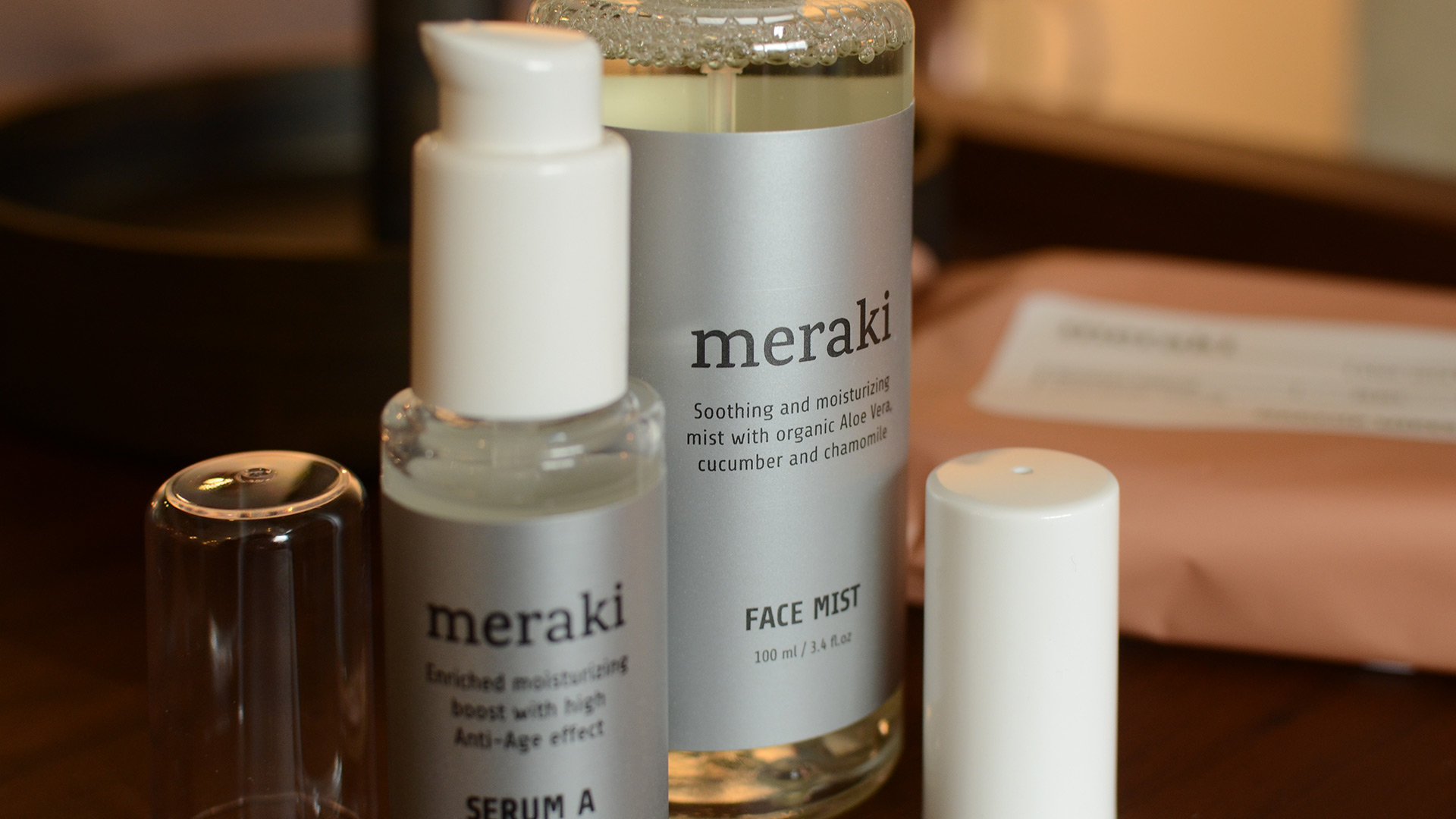 A collection of luxury face care products. The collection includes; a refreshing and moisturising facial mist and an anti-aging serum, along with gentle but effective cleansing wipes.
