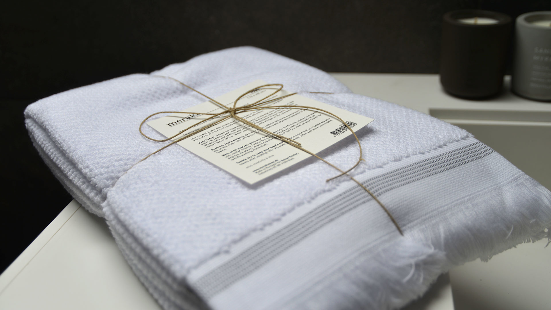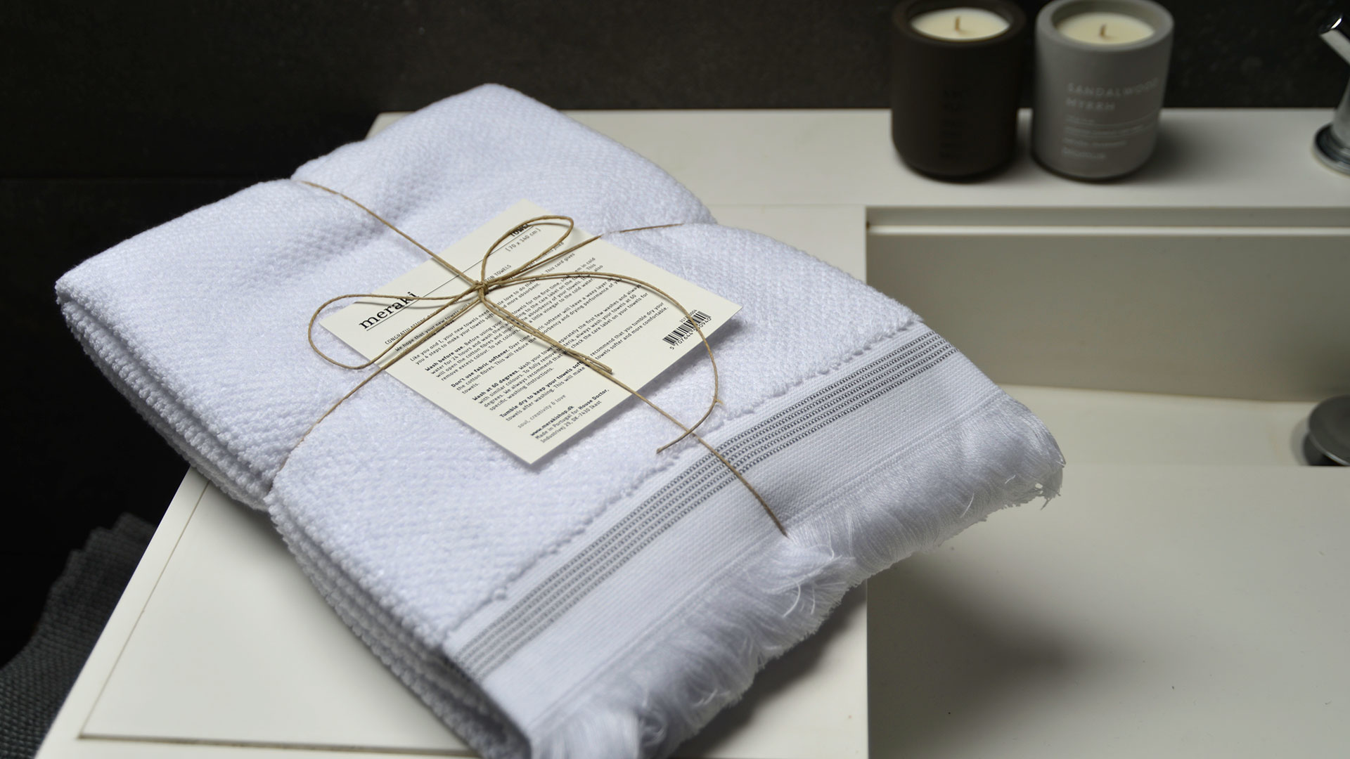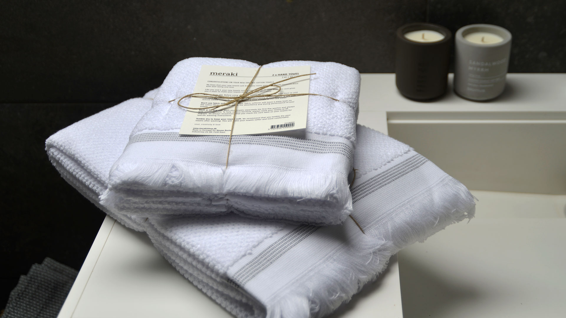 White organic cotton towels from Meraki. Create a luxurious spa feel in your bathroom using soft, pure cotton towels from Meraki. The towels are made from 100% cotton and are both soft and gentle to the skin. Available in a white terry fabric with a grey stripe detail to the edge and a long, fine fringe. Machine washable at 60 degrees and can tumble dry at high temperatures.