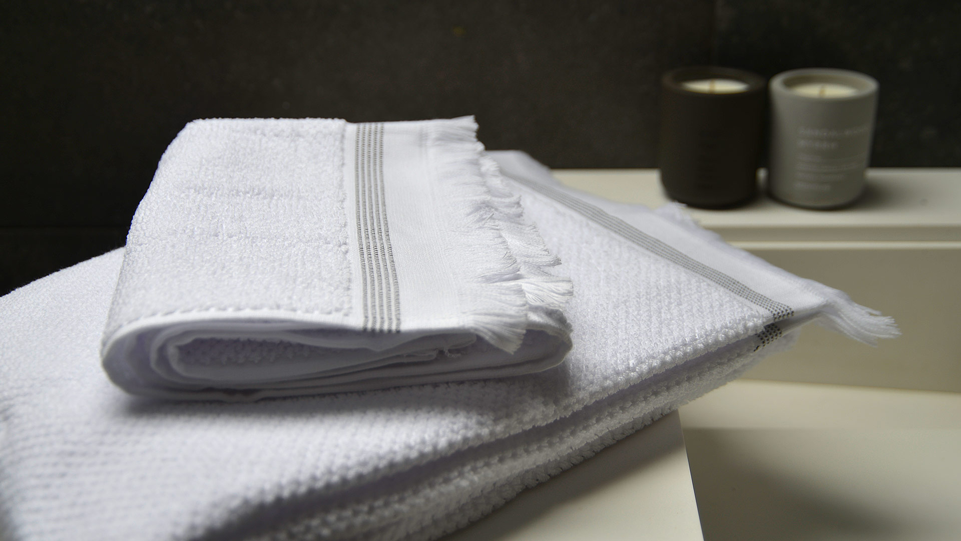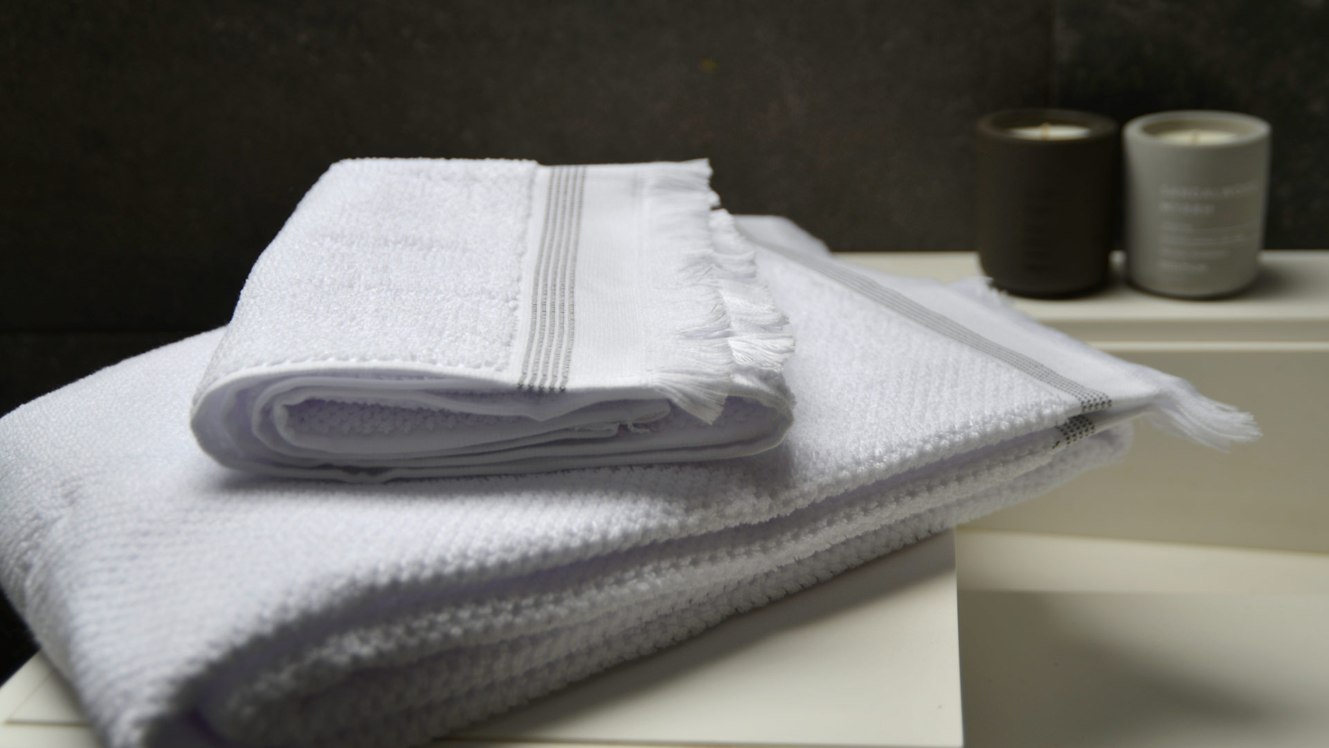 A collecion soft, luxurious organic cotton towels in a range of sizes. These towels are a white terry fabric with a grey stripe detail to the edge and a long, fine fringe detail on the towels.