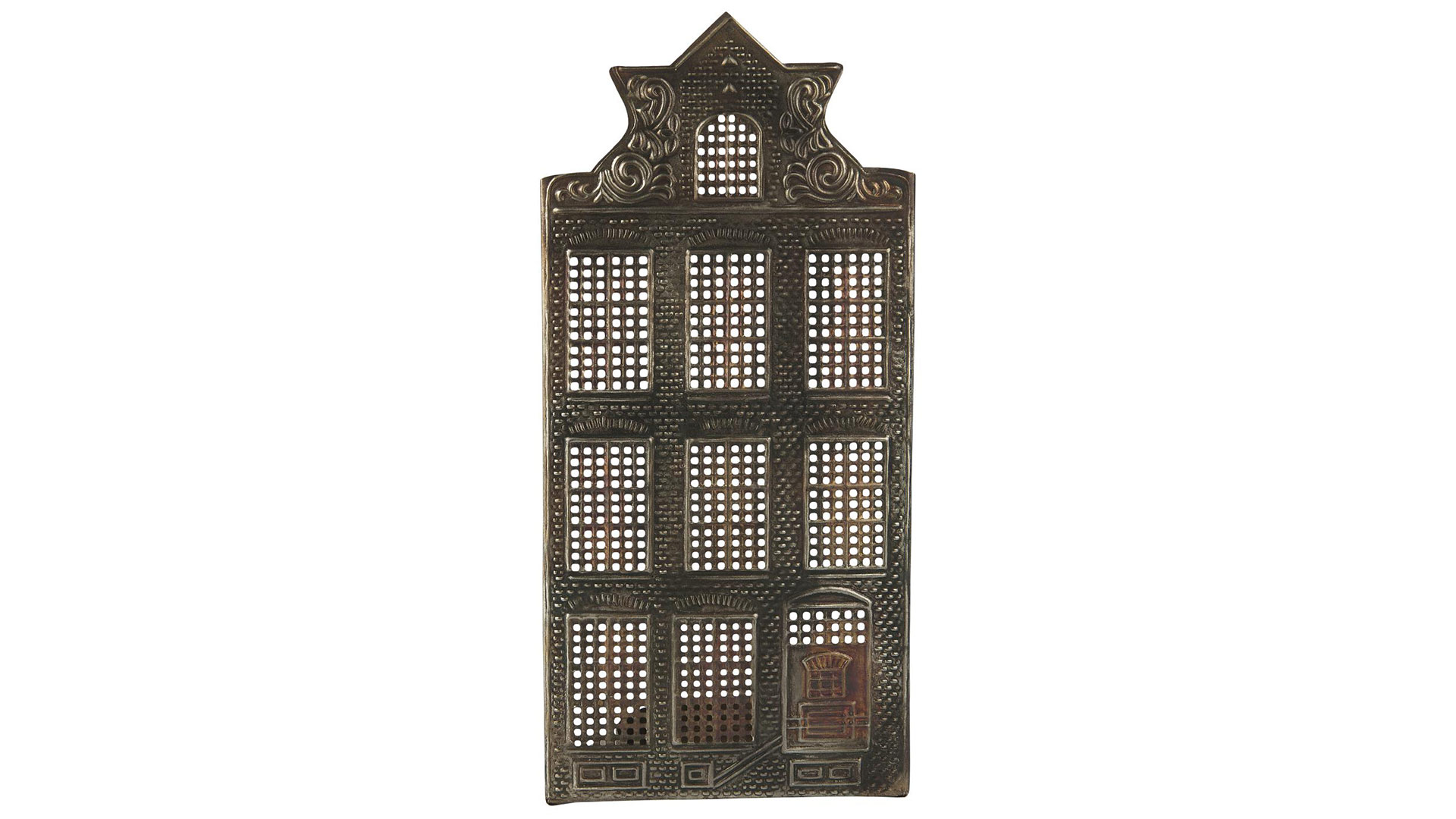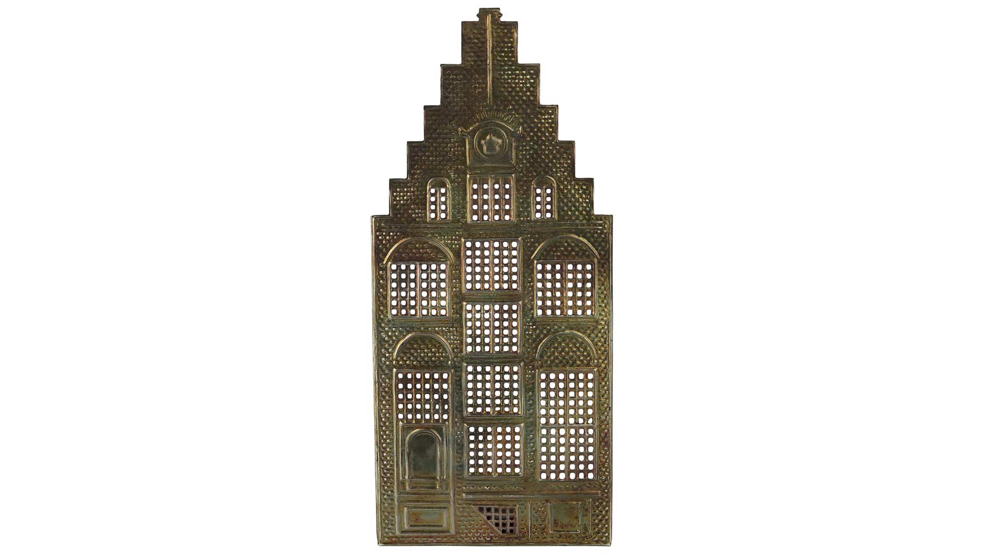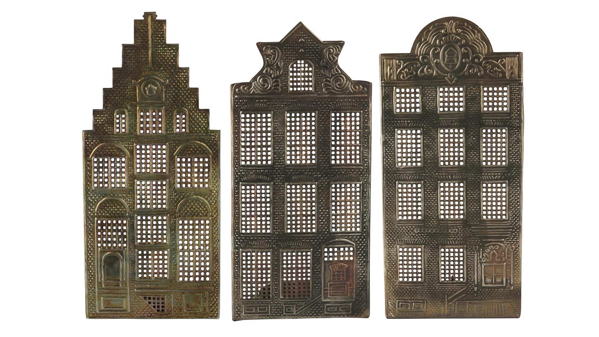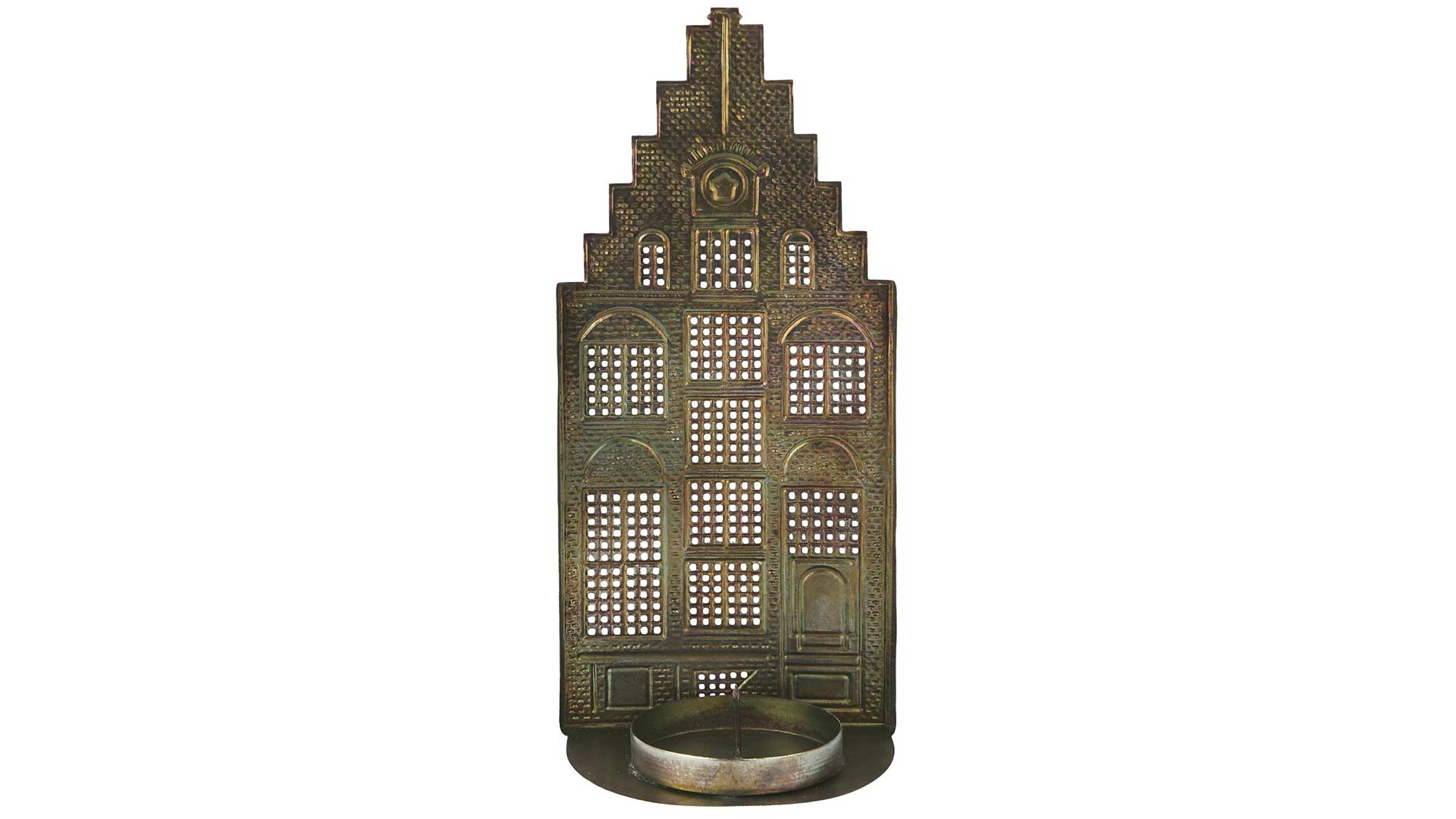 Metal house candle holders available in three styles. Light weight, pressed metal candle holders with a burnished, dark brass or copper finish.