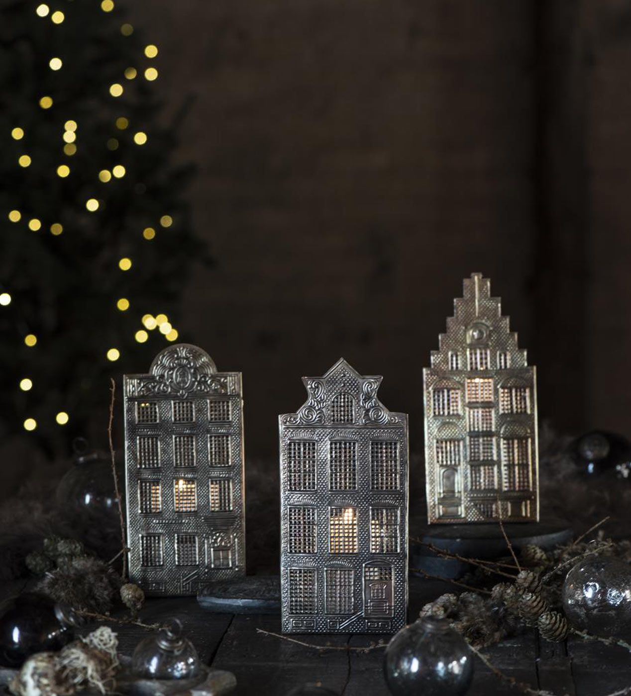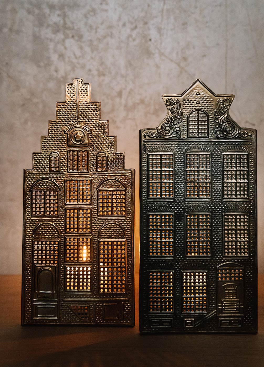 These pretty metal house candle holders are available in three styles. Each light weight, pressed metal candle holder takes a large T-light or small pillar candle (maximum diameter 7cm). They have a burnished, dark brass or copper finish.