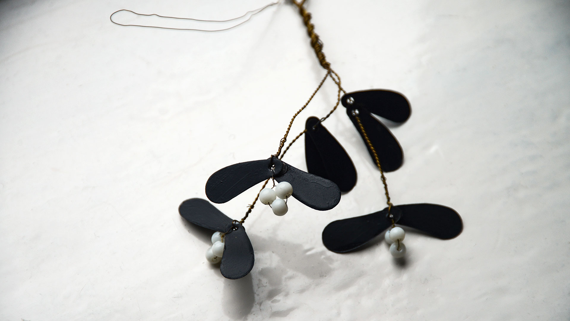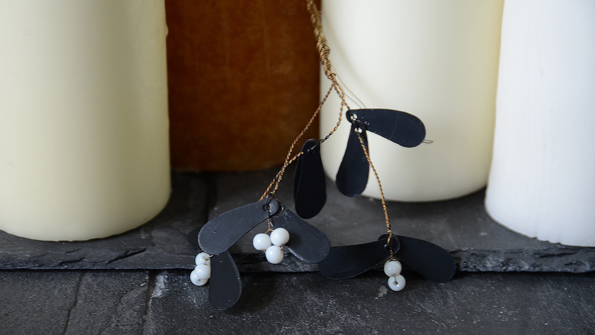 A set of Metal Mistletoe Christmas decoration, designed to hang on the branches of your Christmas tree, or above a doorway! Made up of black metal ‘leaves’, white beads and brass colour wire hanger. A simple yet stylish decoration, perfect for tying together modern and traditional styles. Post out to family and friends to share the festive spirit, or decorate gifts with an extra flourish!