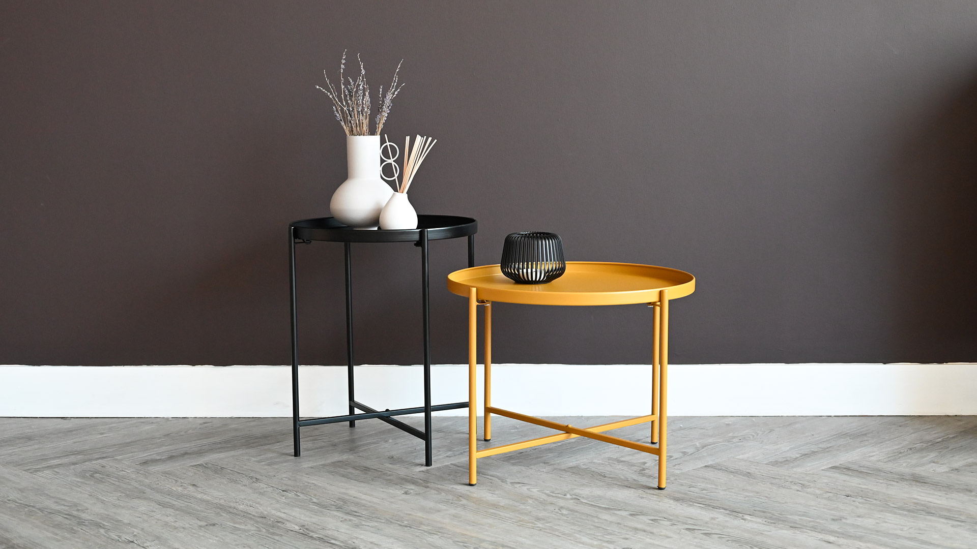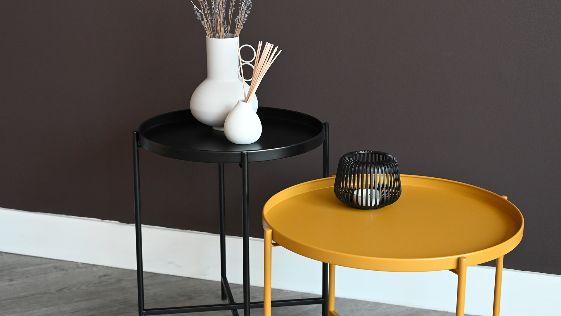 Black side table is only available in small size, ochre yellow side table is only available in large size.