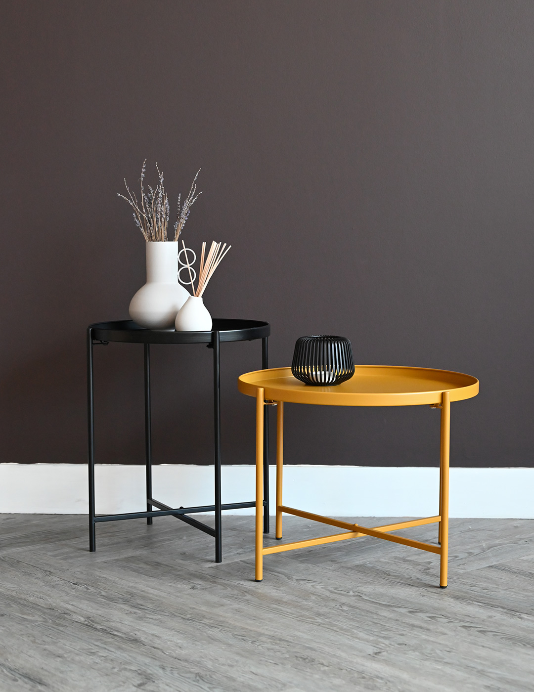 Round side tables available in either a small size in black or larger size in ochre yellow. Perfect individually or, as a unique coffee table when used together. More information can be found below.
