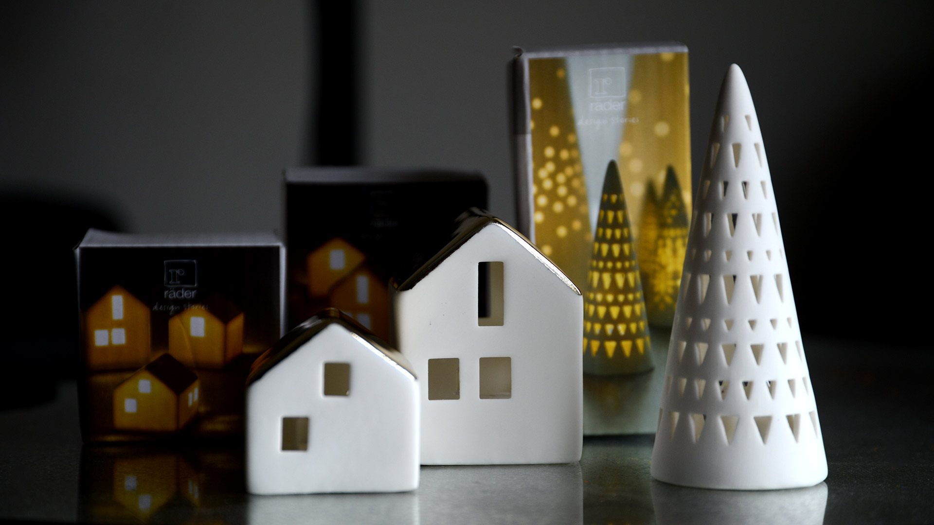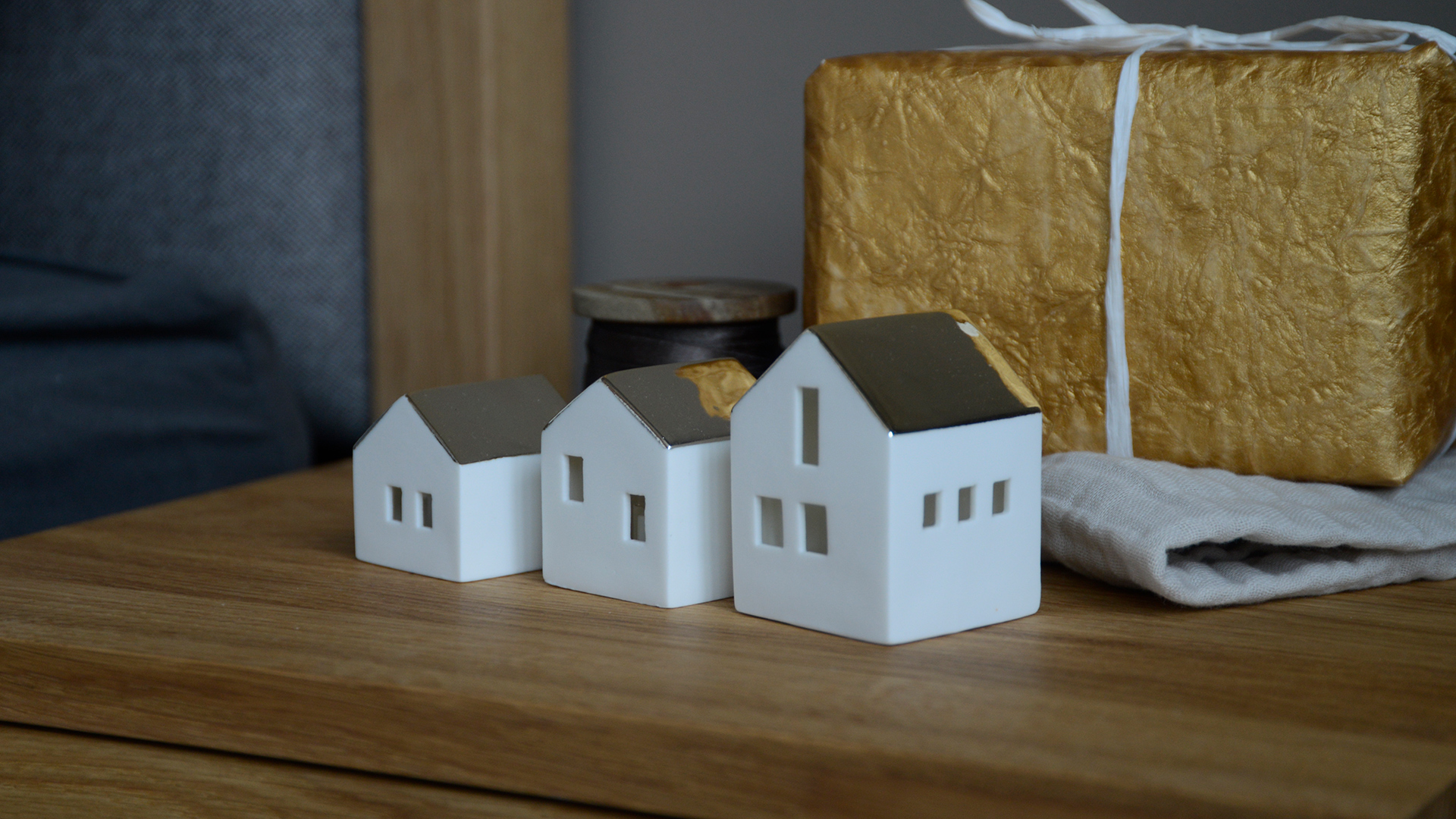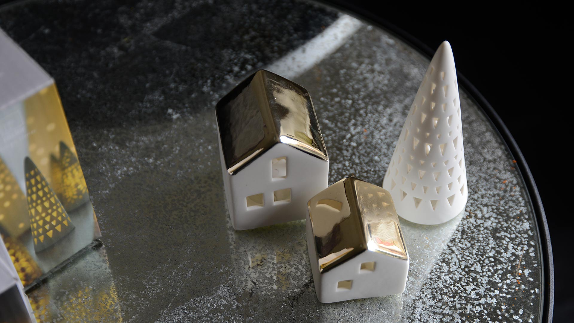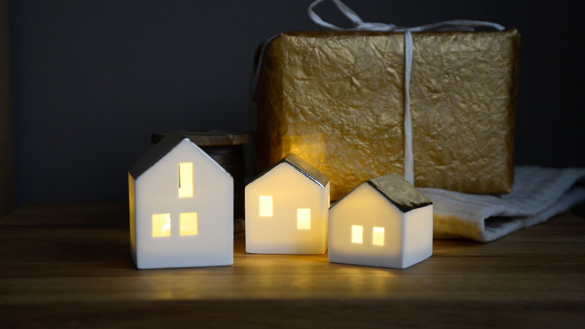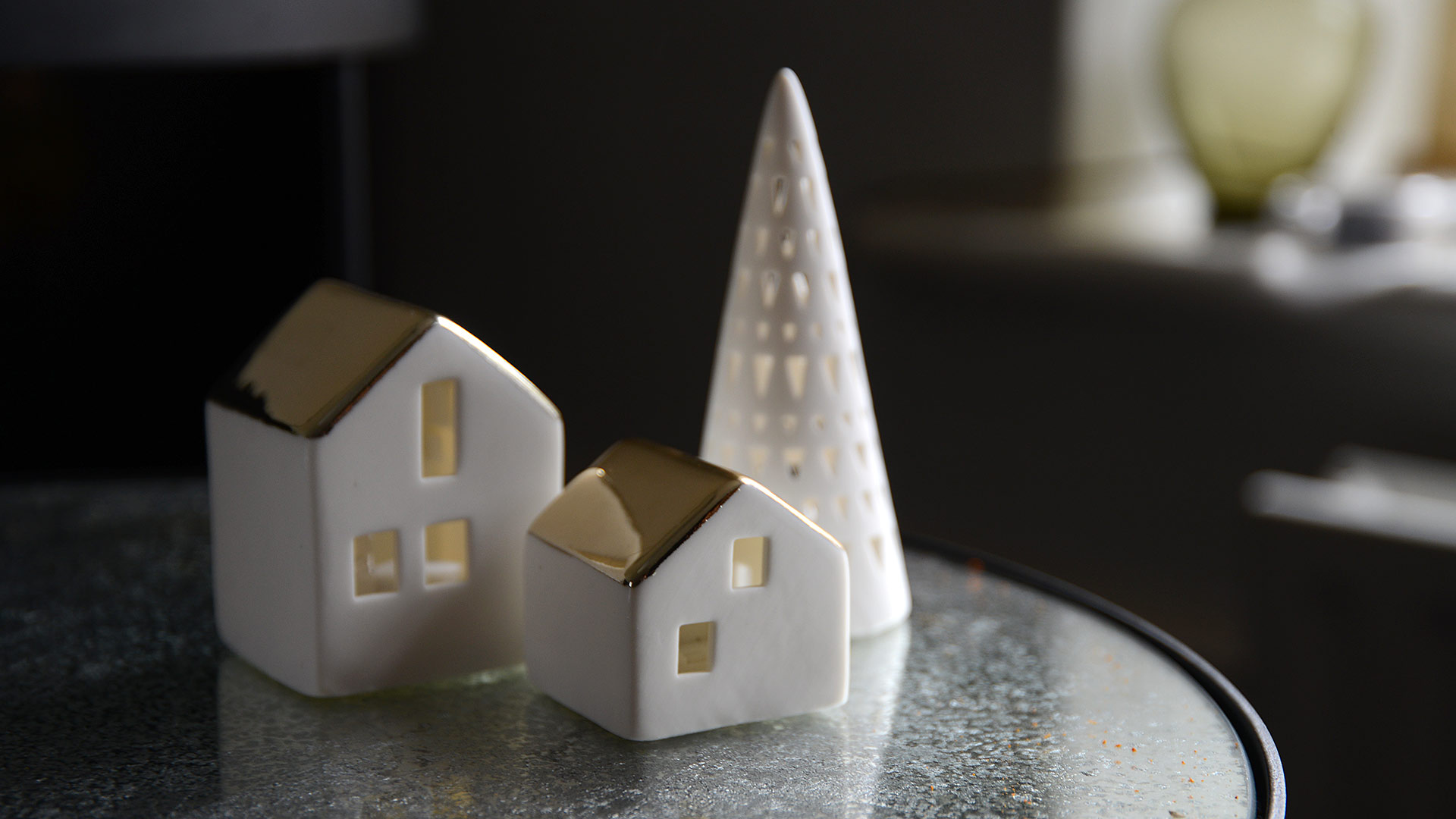 A trio of porcelain light up houses with glazed-gold roofs, with each house featuring a different window pattern. These small light-up houses make a great addition to any festive display, both on their own or as a group.