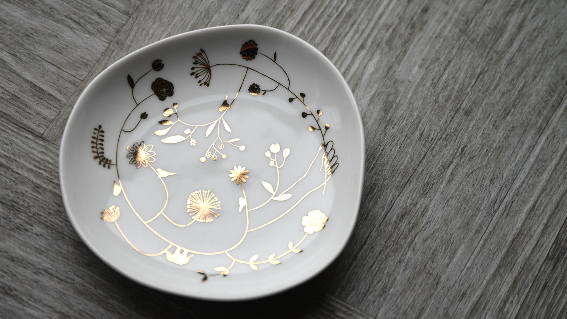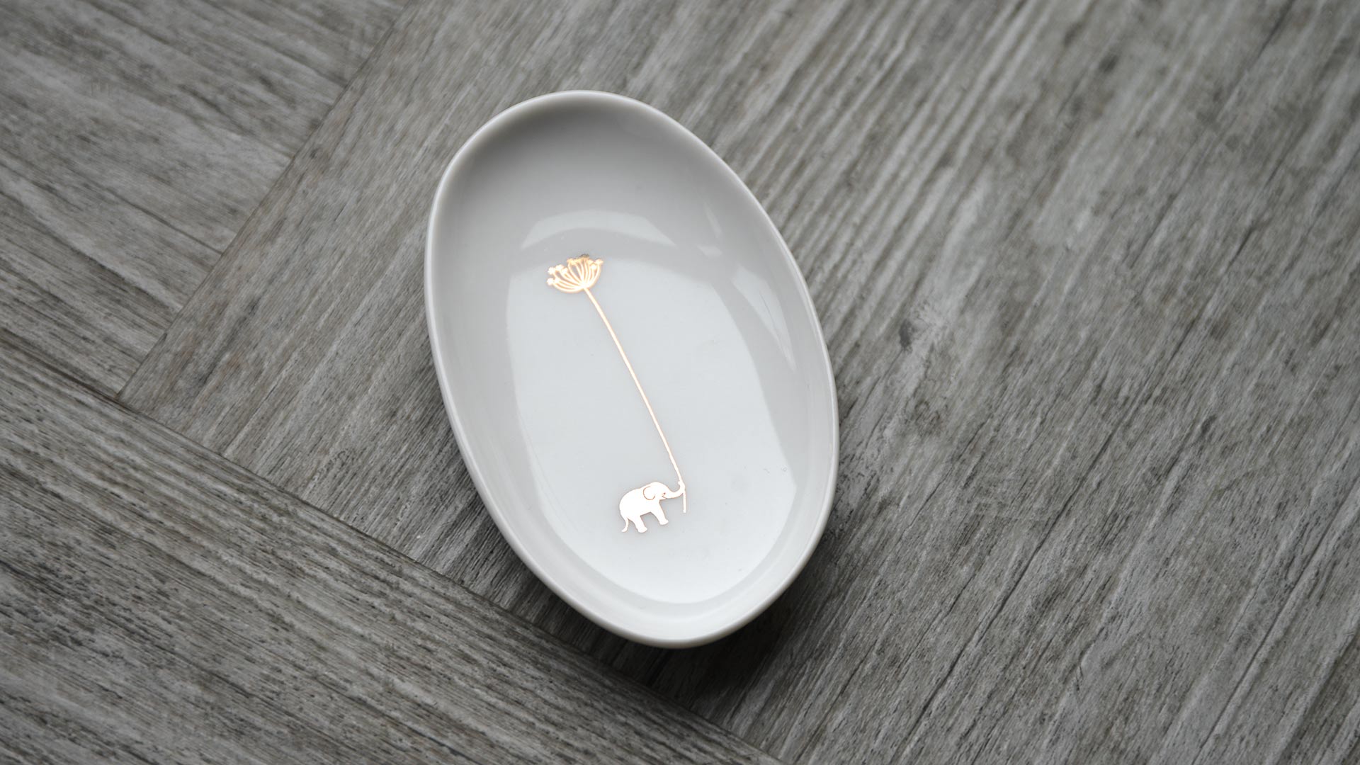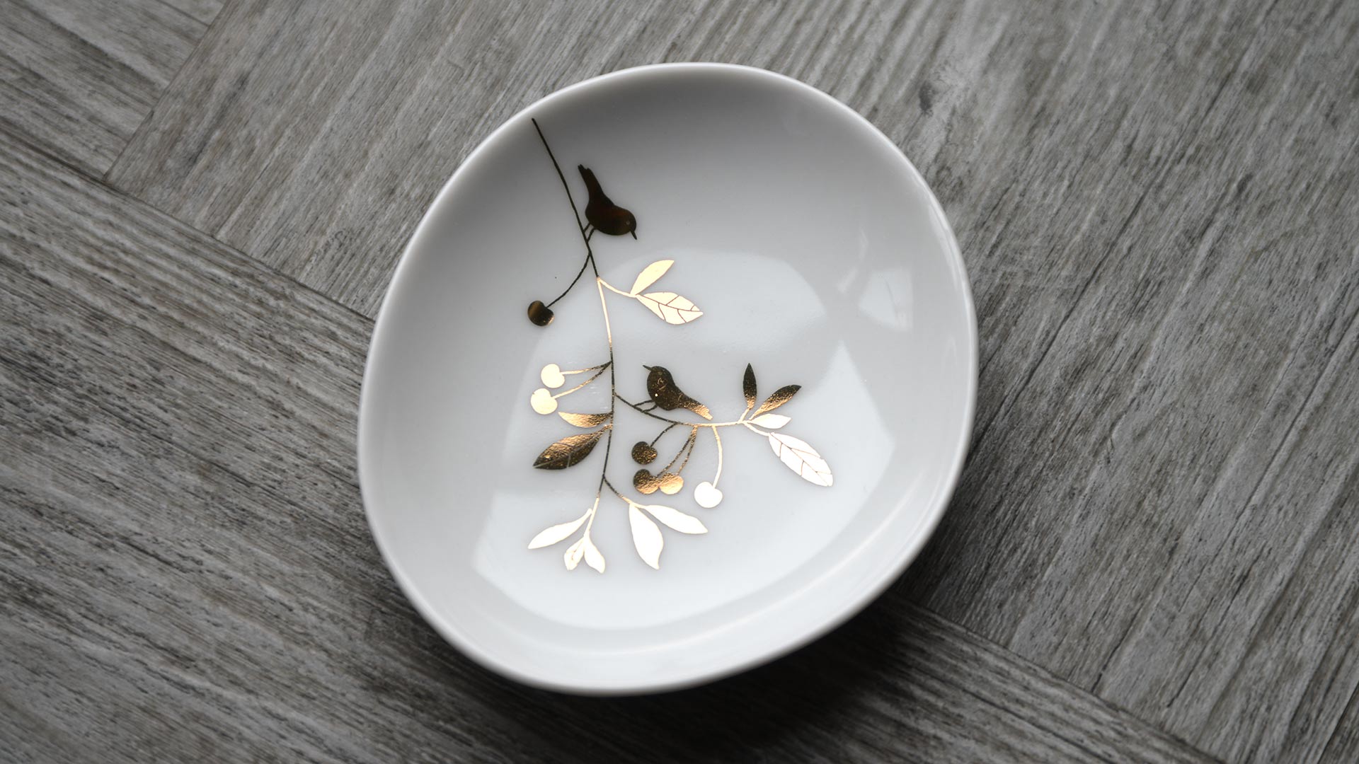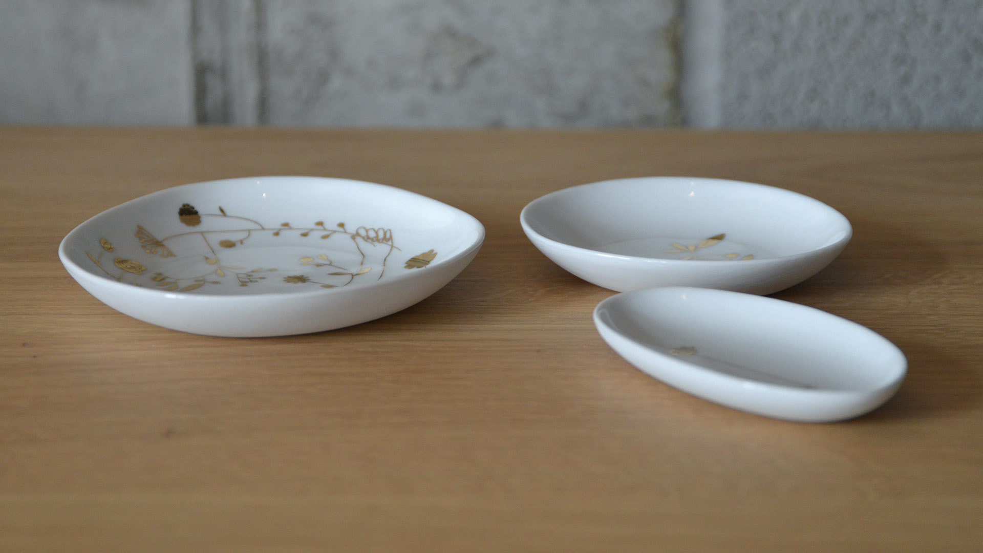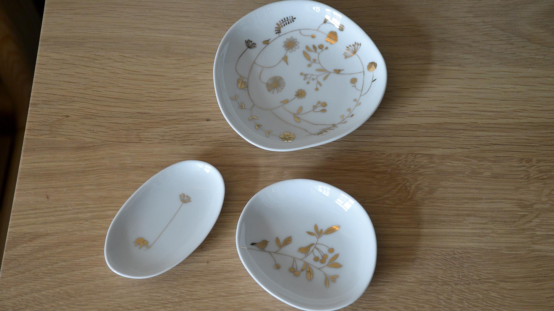 A set of mini porcelain dishes with beautiful, delicate decoration in gold. The motifs have a modern folklore quality, with decorations of flowers, leaves, elephants and birds. These lovely dishes are perfect for your dressing table or hall table, or make perfect dishes for petit fours.