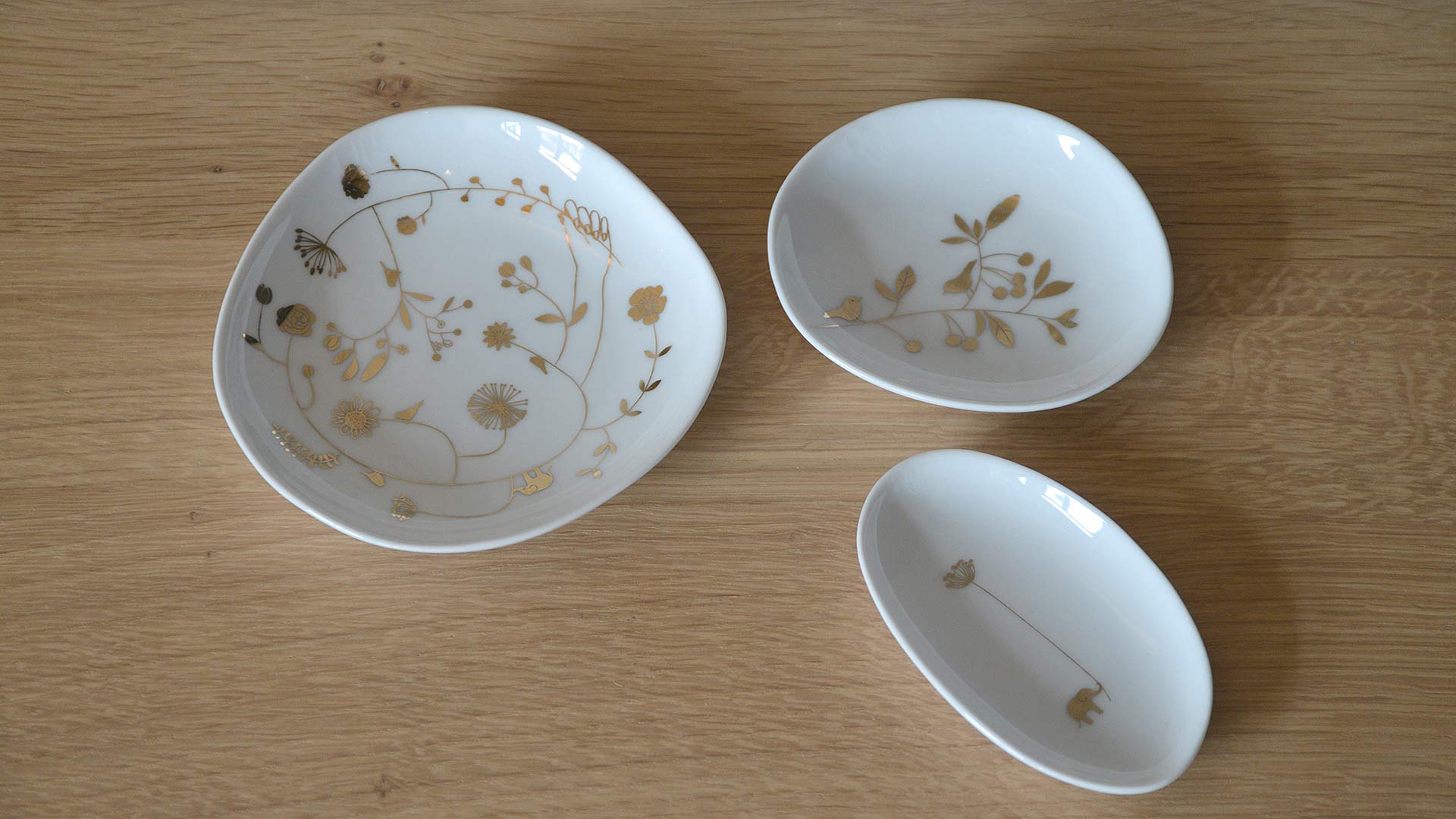 A set of mini porcelain dishes with beautiful, delicate decoration in gold. The motifs have a modern folklore quality incorporating, flowers, birds and an elephant!