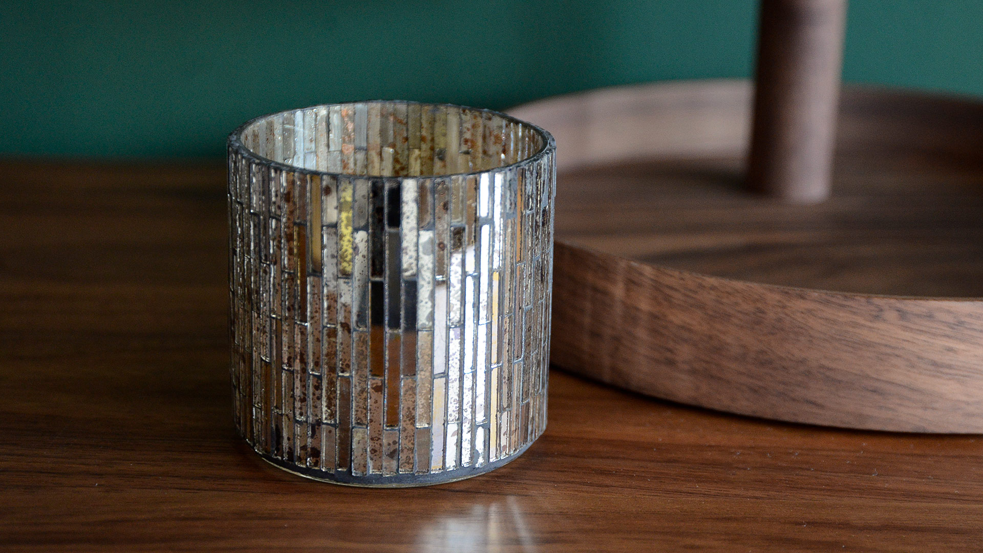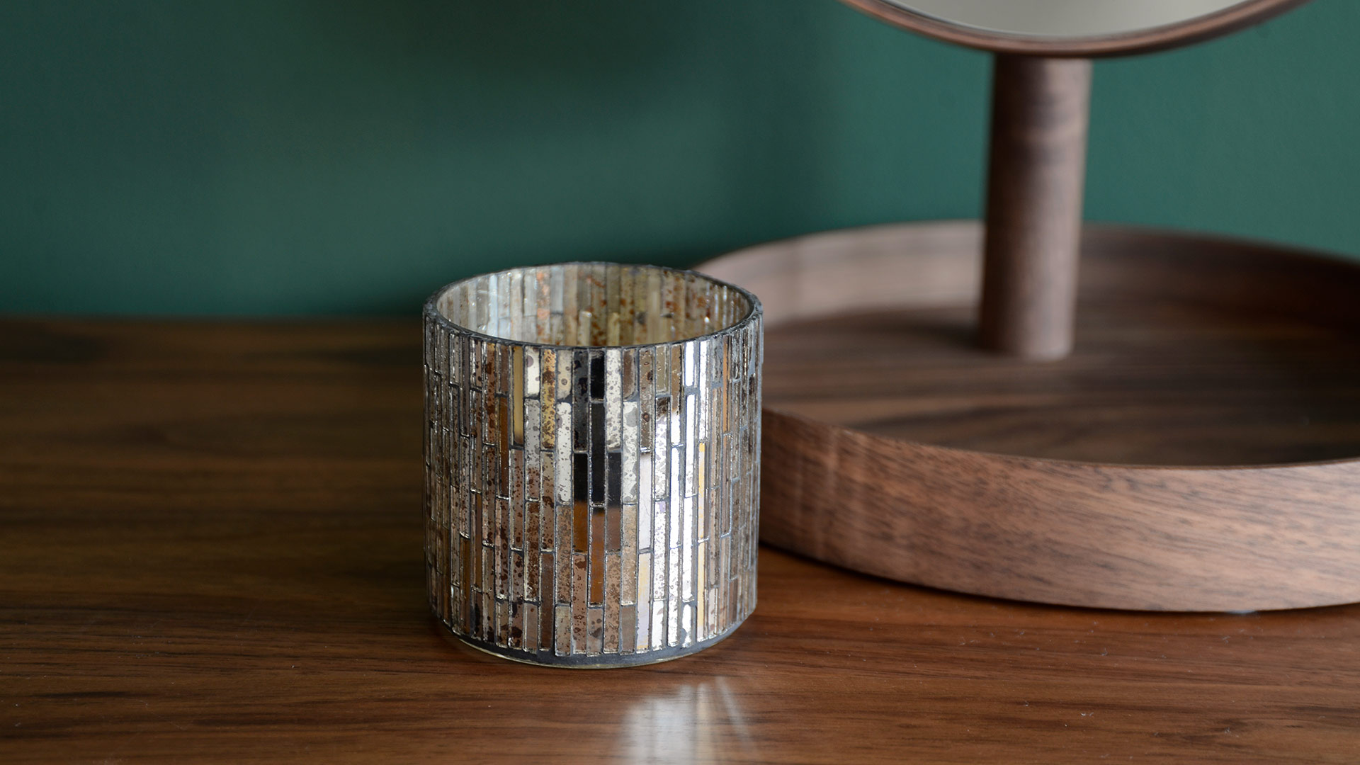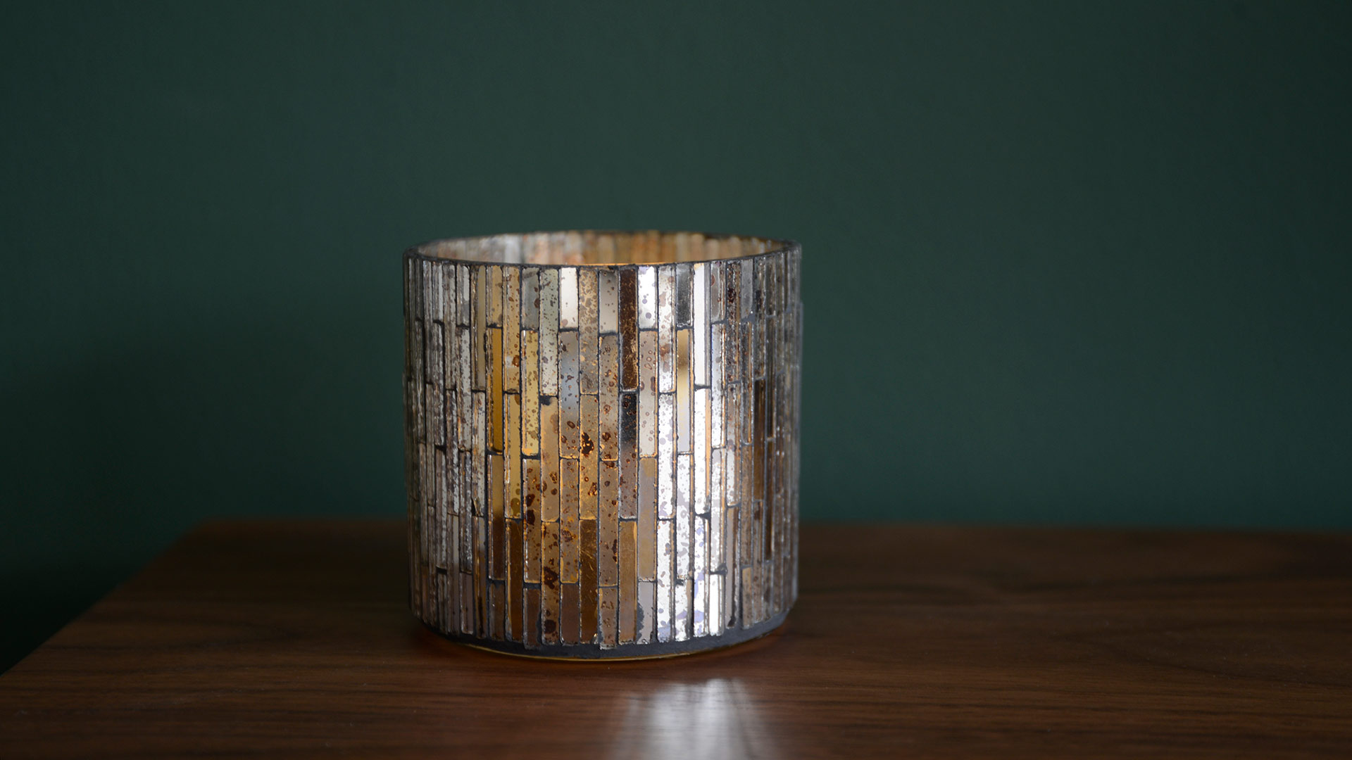 These mirrored glass tea-light holders feature a mosaic design – with silver, gold and distressed finishes to the glass sections. This modern candle holder holds a small or large size tealight (5.7cm diameter approximately). Can be used for its intended purpose as a tea-light holder, as a simple decorative feature or to hold small trinkets! Sold as a set of two glass tea-light holders.