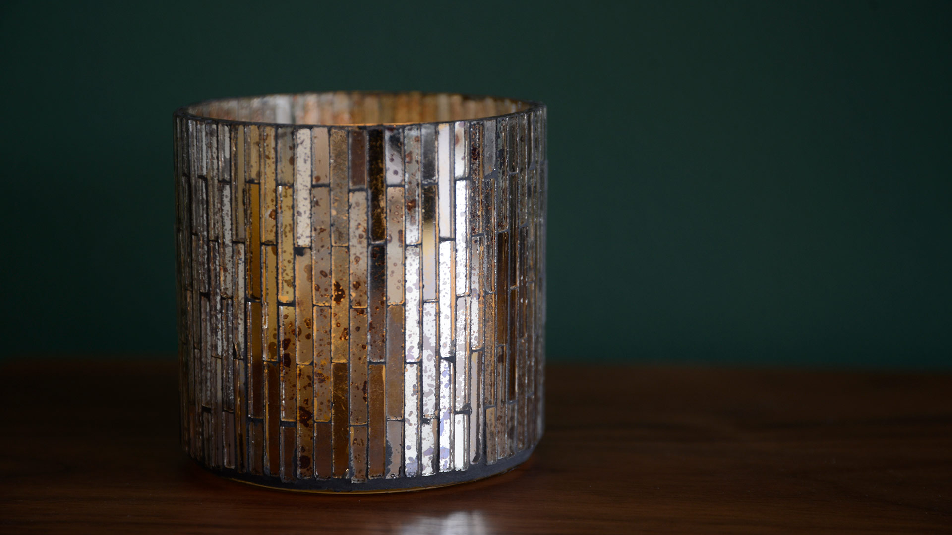 Glass tea-light holder made us of rectangles of mirrored glass – with a range of finishes – gold, silvered and mottled. Sold as a set of two glass tea-light holders.