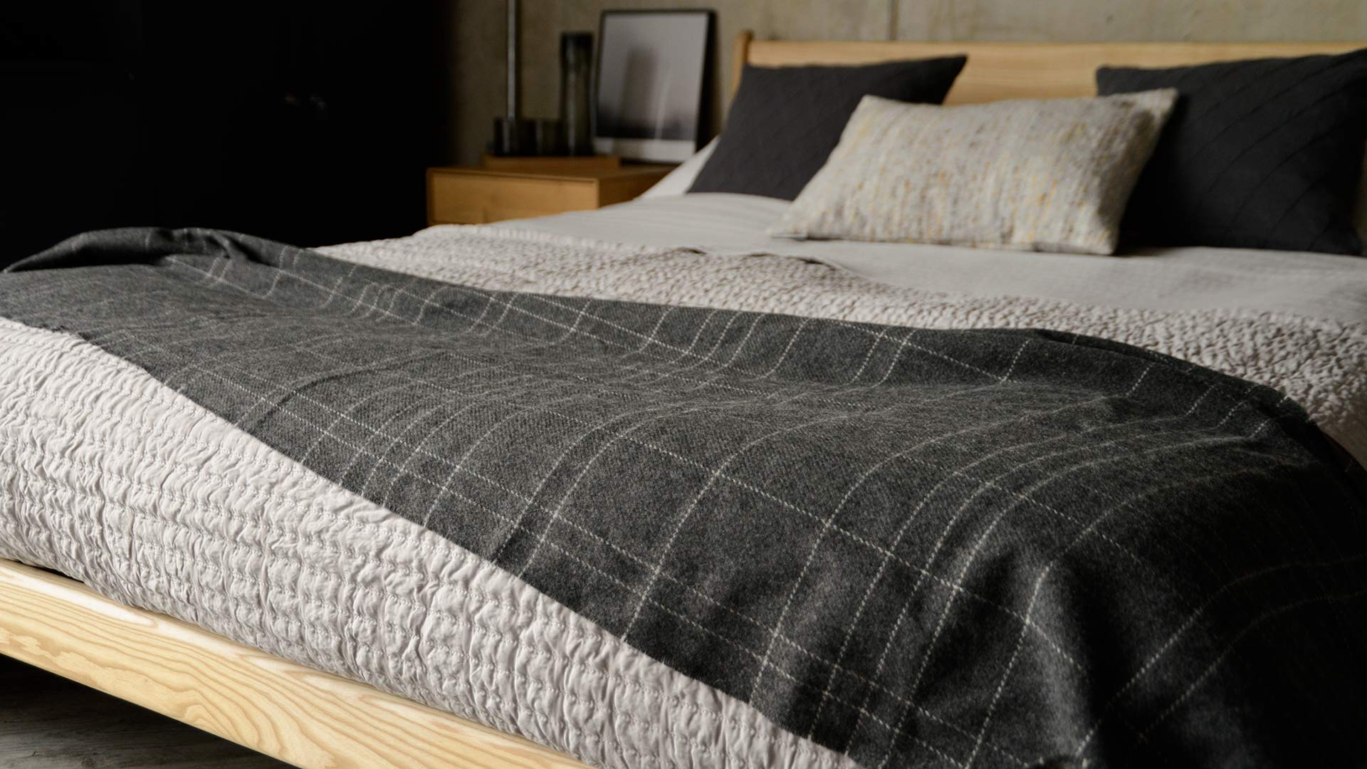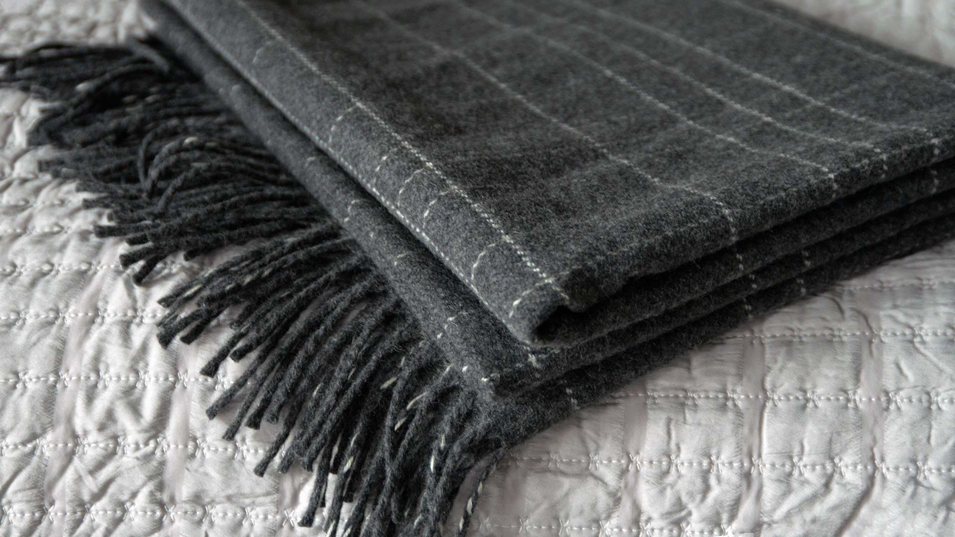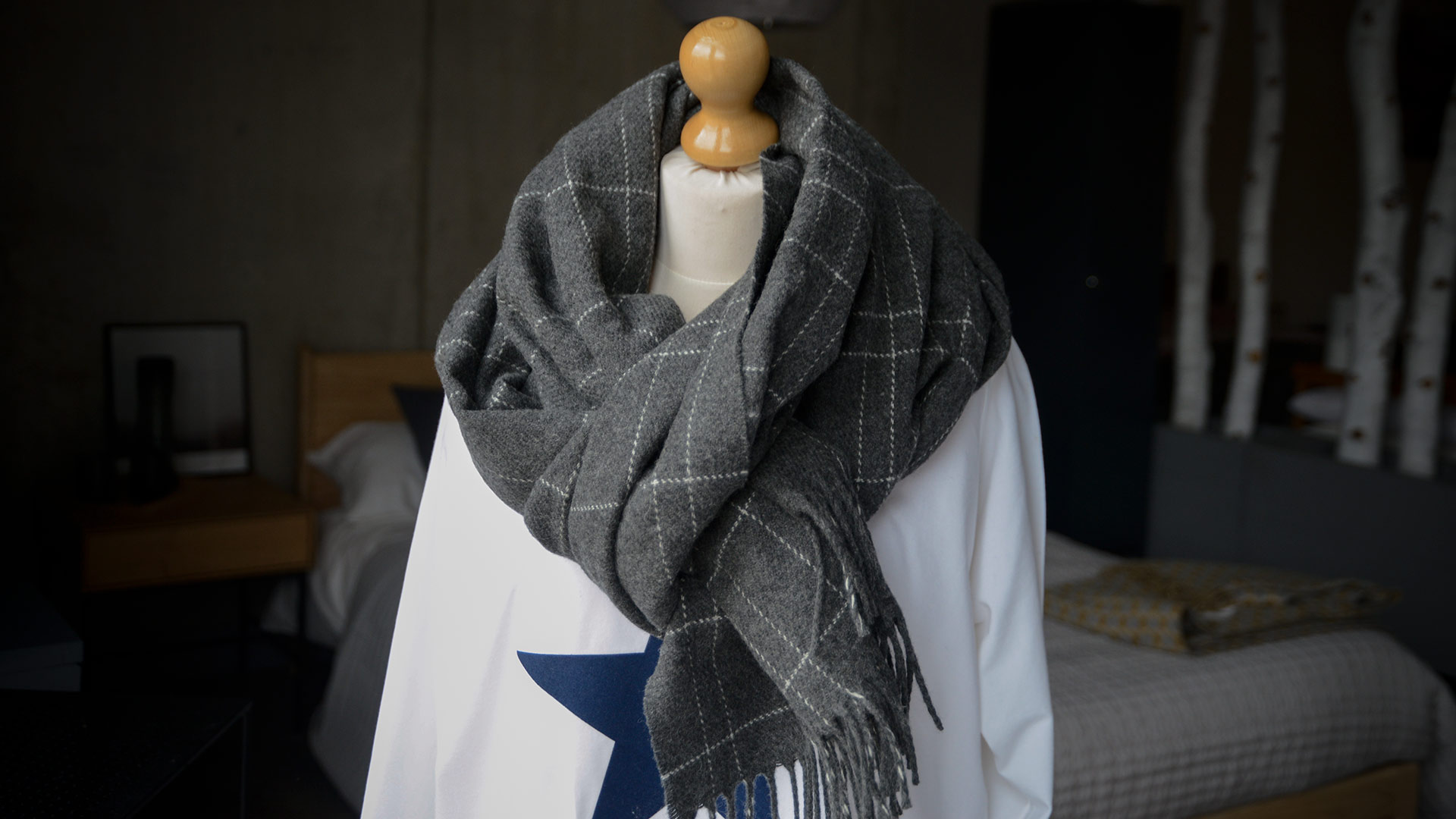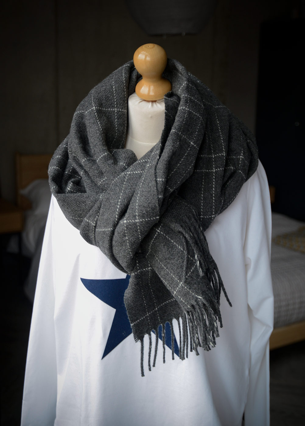 A stylish, modern bed runner or pashmina in pure Merino lambswool. Large enough that it can be used as a pashmina style wrap, or as a throw for over the end of your bed. In dark grey, with a contemporary double ‘windowpane’ style grid pattern. The two fringed edges are in deep grey. A flexible piece that you can use as a wrap to keep you cosy in winter, but you don’t need to store it away in summer – just use it over the end of your bed!