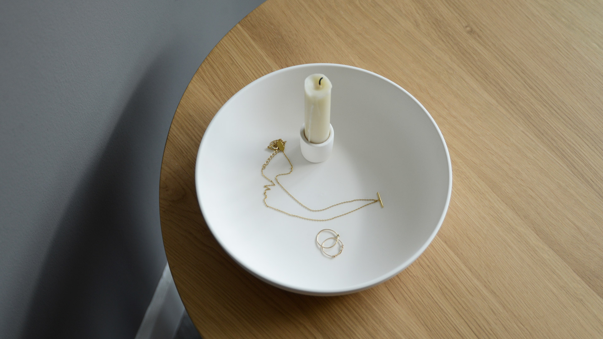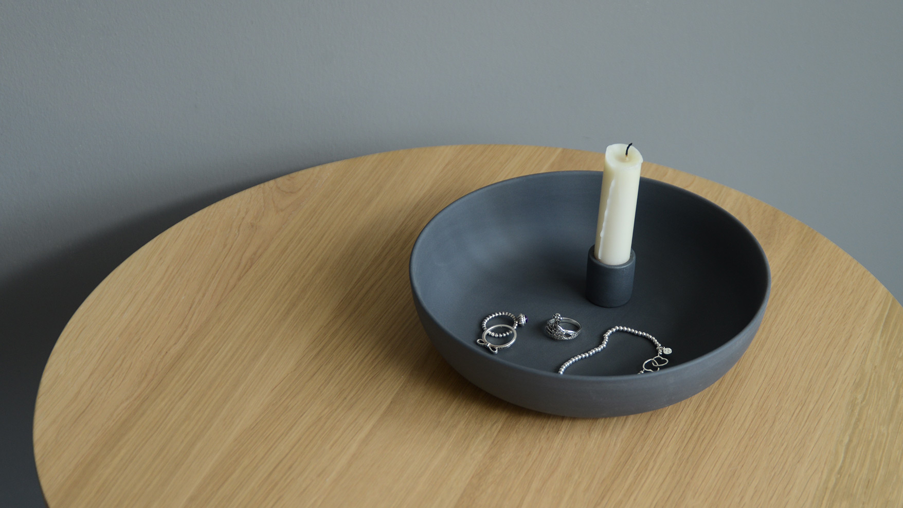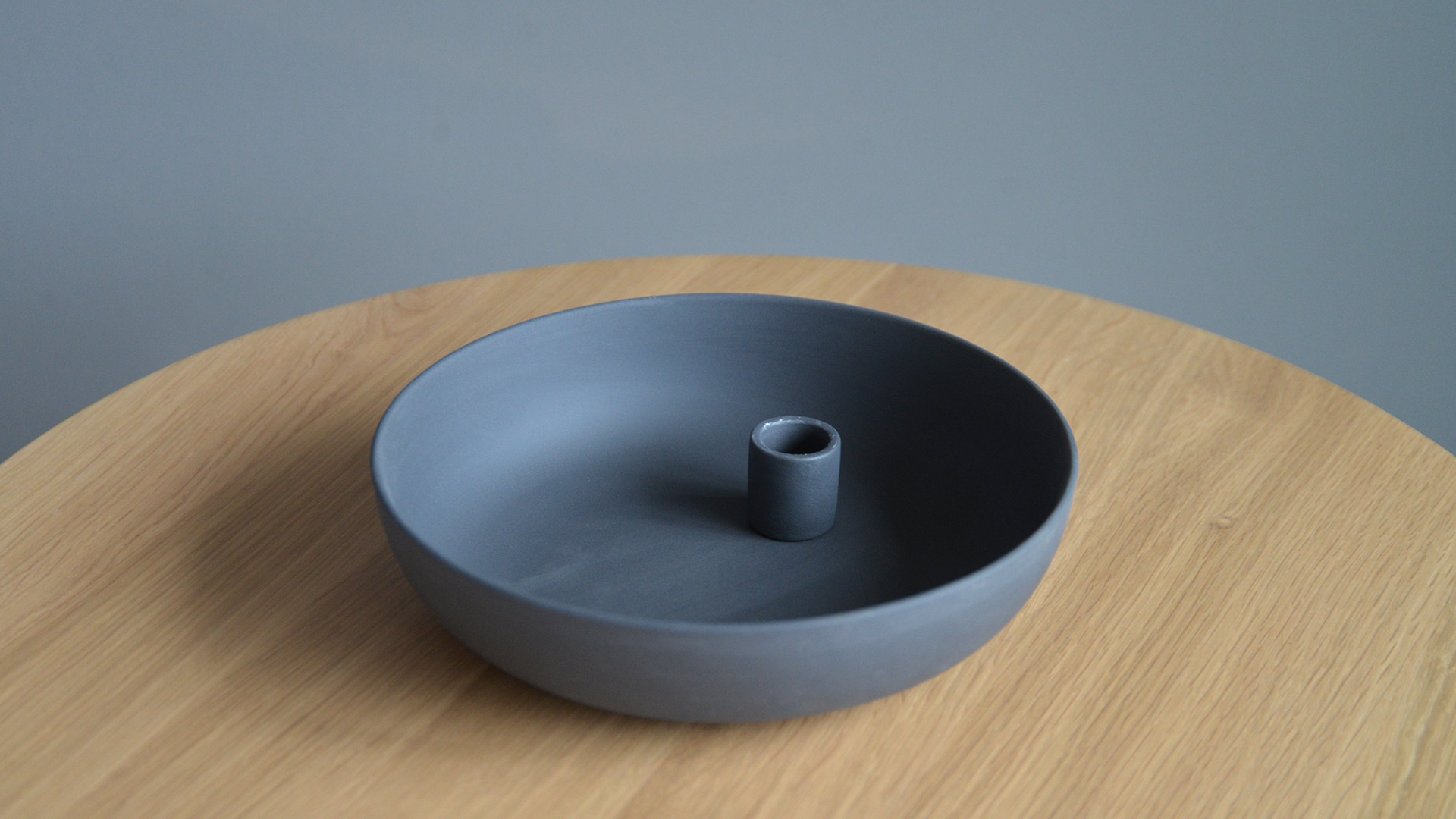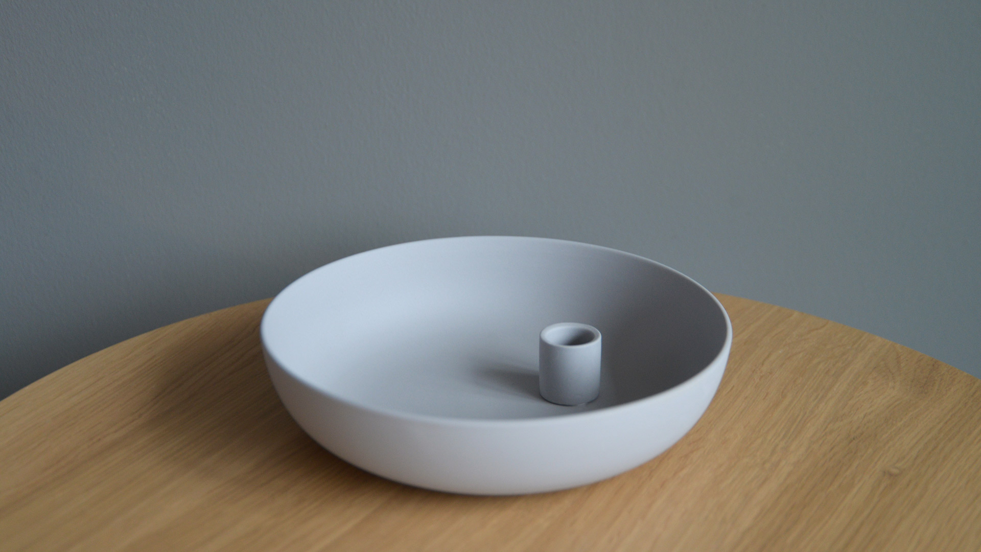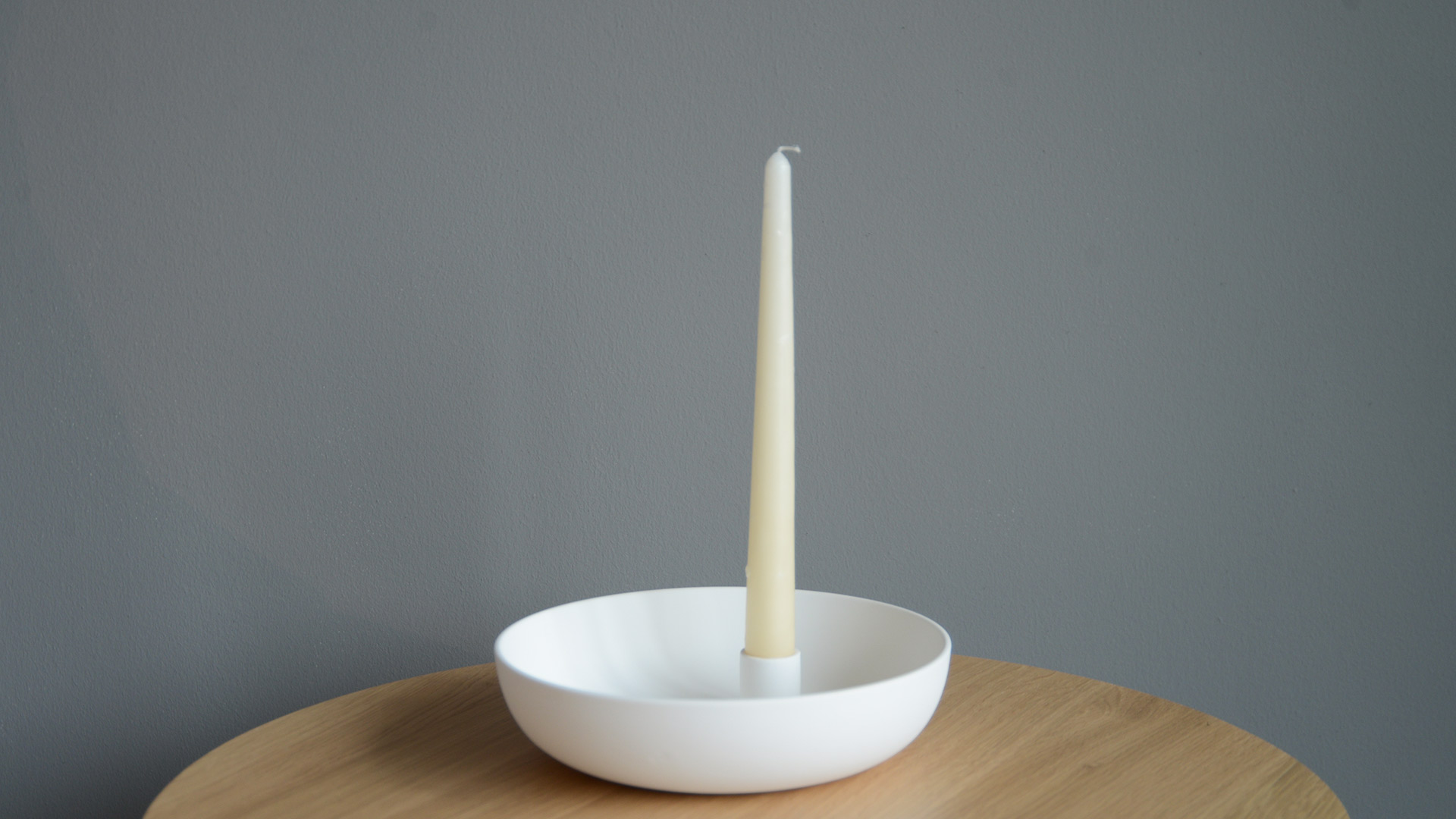 Beautiful modern candle holders in matt porcelain – coloured ivory, light grey or dark grey. The deep dish base provides a handy storage space or decorative container.