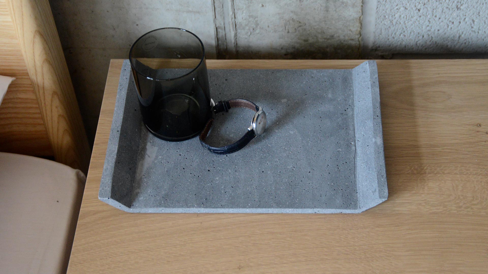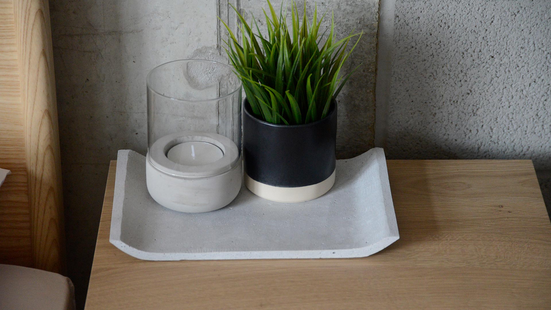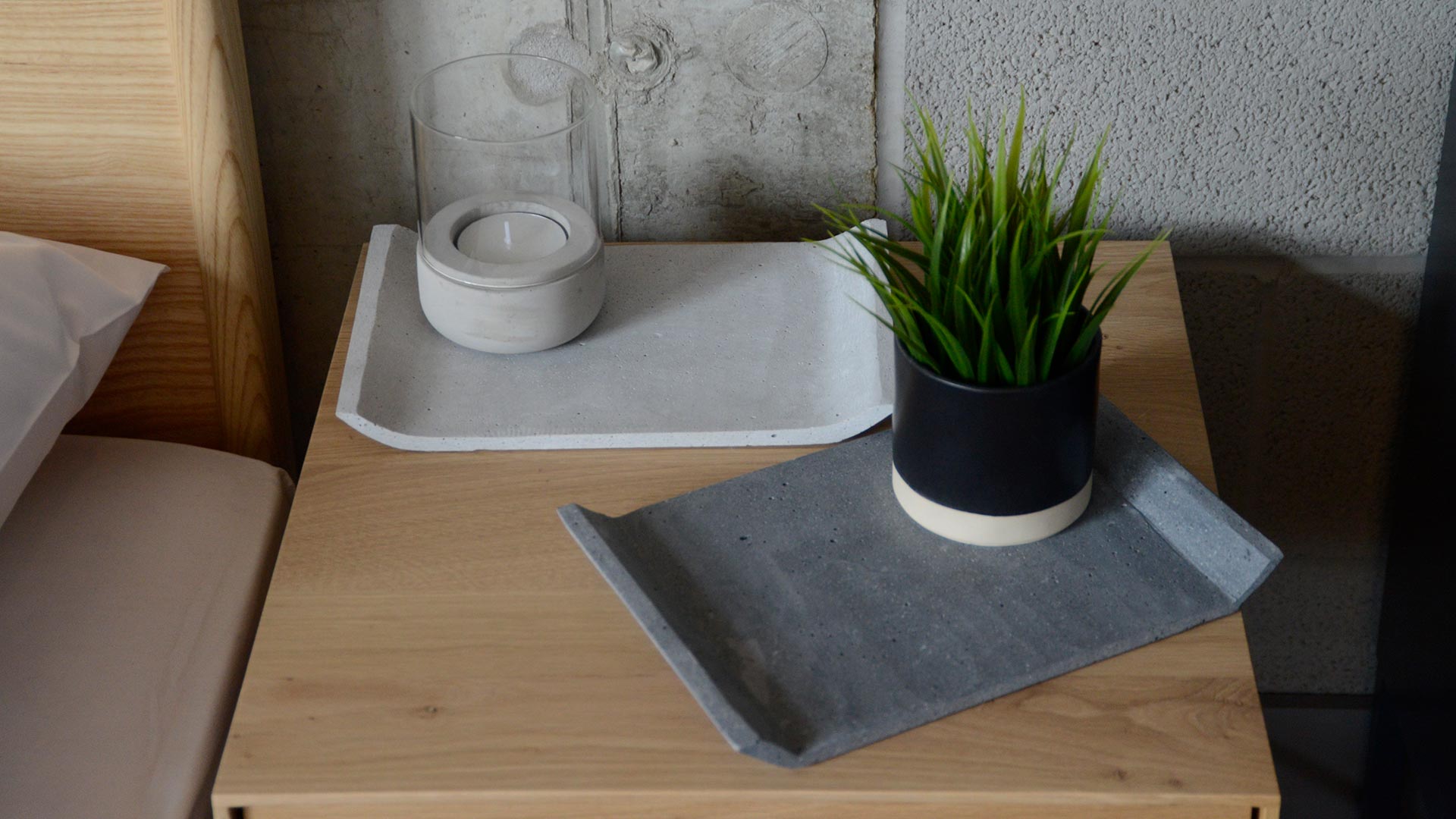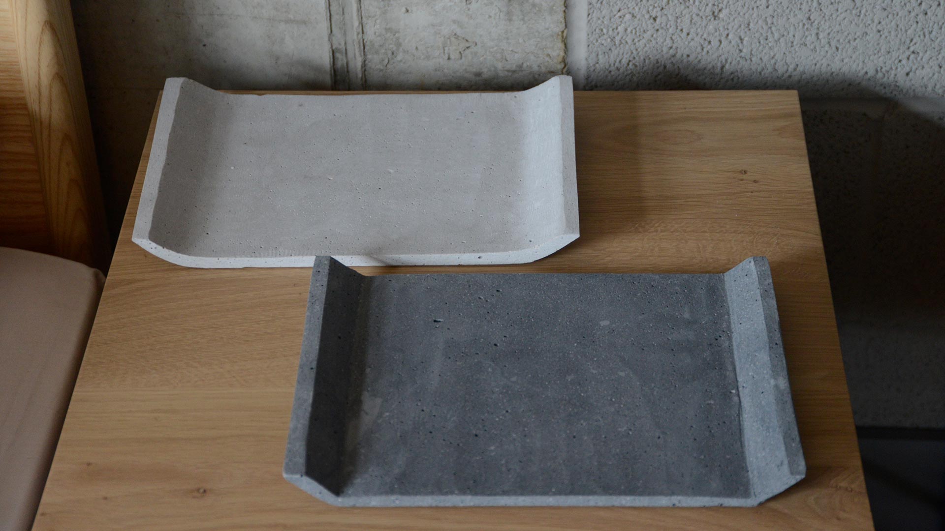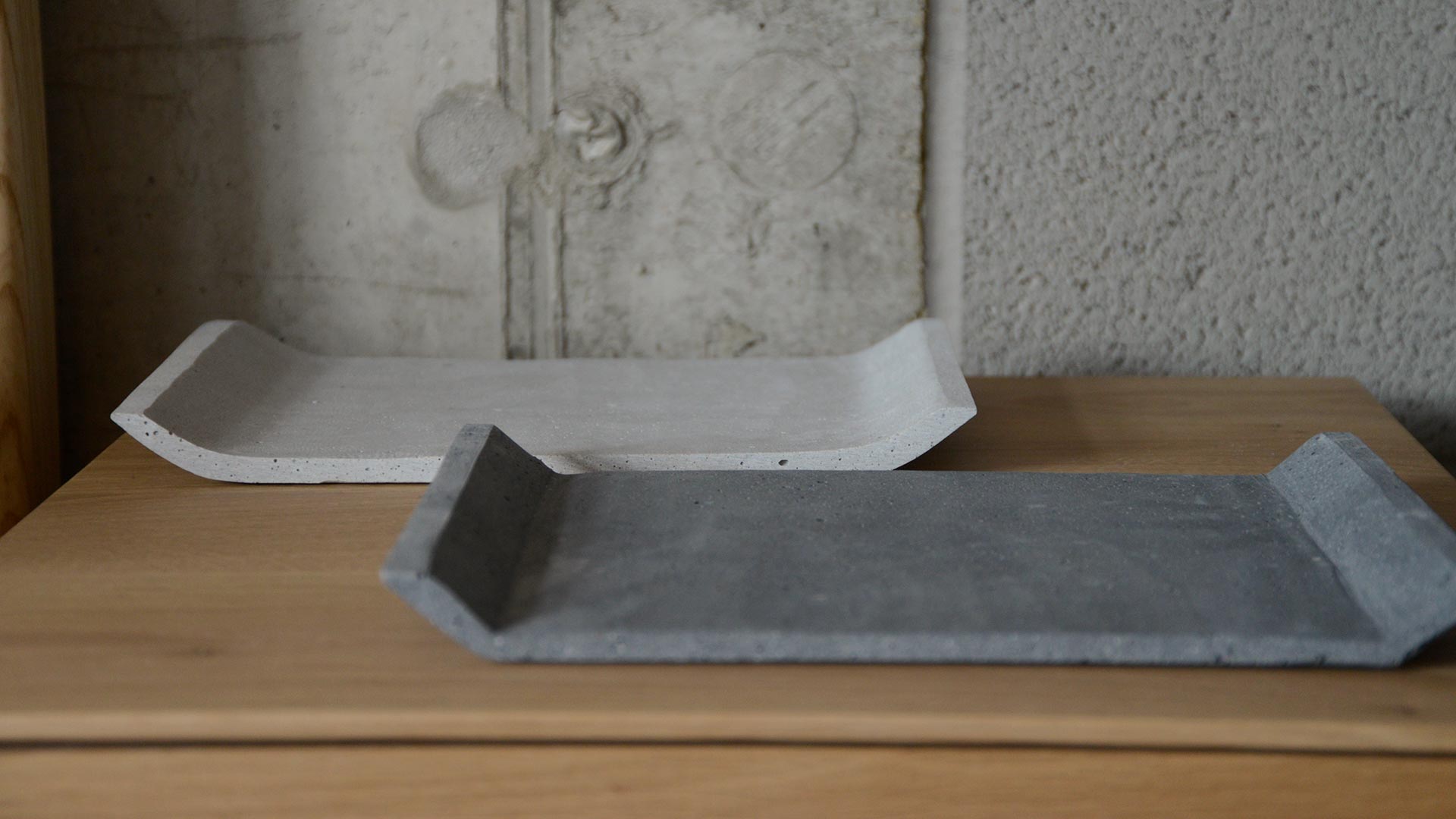 Modern concrete trays, a wide flat surface with the edges – to the two narrow sides – tilted upwards. These minimalist, useful trays are an elegant way to keep your surfaces tidy. Available in two colours: Light Grey or Dark Grey.