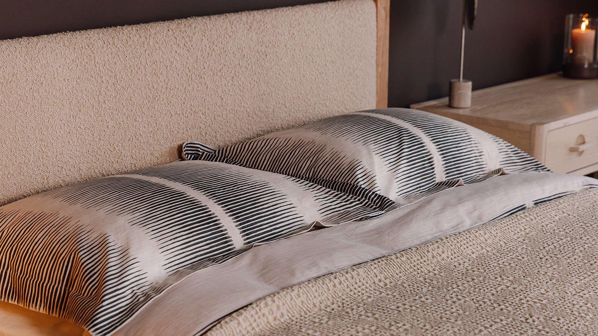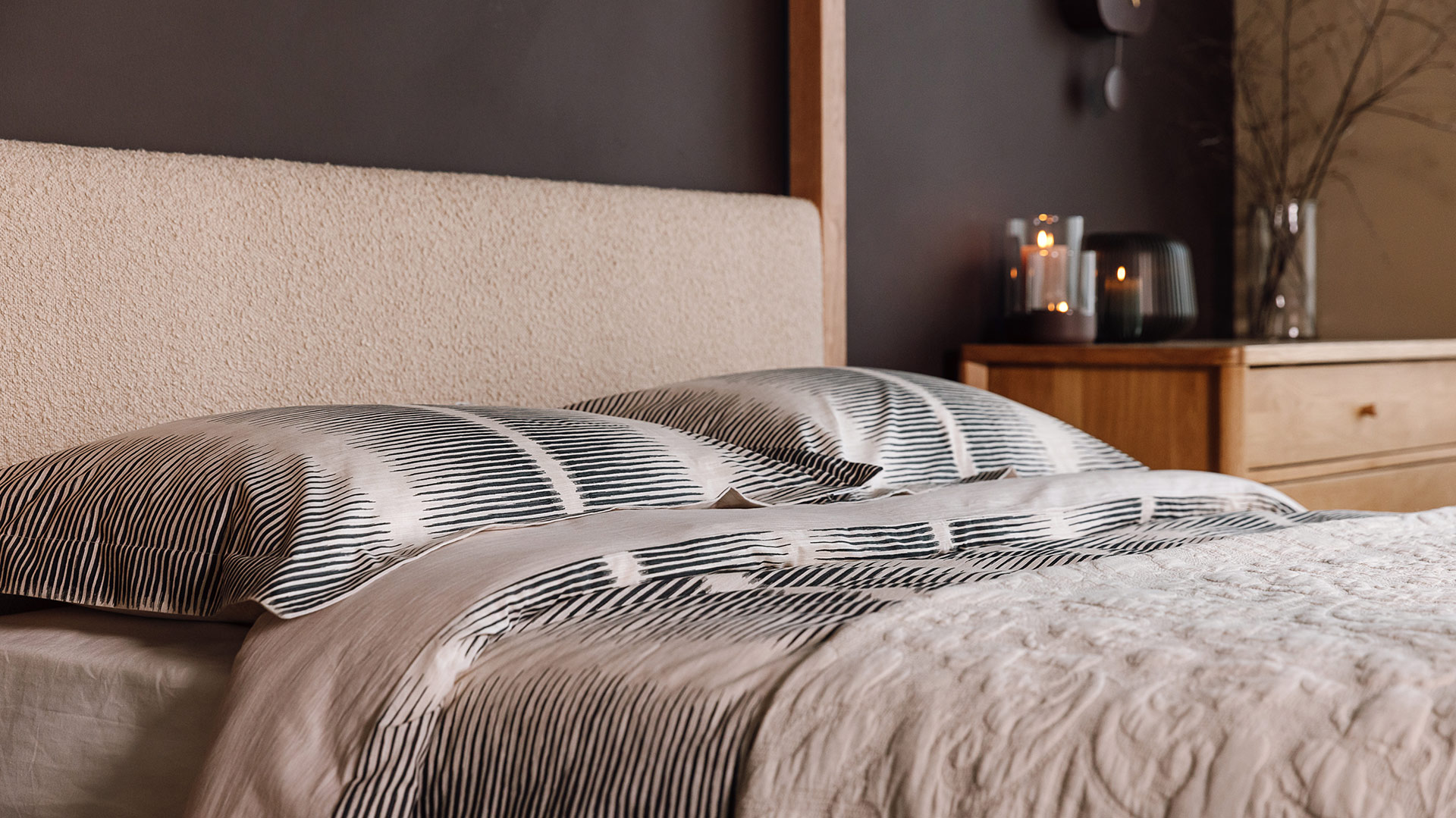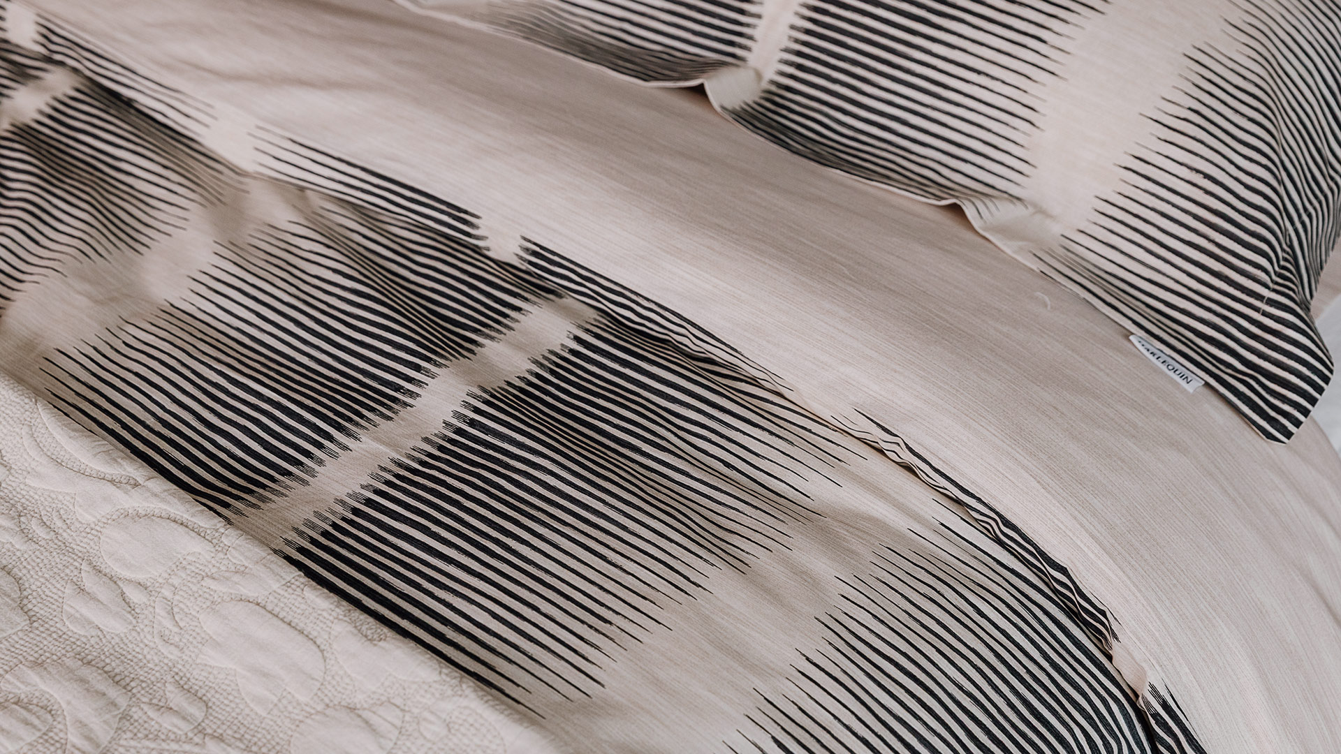 A contemporary cotton stripe duvet set with soft almost black inky stripes over a warm ecru packground. The combination of painted look, fine stripes stripes and classic plain cream reverse results in a contemporary, yet timeless bedding set. Perfect for a modern neutral bedroom look.