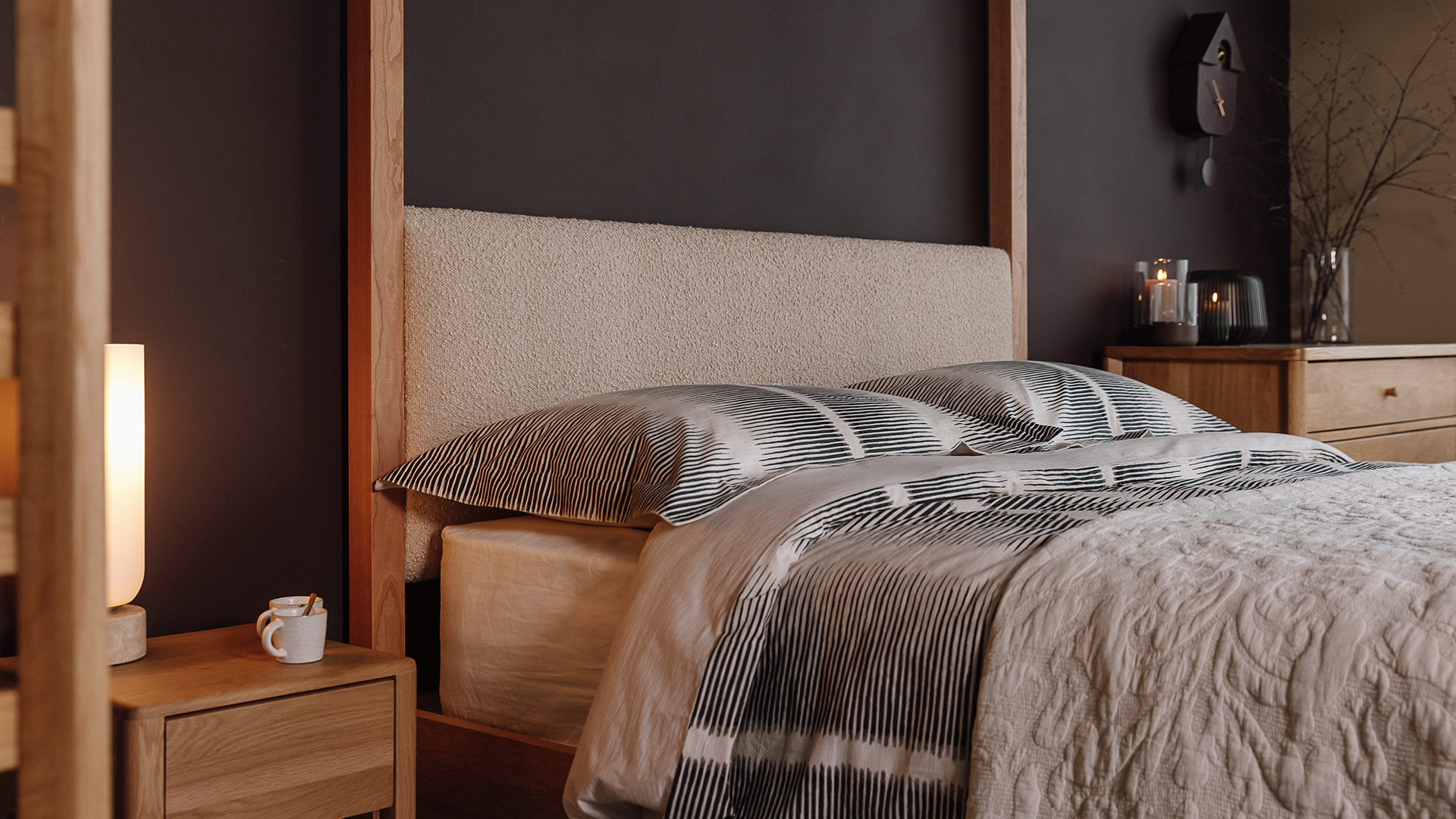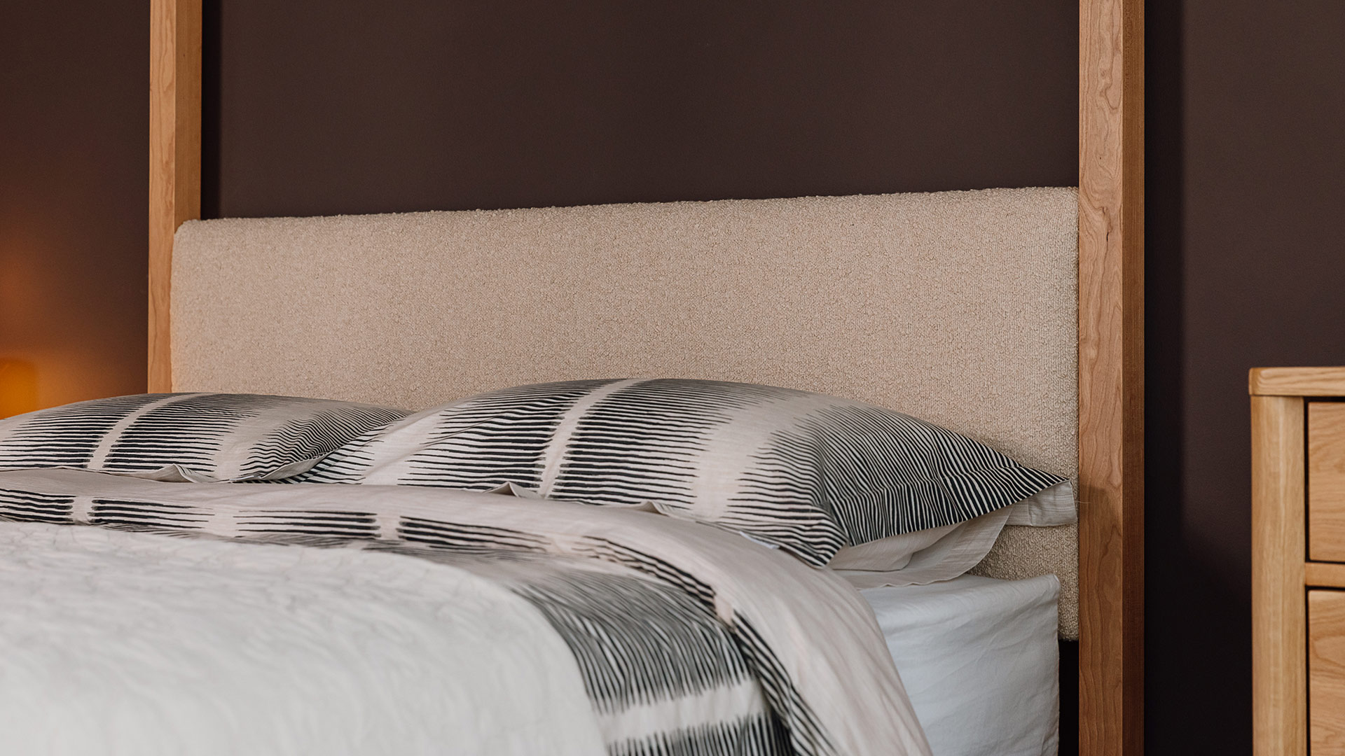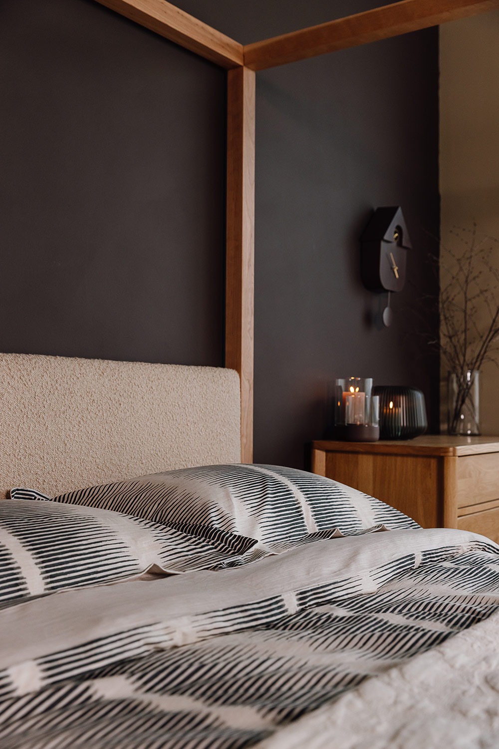 A contemporary cotton stripe duvet set with soft almost black inky stripes over a warm ecru packground. The combination of painted look, fine stripes stripes and classic plain cream reverse results in a contemporary, yet timeless bedding set. Perfect for a modern neutral bedroom look.
