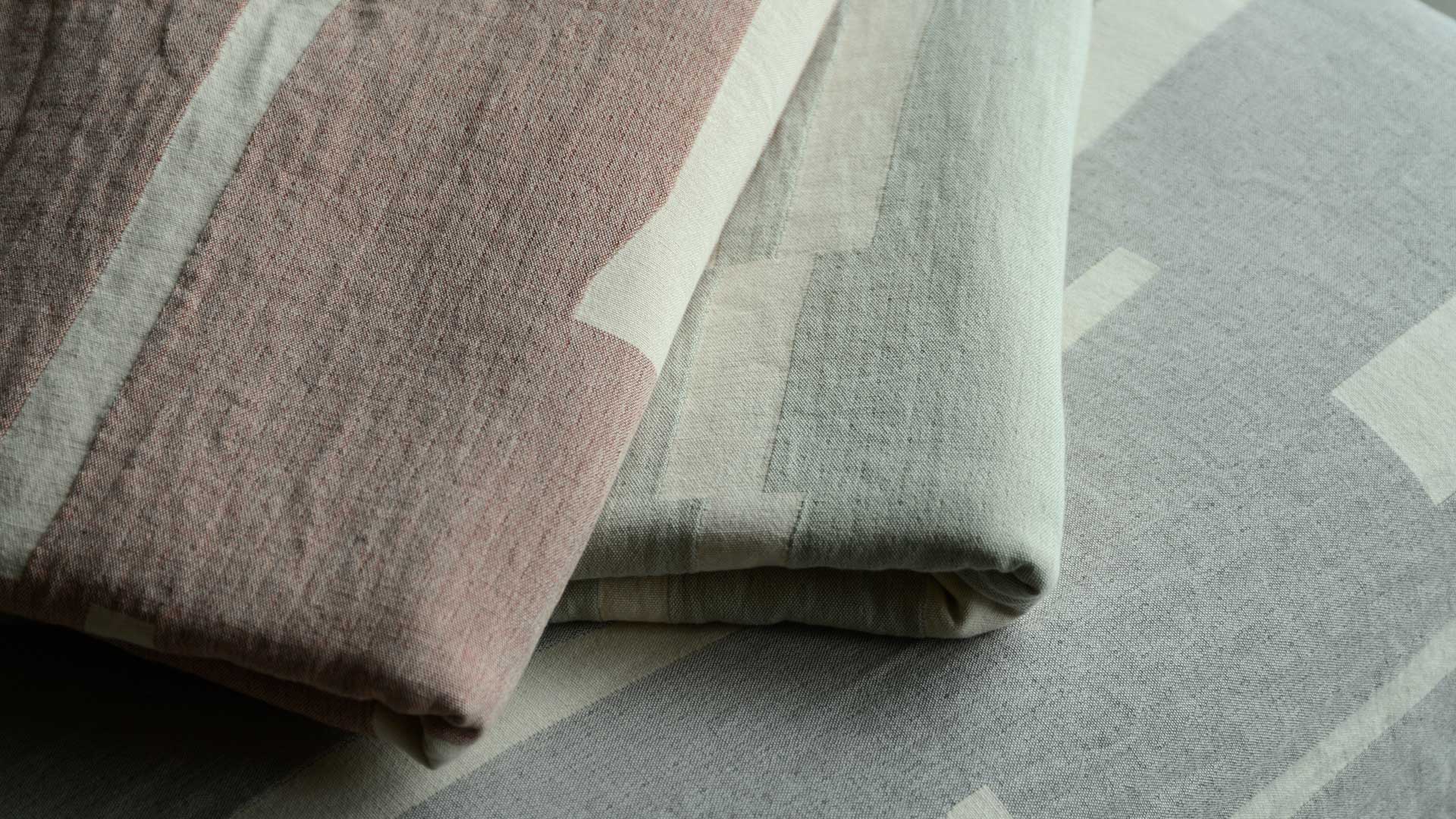 Organic cotton throws with a contemporary abstract stripe and block pattern. Available in mint green, light rust red, pale blue or light grey, all with an ivory pattern and ivory reverse.