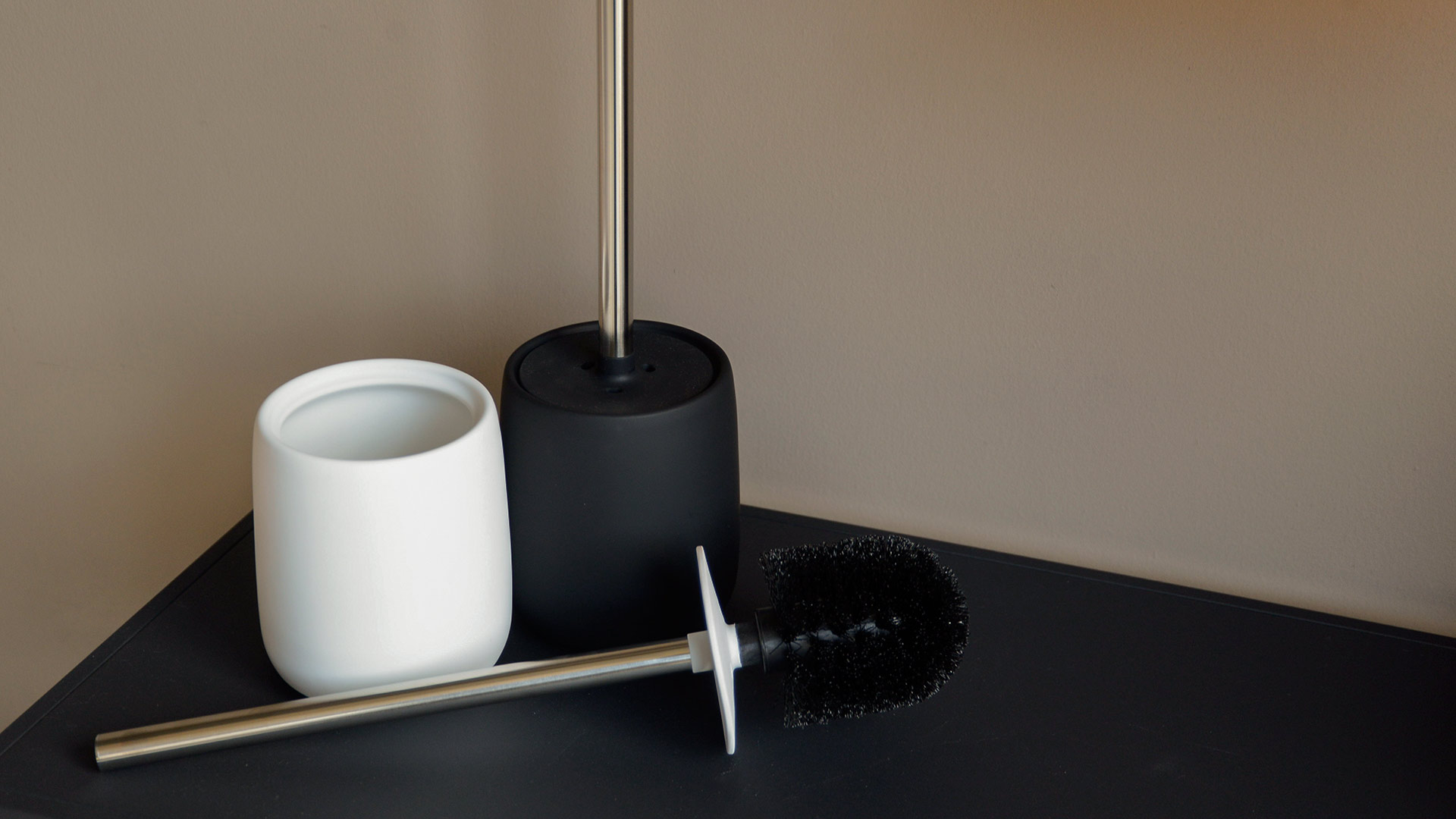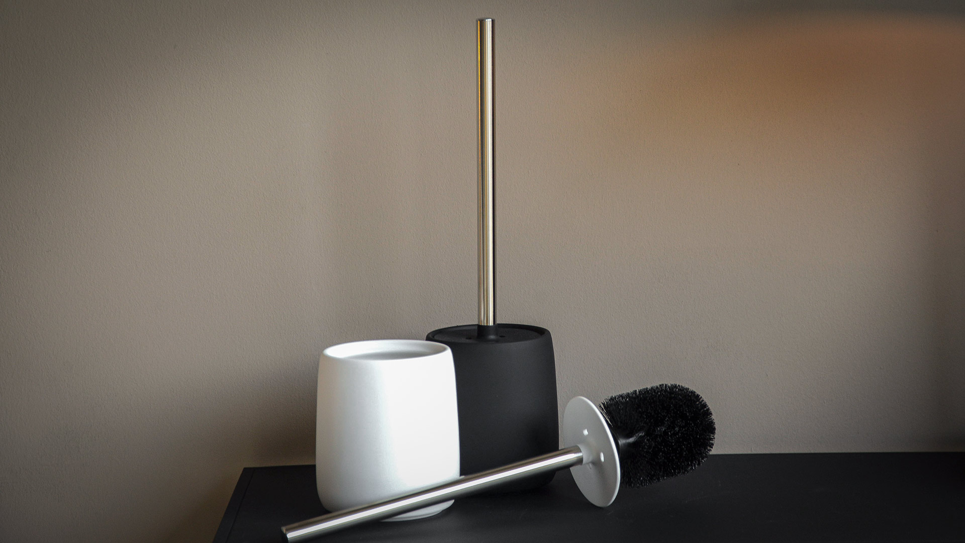 A stylish, modern toilet brush. Made of high-quality, polished stainless steel, the brush handle offers a metallic look to offset the neutral shades. The holder – available in either black, dark grey or white. Each colour has a matte, soft-touch surface. A soft integrated silicone lid on the handle covers the brush. On the inside, the holder is glazed and easy to clean.