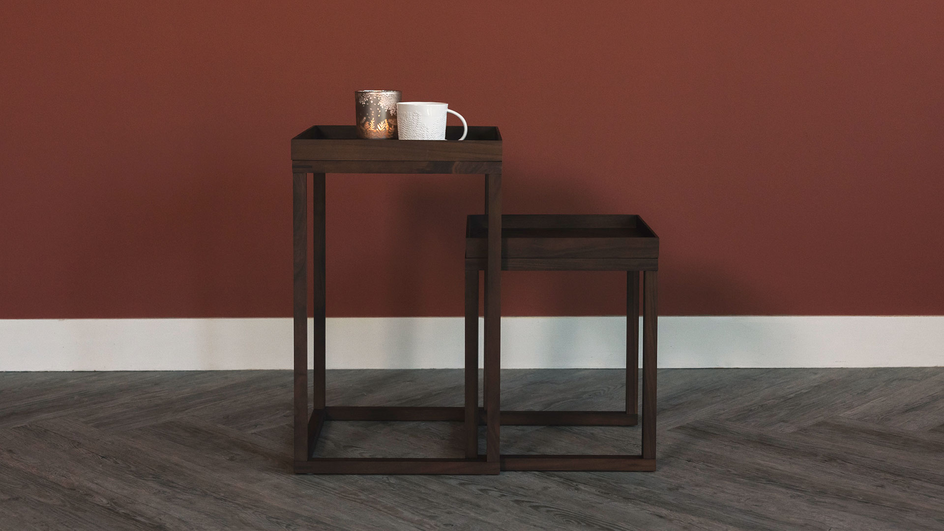 Stylish and environmentally conscious. A modern nest of tables, made with sustainably harvested, solid American walnut and walnut veneers. All edges are crisp and modern, but finely hand sanded to make them soft to the touch. The perfect addition to a living room or lounge; wherever you need a bit of extra table space.